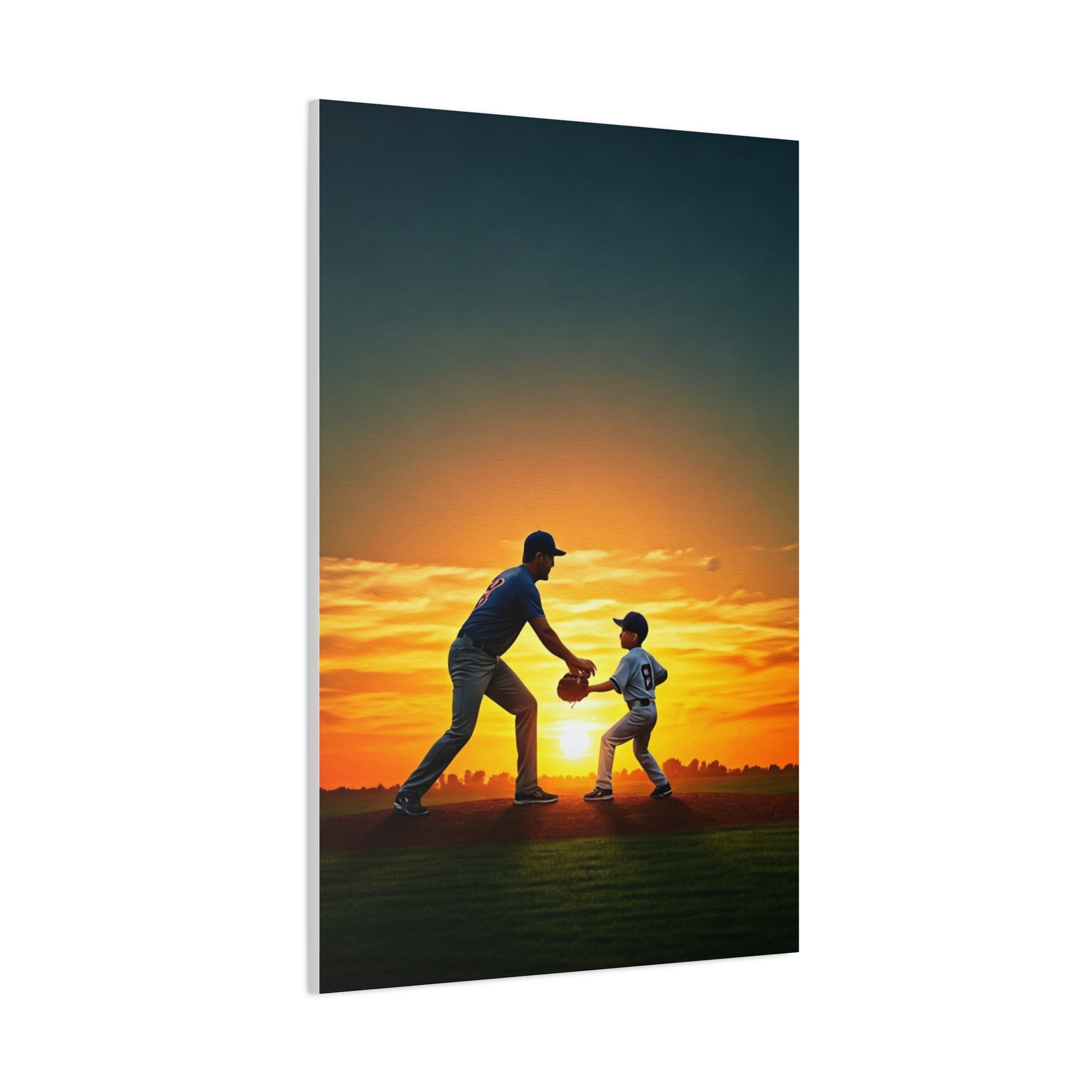 A touching silhouette scene of a parent and child sharing a baseball moment at sunset. This artwork celebrates family, sport, and unforgettable memories, making it ideal for warm home décor.