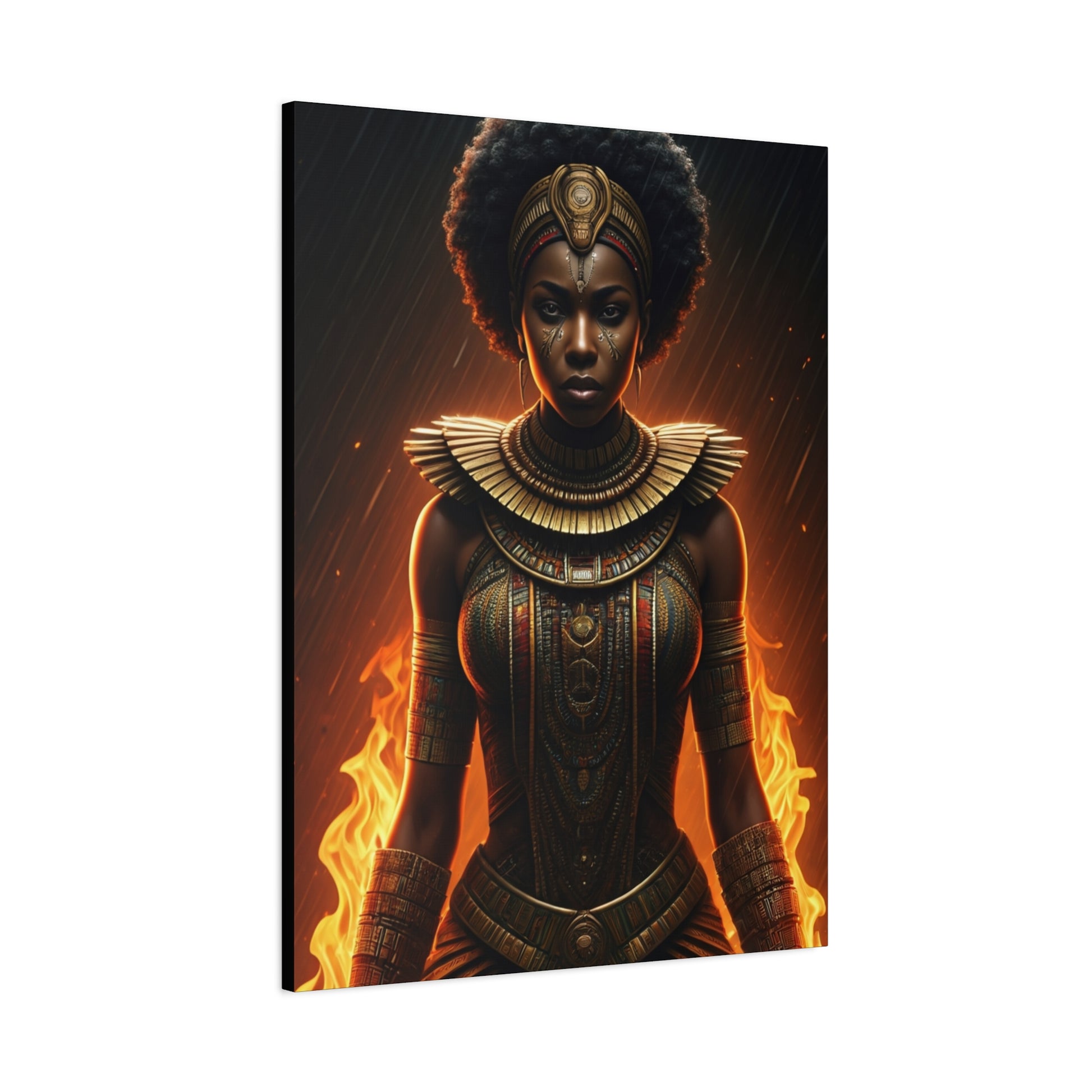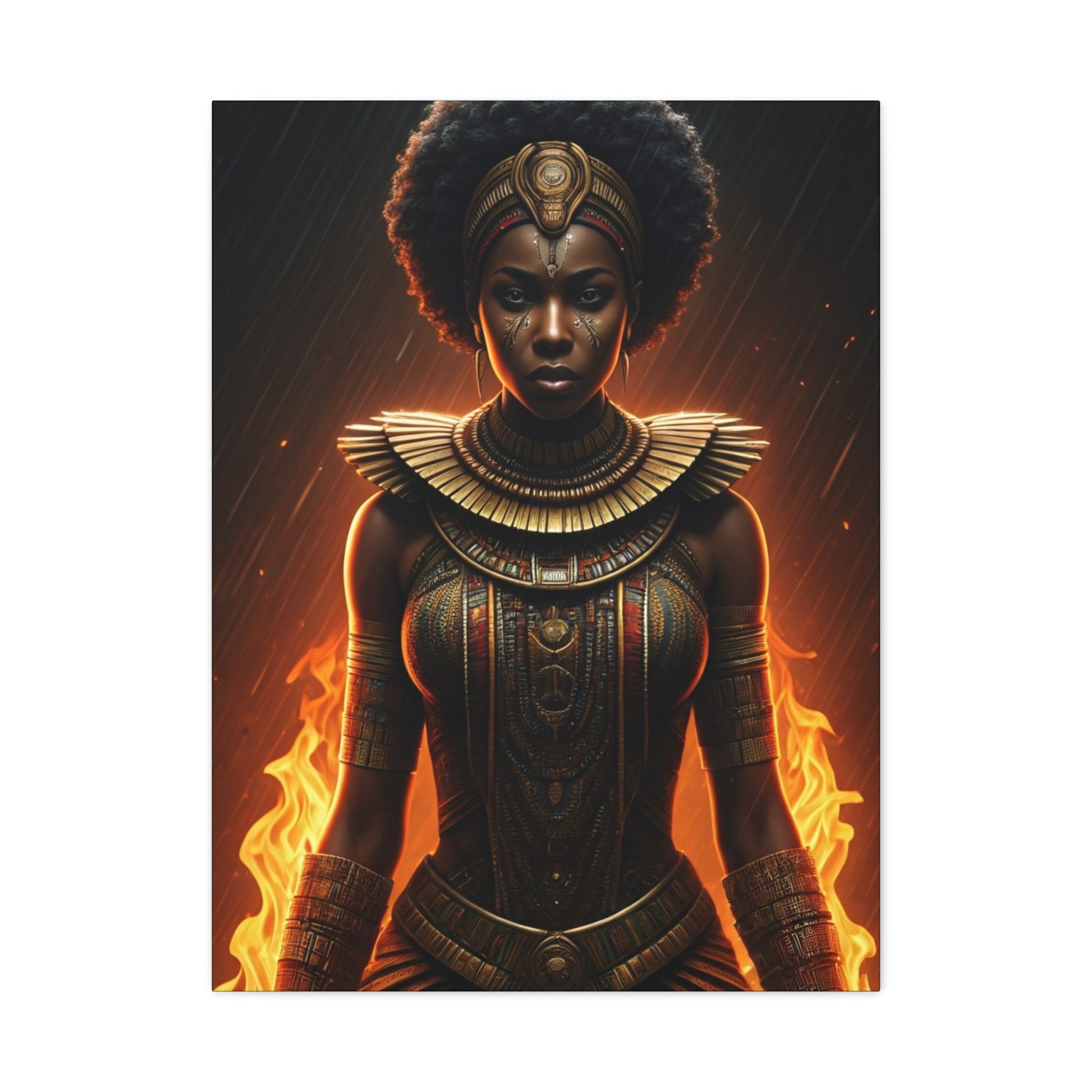 This striking artwork showcases a fierce African warrior queen surrounded by fiery energy and regal adornment. The intense lighting and powerful expression evoke strength, protection, and unstoppable spirit. Perfect for statement wall décor, this piece brings warmth, empowerment, and dramatic presence into modern living spaces or creative interiors.