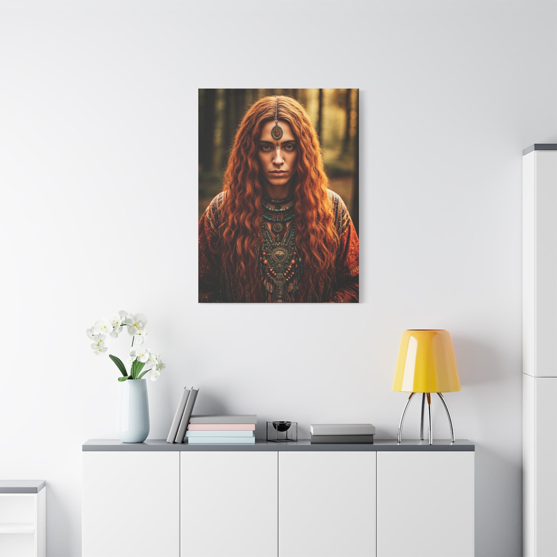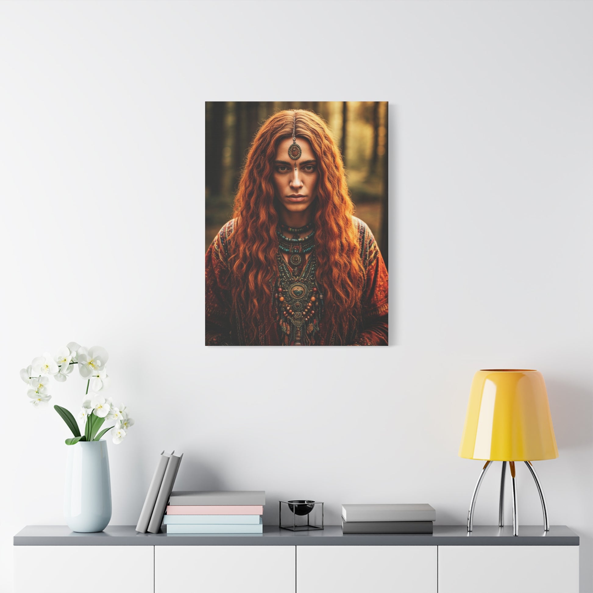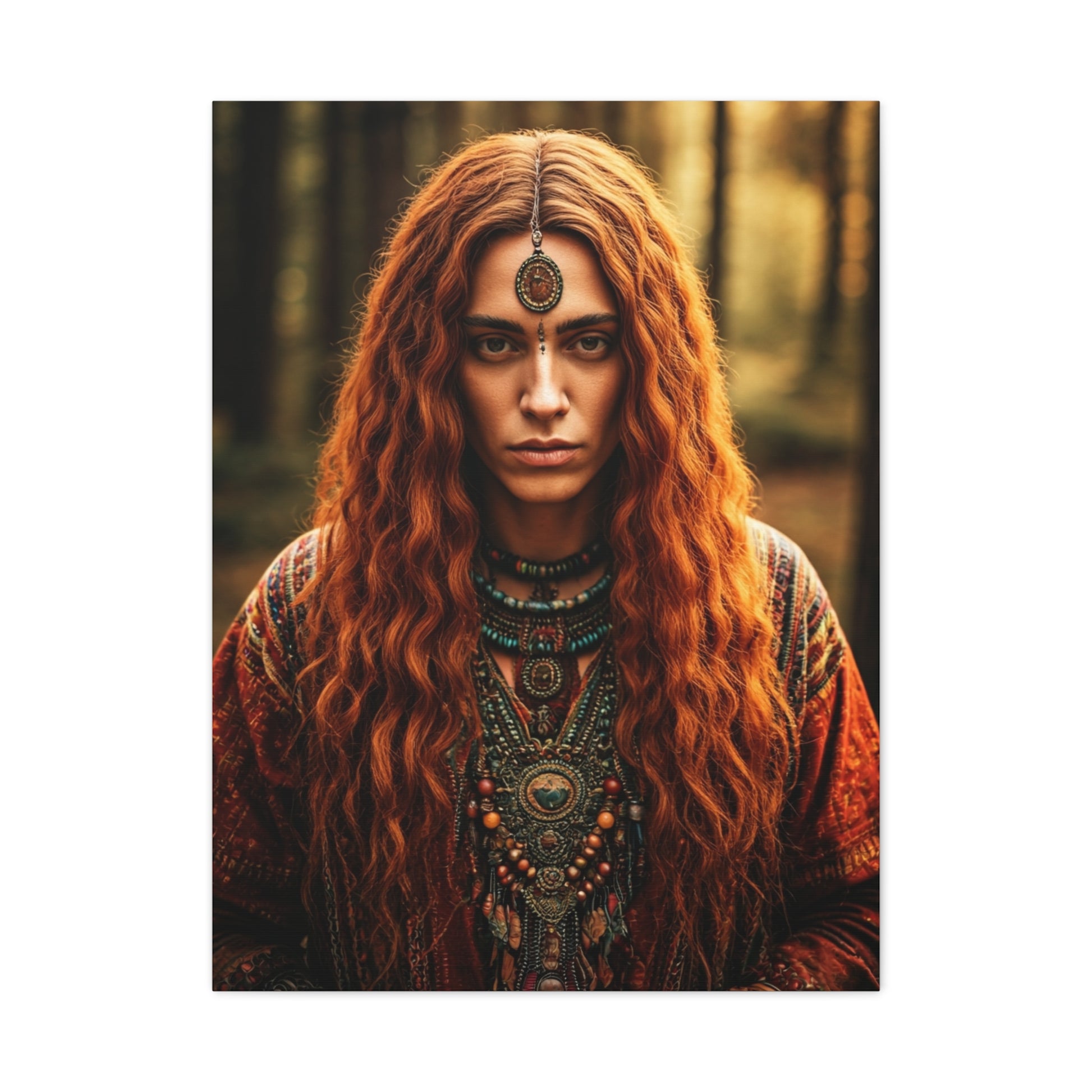 A deeply expressive bohemian portrait set within a quiet forest, this artwork radiates mystery and ancestral energy. The subject’s flowing copper hair, layered jewelry, and symbolic adornments reflect ancient wisdom and spiritual depth. Soft natural light filters through the trees, enhancing the earthy palette and intimate mood. Every detail tells a story of intuition, strength, and connection to nature. Ideal for bohemian, rustic, or spiritual spaces seeking emotional depth and visual storytelling.