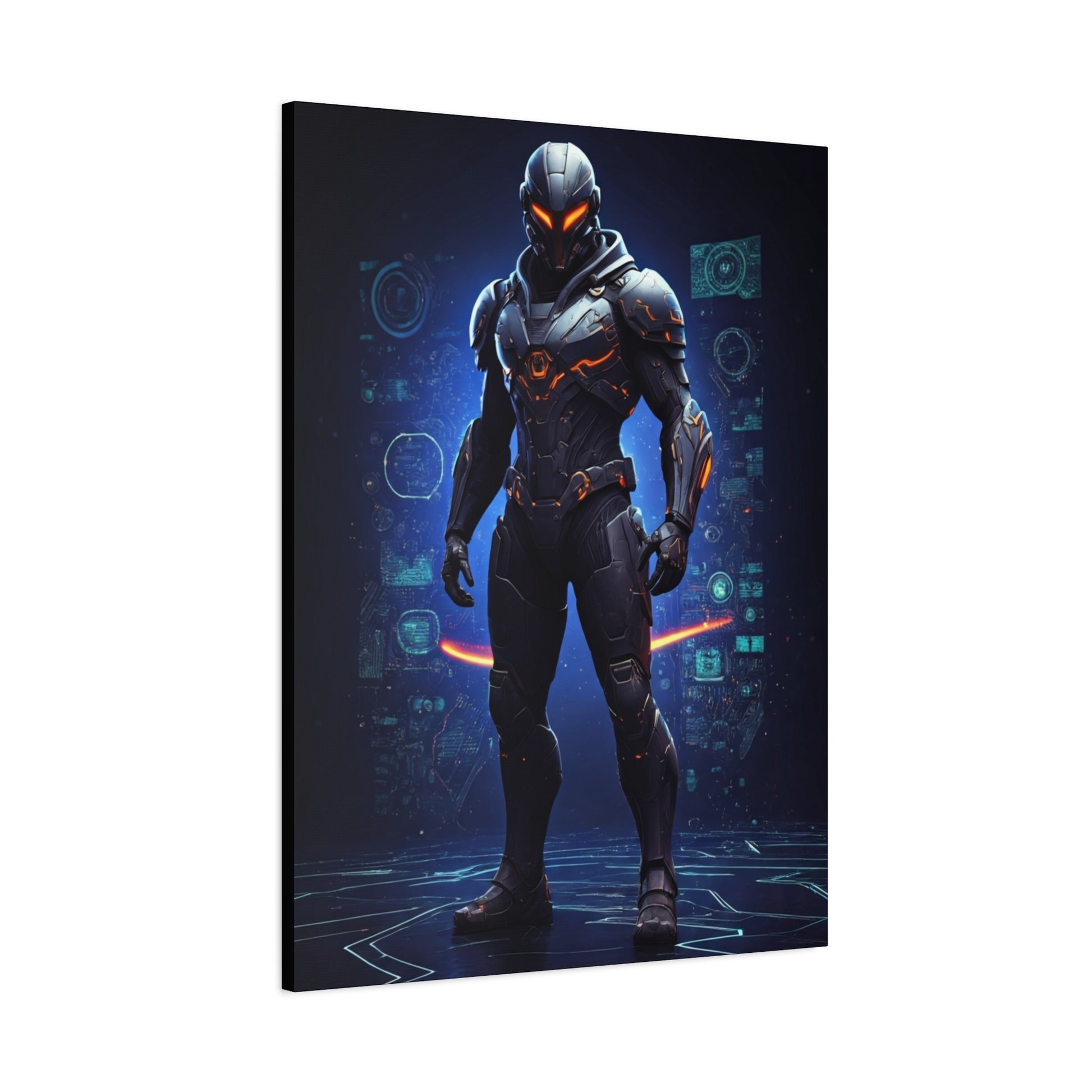 This striking wall art presents a futuristic armored figure standing confidently against a backdrop of glowing digital interfaces and holographic elements. The sleek armor design and cool-toned lighting create a strong sci-fi atmosphere, symbolizing technology, strength, and innovation. The composition feels cinematic and powerful, making it an ideal centerpiece for game rooms, offices, or modern interiors. This canvas print brings a bold futuristic edge that celebrates imagination and advanced design.