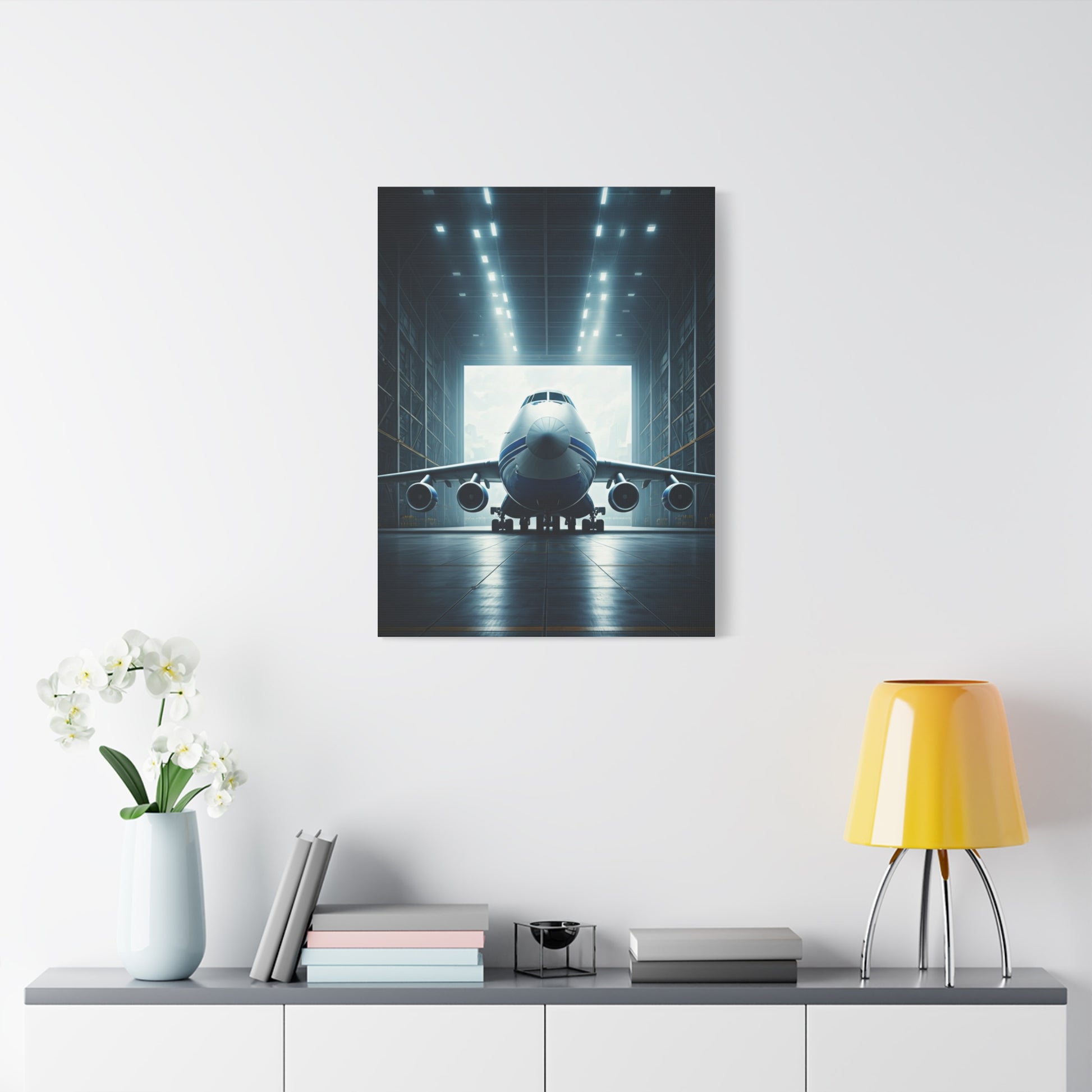 This dramatic wall art showcases a massive aircraft resting inside a towering futuristic hangar, illuminated by bold cinematic lighting. The sleek engineering and commanding atmosphere evoke strength, innovation, and modern aviation excellence, making it an ideal centerpiece for offices, studios, or aircraft enthusiasts.