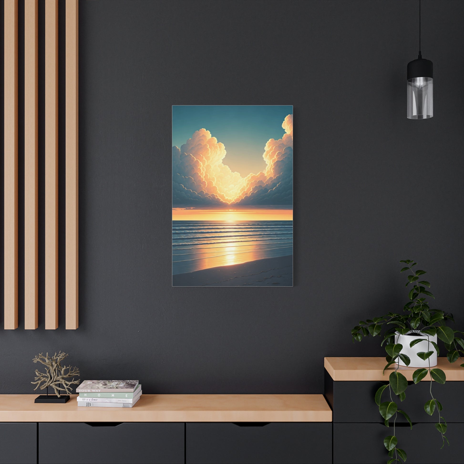 A dramatic sunset seascape with radiant golden light breaking through towering clouds above gentle rolling waves. The glowing reflections create a warm, emotional atmosphere perfect for statement wall décor.
