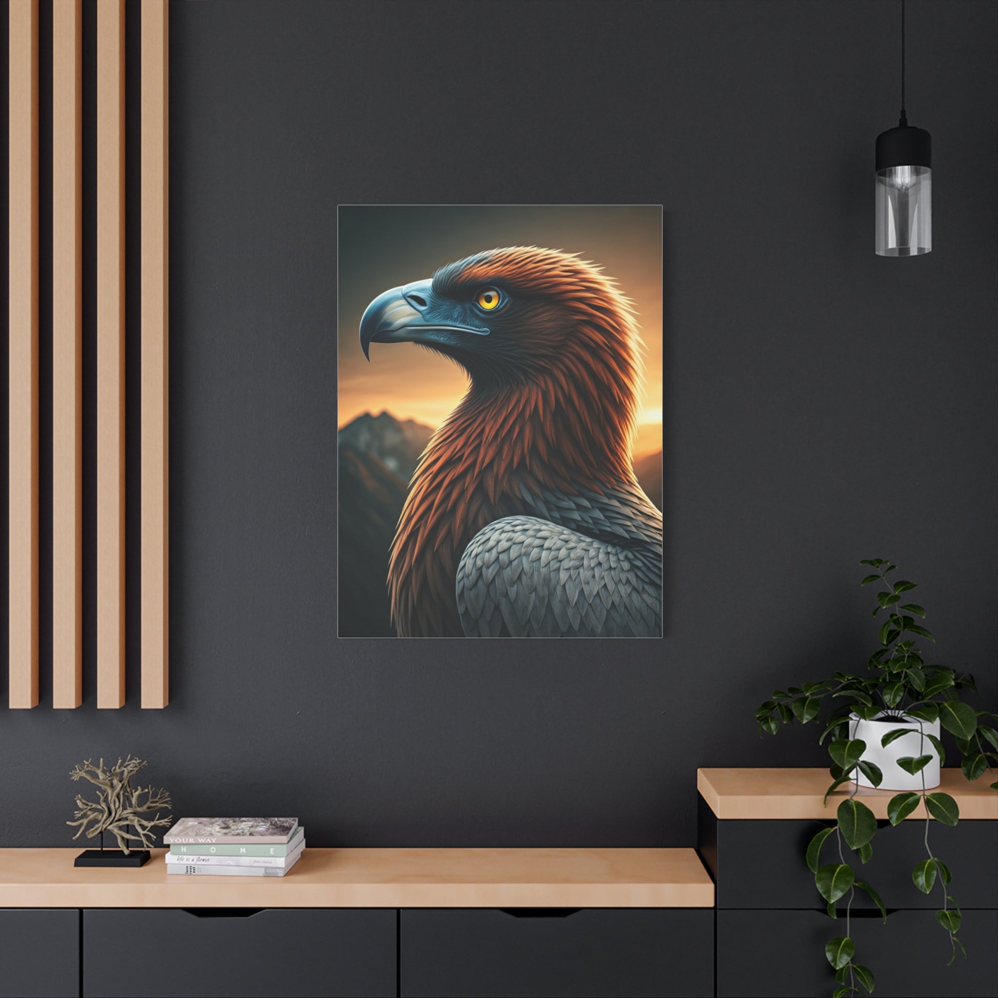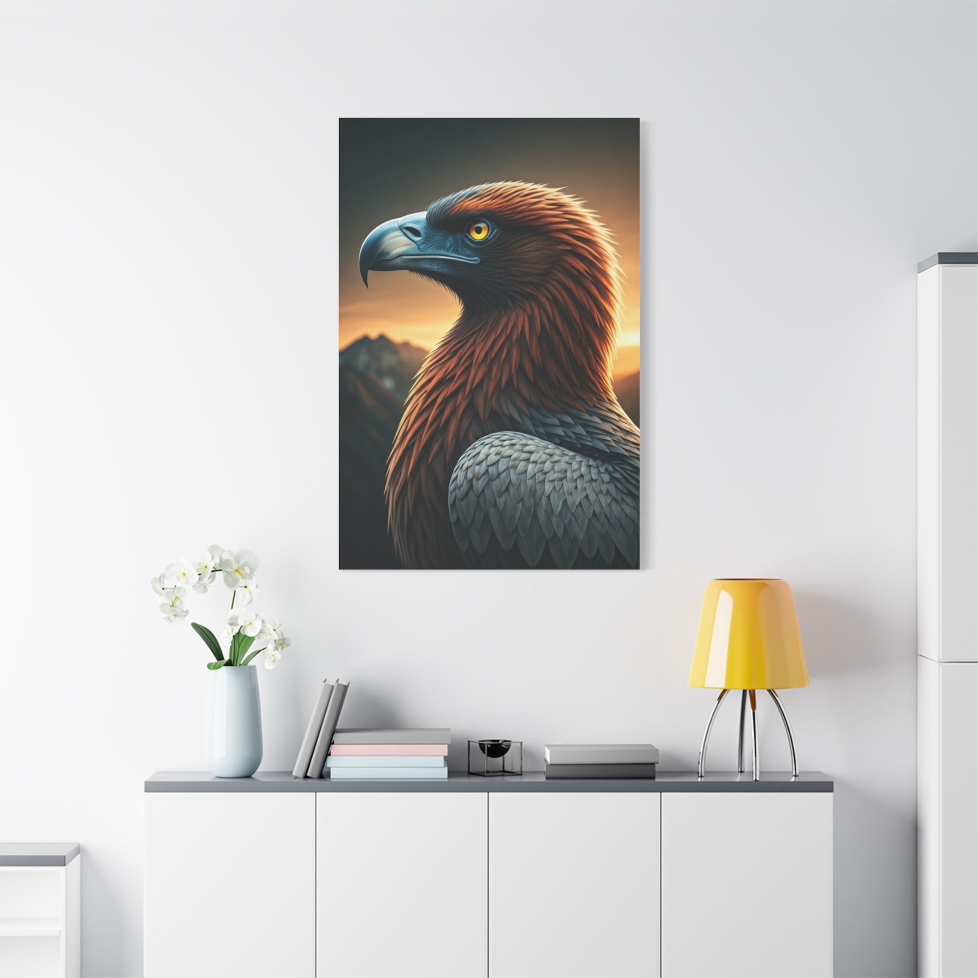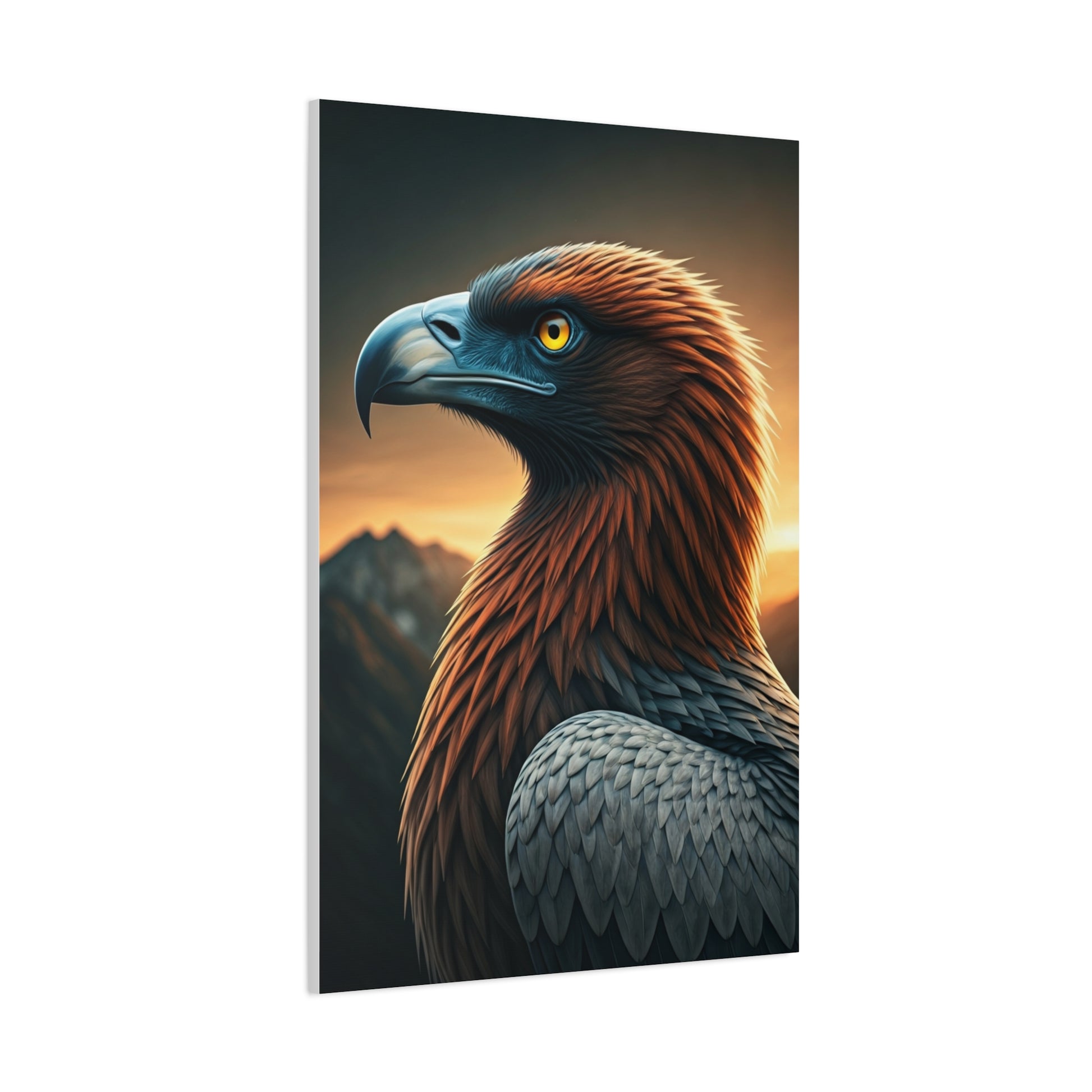 This majestic Golden Eagle portrait captures the powerful bird standing proudly against a dramatic mountain sunset backdrop. Warm golden light illuminates its layered feathers, highlighting rich brown and silver tones while distant peaks fade into the evening sky. The intense amber eye and strong curved beak convey strength, vigilance, and untamed wilderness. Perfect for nature-inspired interiors, offices, cabins, or statement walls, this artwork brings a bold yet refined presence to any space. A striking tribute to freedom, power, and the grandeur of mountain landscapes.