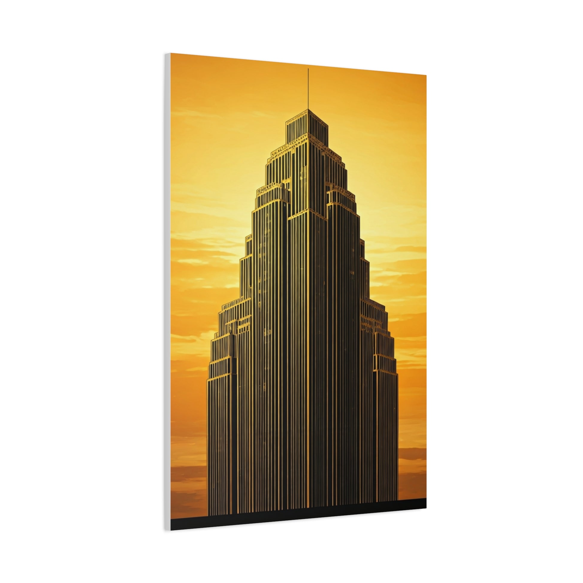 A stunning skyscraper portrait bathed in warm golden sunset tones, blending Art Deco elegance with modern city sophistication. This radiant architectural artwork brings ambition, luxury, and cinematic atmosphere to your space, perfect for living rooms, offices, entryways, or anyone inspired by iconic city skylines.