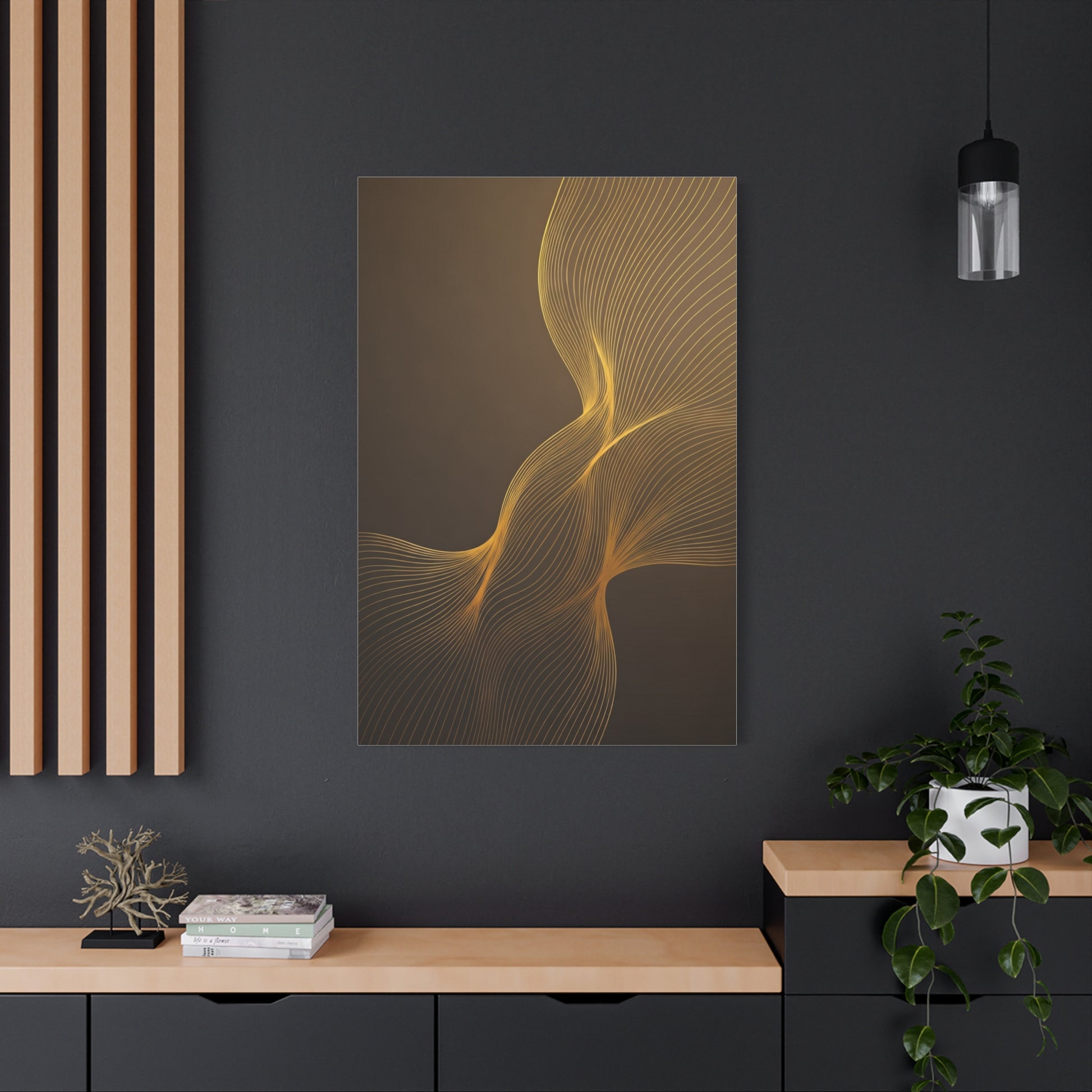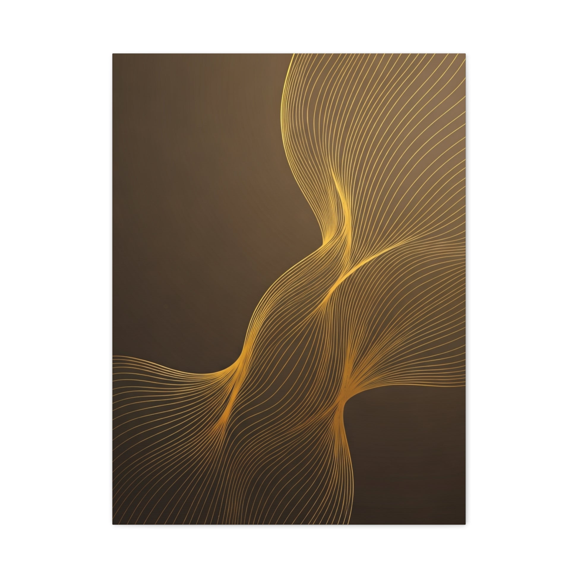 This contemporary abstract artwork features delicate golden lines flowing across a deep neutral background, creating movement and luminous depth. The fine layered curves add sophistication while maintaining minimalist elegance. Ideal for luxury interiors, offices, or statement walls seeking warmth and refined contrast.