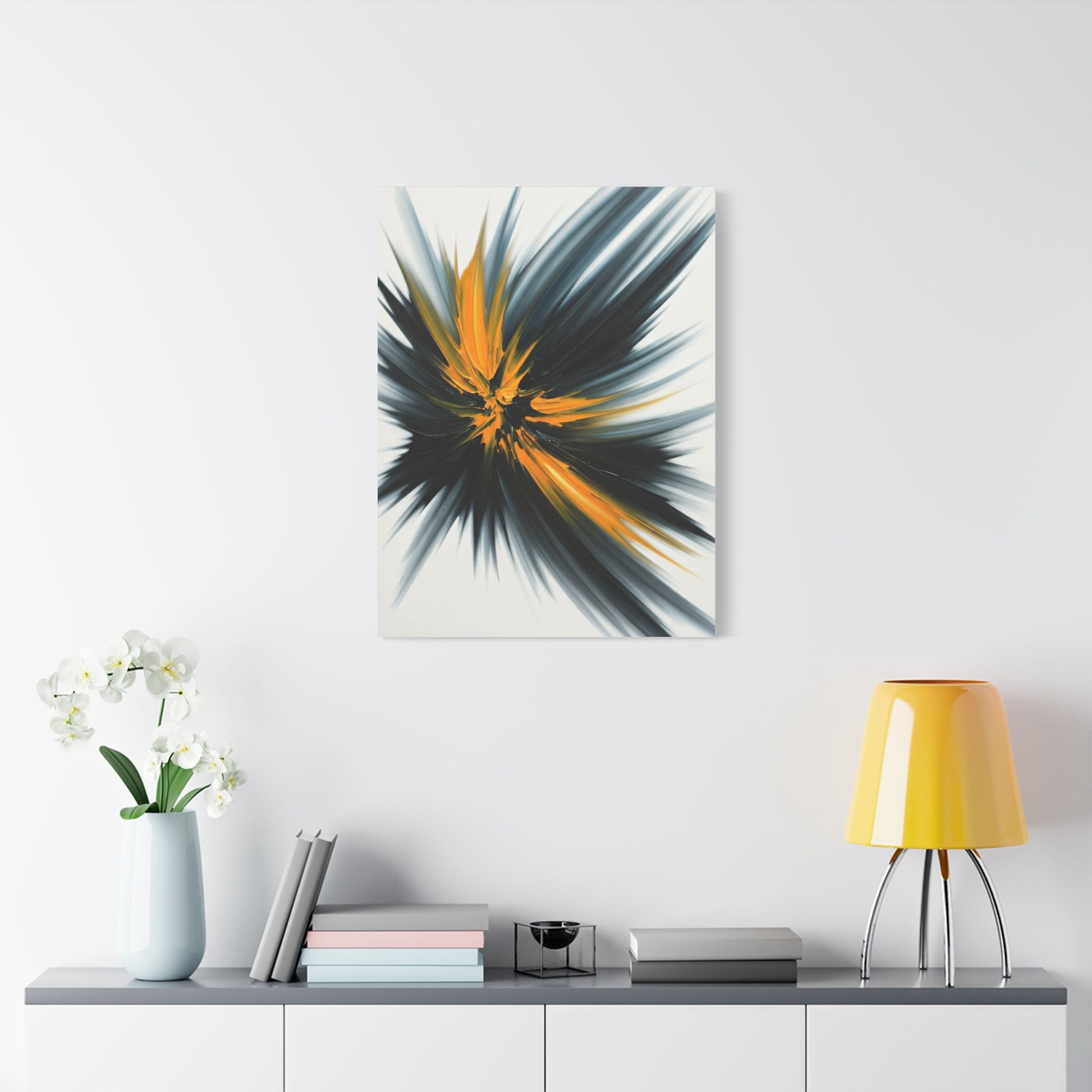 Golden Impact Burst showcases a dramatic explosion of sharp black and white strokes pierced by radiant gold accents. The energetic outward motion creates a bold visual statement, symbolising power, momentum, and creative force. Ideal for modern interiors, statement walls, and spaces that demand strong visual presence.
