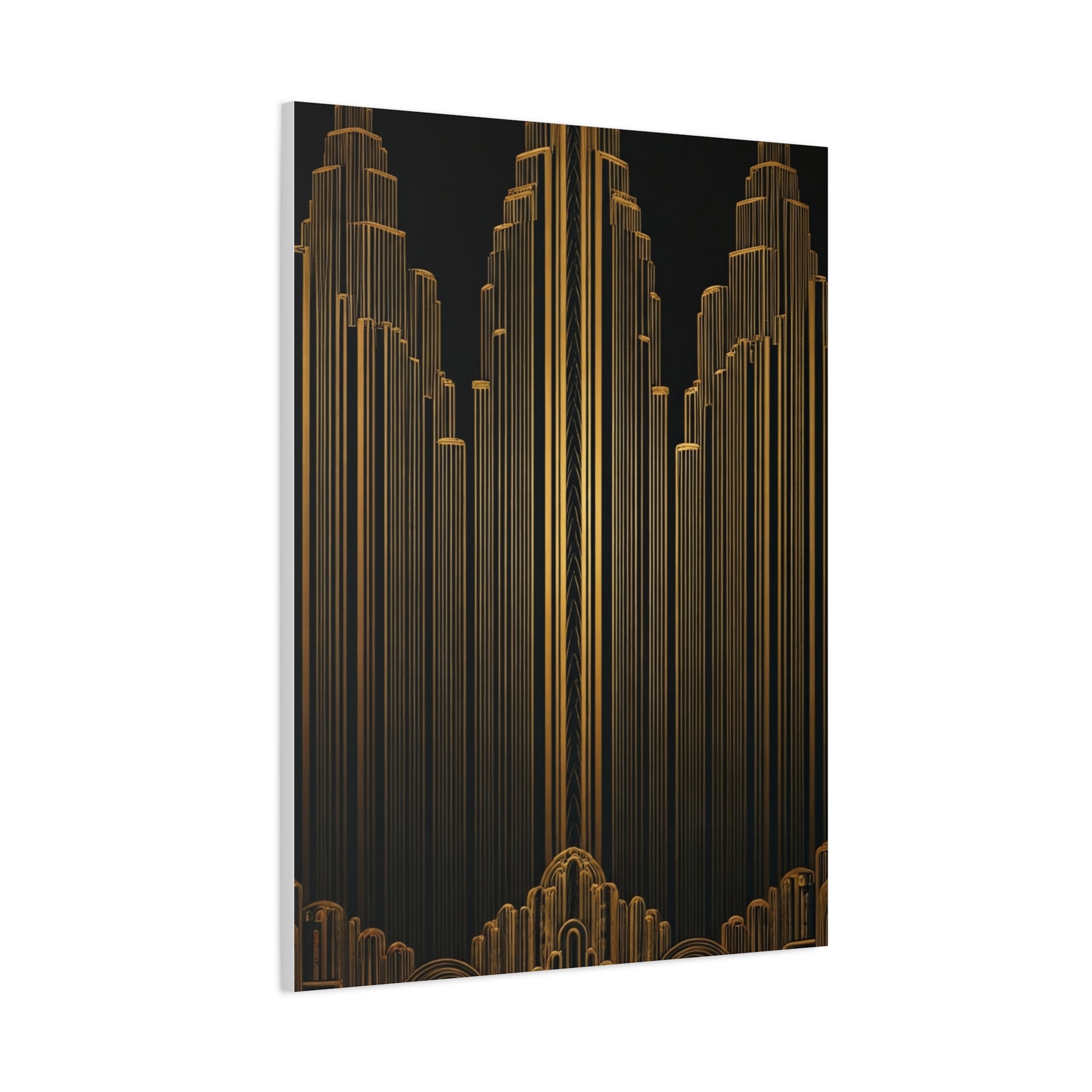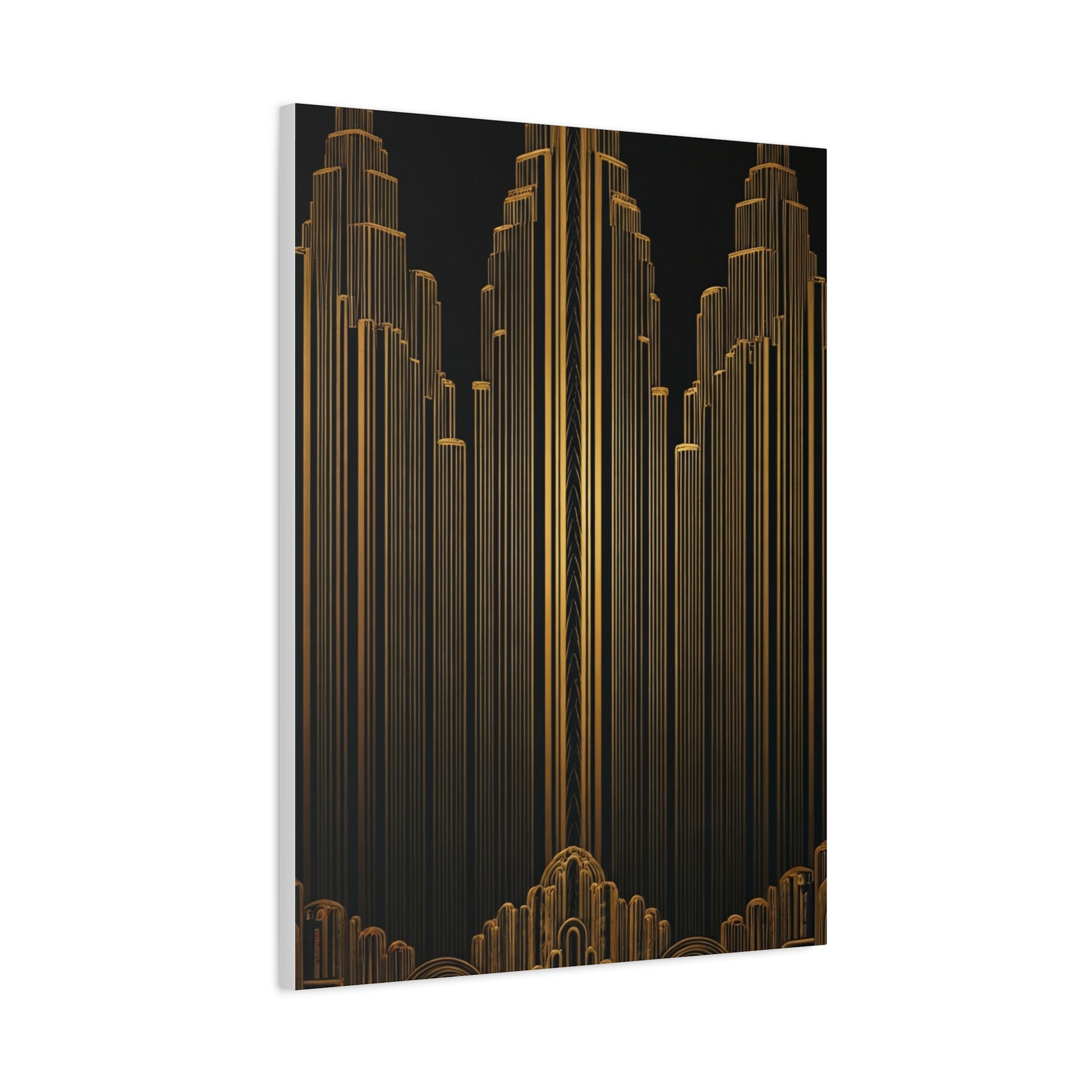 This elegant Art Deco skyscraper wall art captures a symmetrical cityscape of shimmering gold towers rising into a dark, atmospheric horizon. The geometric design and refined metallic tones create a timeless sense of grandeur, perfect for upscale interiors, modern décor themes, or anyone drawn to classic 1920s architectural style.