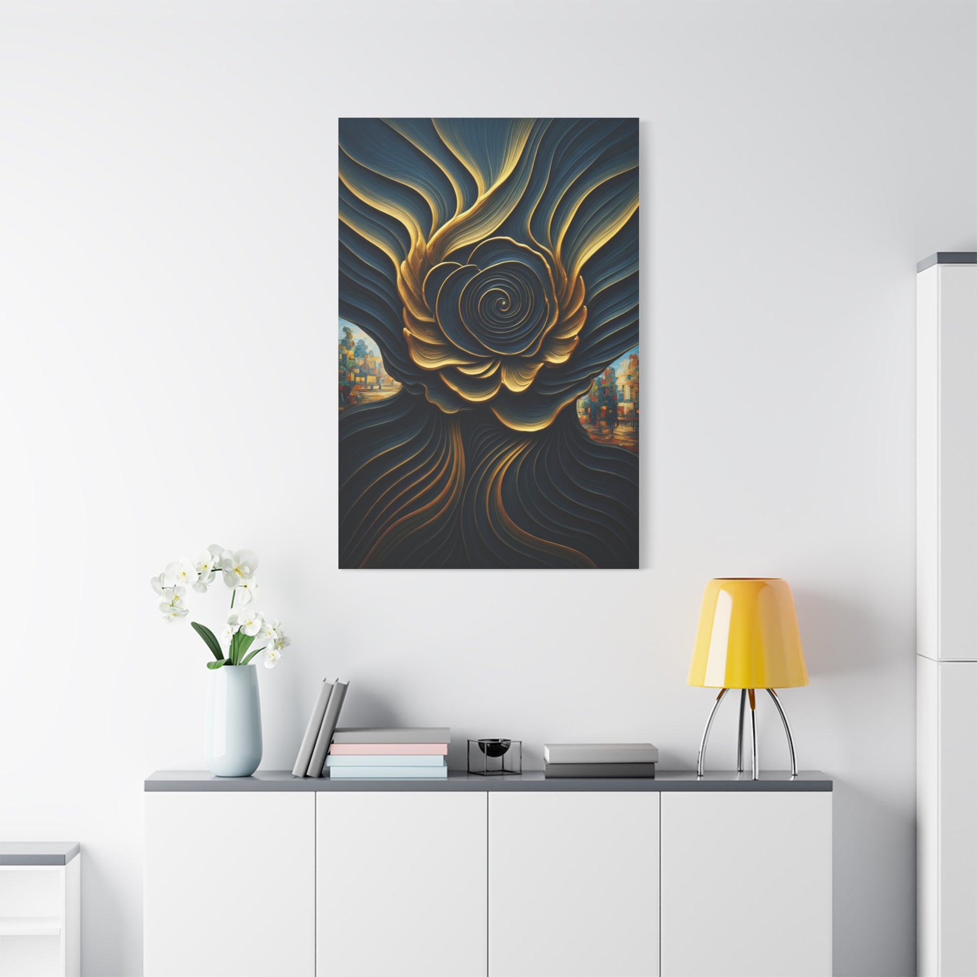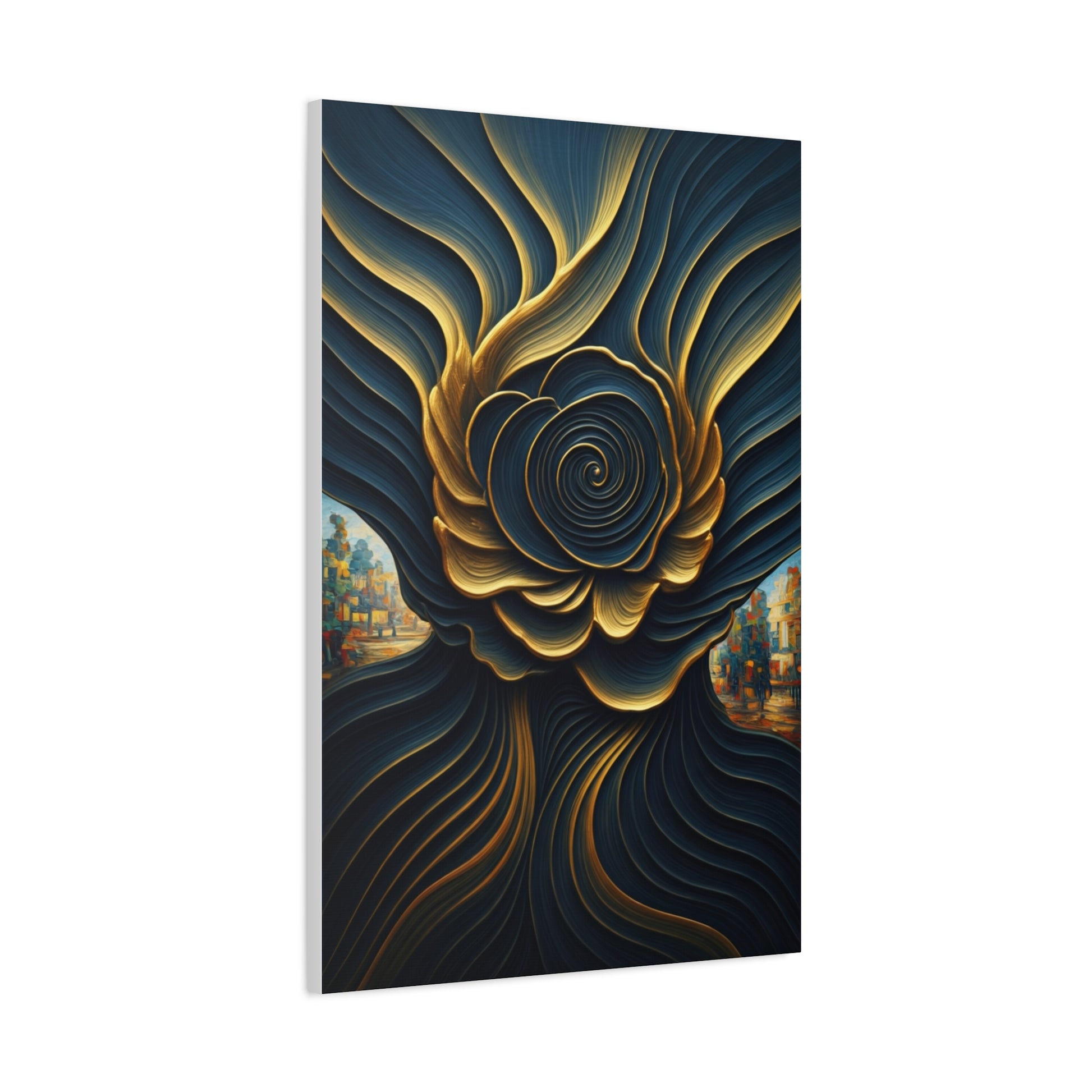 This captivating abstract piece features a mesmerizing spiral form unfolding like a blooming flower in deep midnight blue and glowing gold. Flowing lines curve gracefully outward, creating movement and harmony while subtle cityscape details peek through the sides, adding intrigue and depth. The contrast between dark tones and metallic highlights gives the artwork a luxurious, sophisticated feel. Ideal for elegant interiors or refined office spaces, this piece adds both mystery and artistic presence.