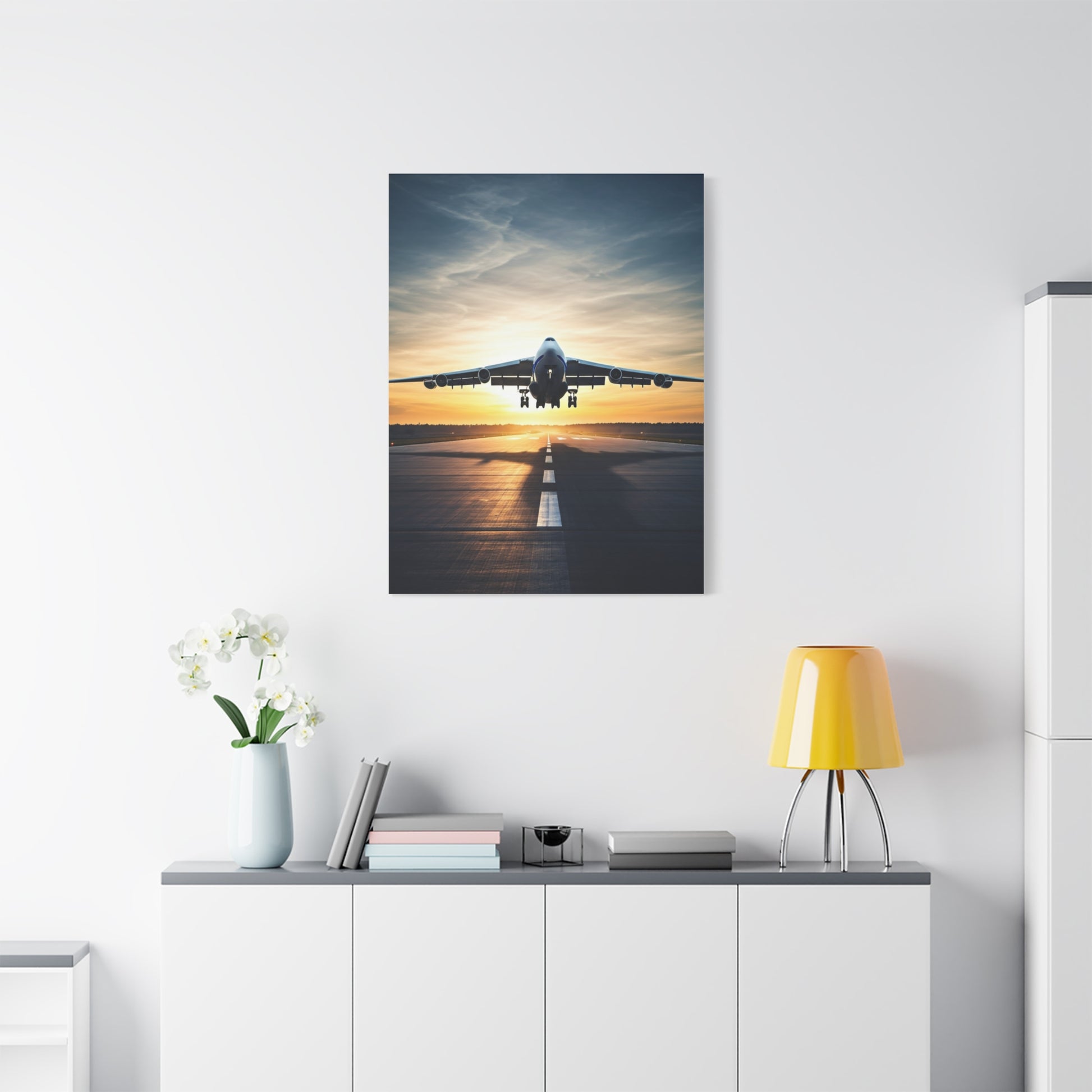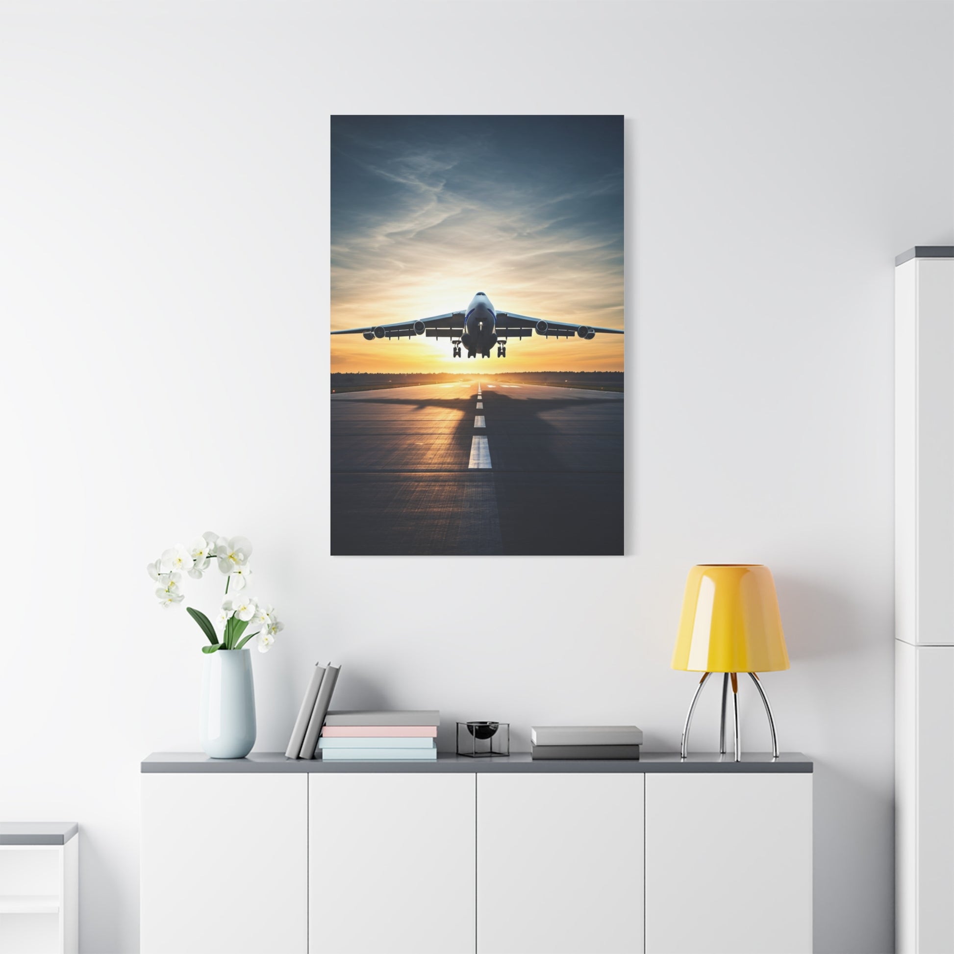 This powerful artwork showcases a jet positioned on a runway at sunrise, glowing with warm golden light and dramatic perspective. The scene represents momentum, new beginnings, and the thrill of departure, making it an ideal centerpiece for offices, lounges, and aviation enthusiast spaces.