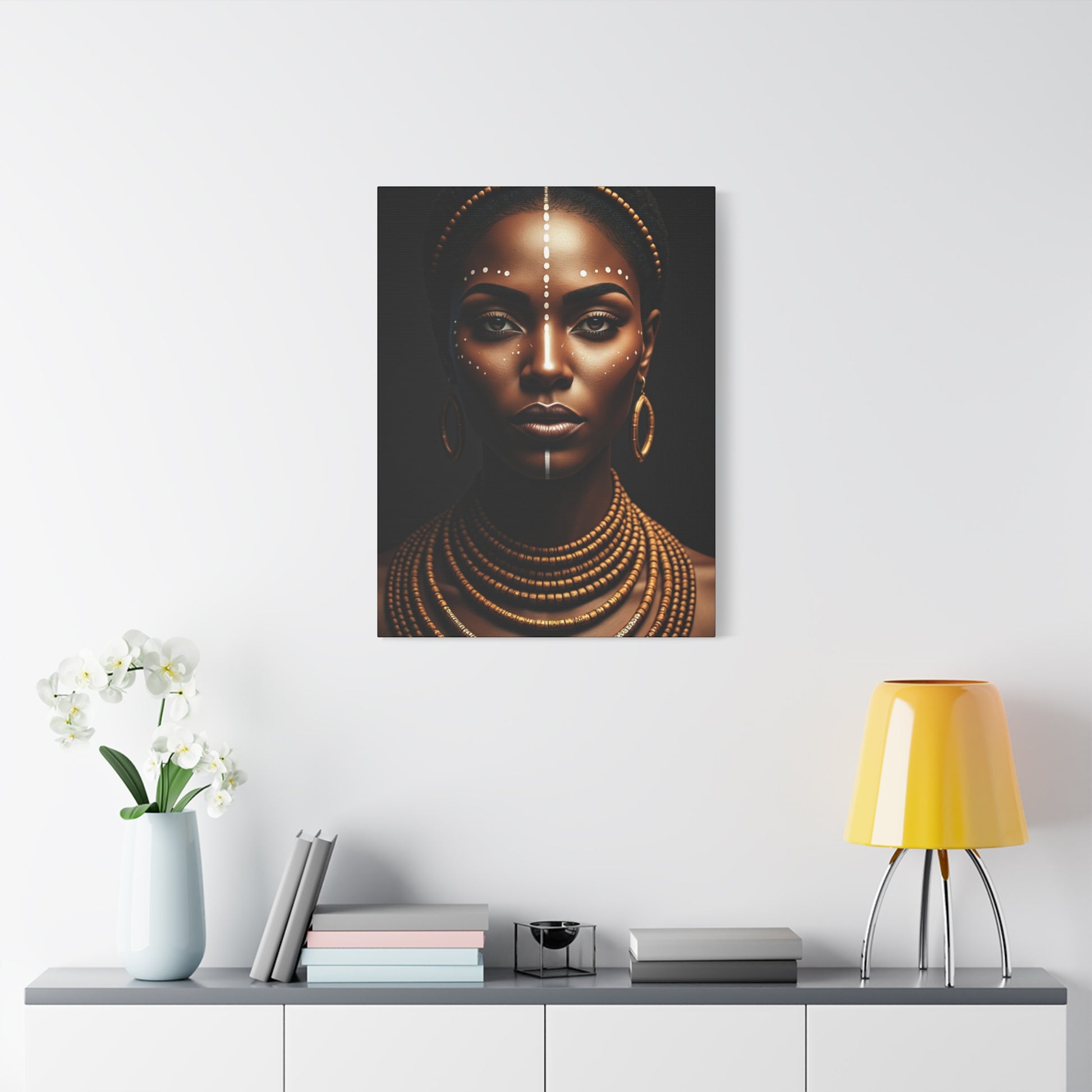 This elegant portrait features a regal African woman adorned with intricate jewelry and sacred facial markings. The rich golden highlights against a dark background create a sense of luxury, mystique, and spiritual beauty. Perfect for sophisticated interiors, gallery-style walls, or statement décor that celebrates culture, femininity, and strength.