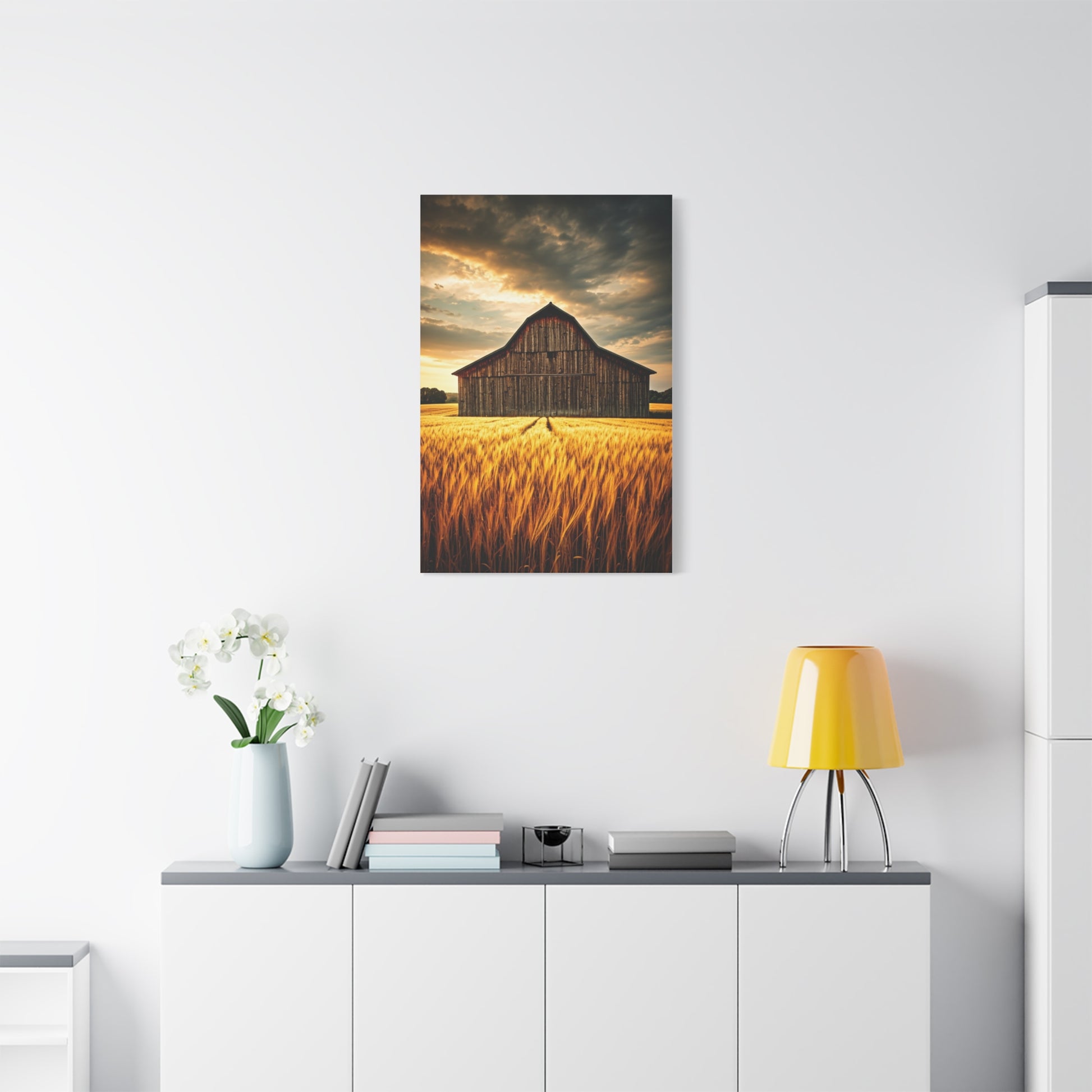This striking scene shows a solitary barn rising from a vast field of golden wheat, with soft tracks leading toward its doors under a glowing sunset sky. The warm light enhances the richness of the crops and highlights the barn’s weathered facade. The image symbolizes harvest, abundance, and rural tradition, making it a powerful focal piece for kitchens, dining areas, or farmhouse décor.