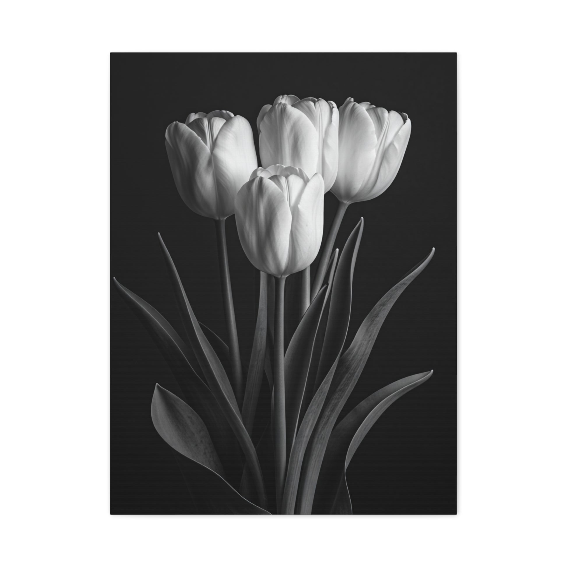 Three slender tulips stand tall in this beautifully balanced black and white composition. Their smooth petals and elongated stems create a refined silhouette against a deep, moody background. Perfect for minimalist and Scandinavian-inspired interiors, this artwork adds understated elegance and vertical movement. A clean, modern floral piece with timeless appeal.