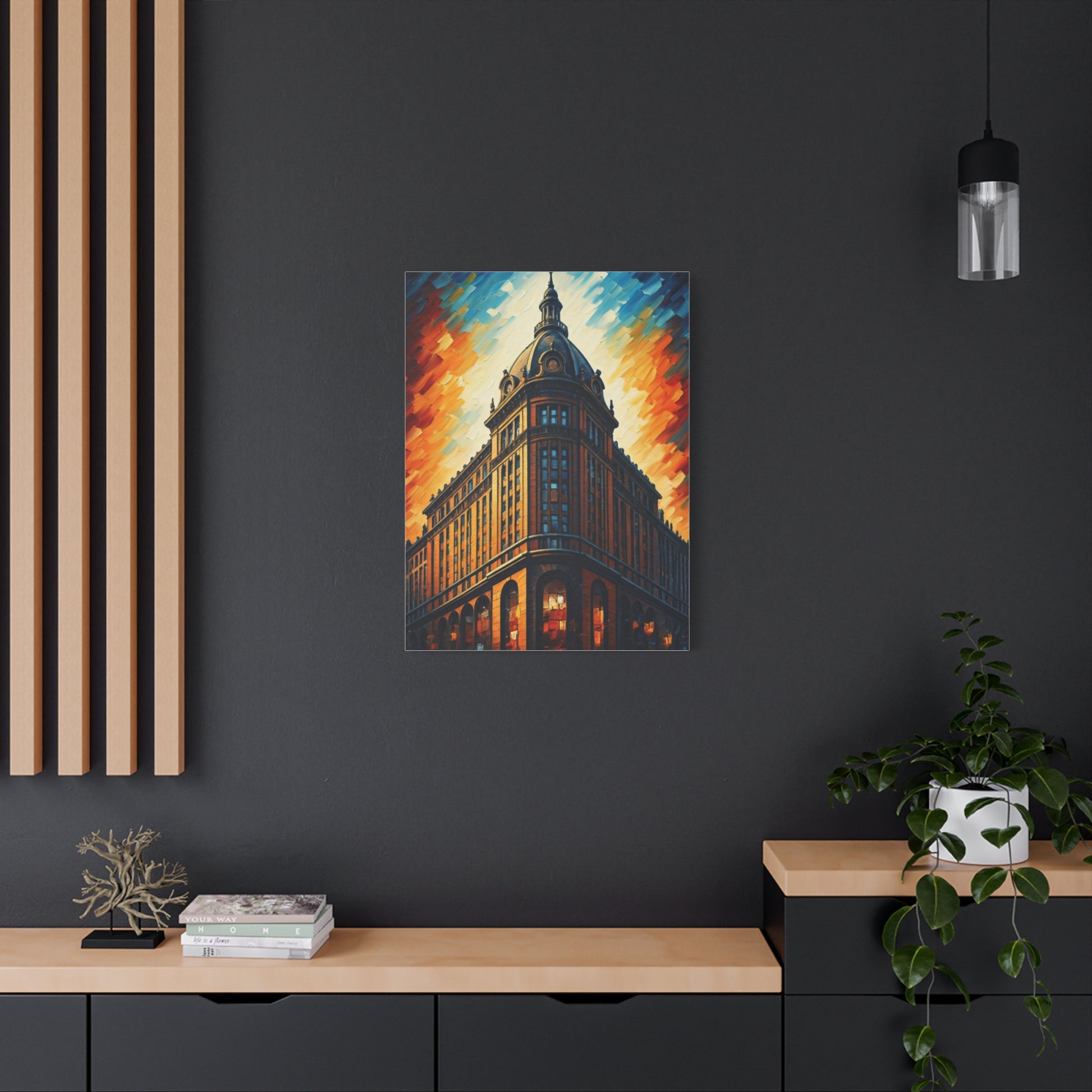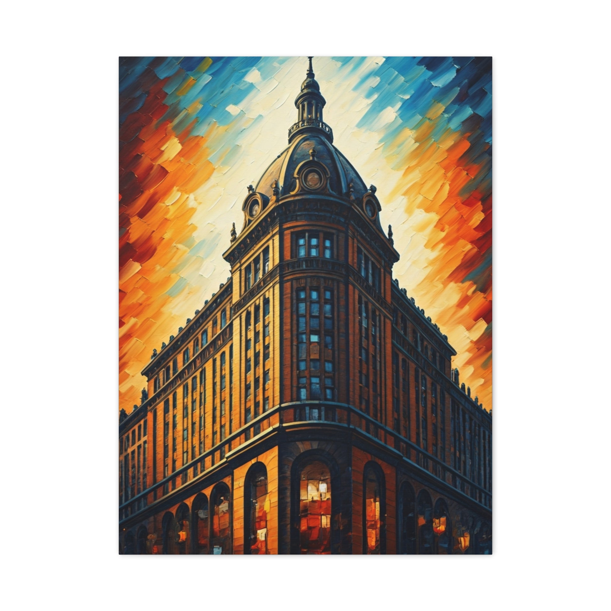 A magnificent domed building rises dramatically against a vibrant sky filled with bold, expressive brushstrokes. The warm golden façade contrasts beautifully with deep blue accents, emphasizing architectural grandeur and classical detail. This piece blends historic elegance with contemporary artistic flair. Ideal for statement walls in offices, hallways, or sophisticated interiors.