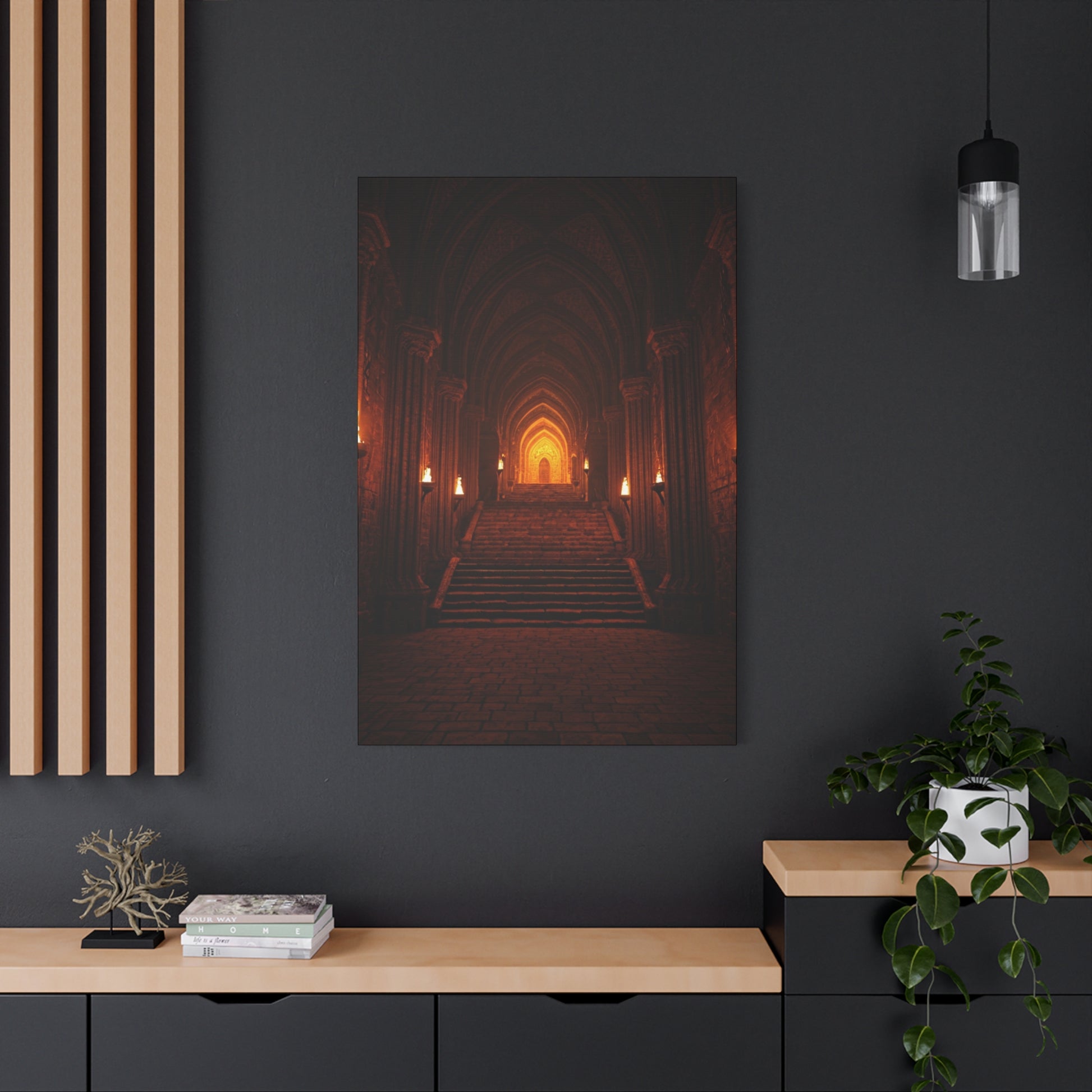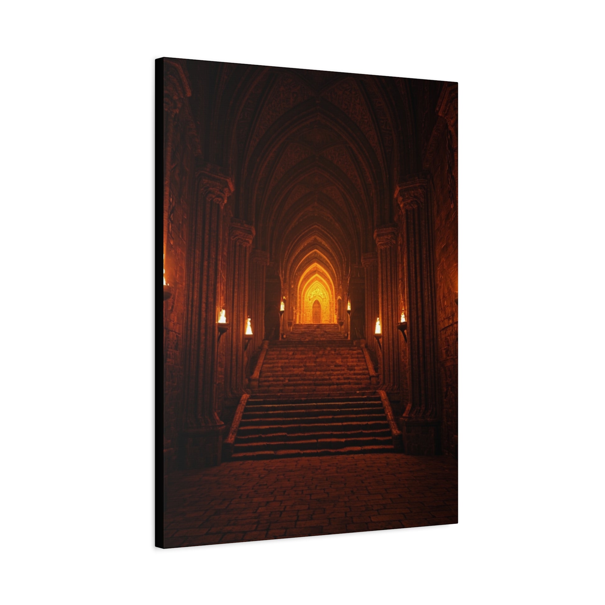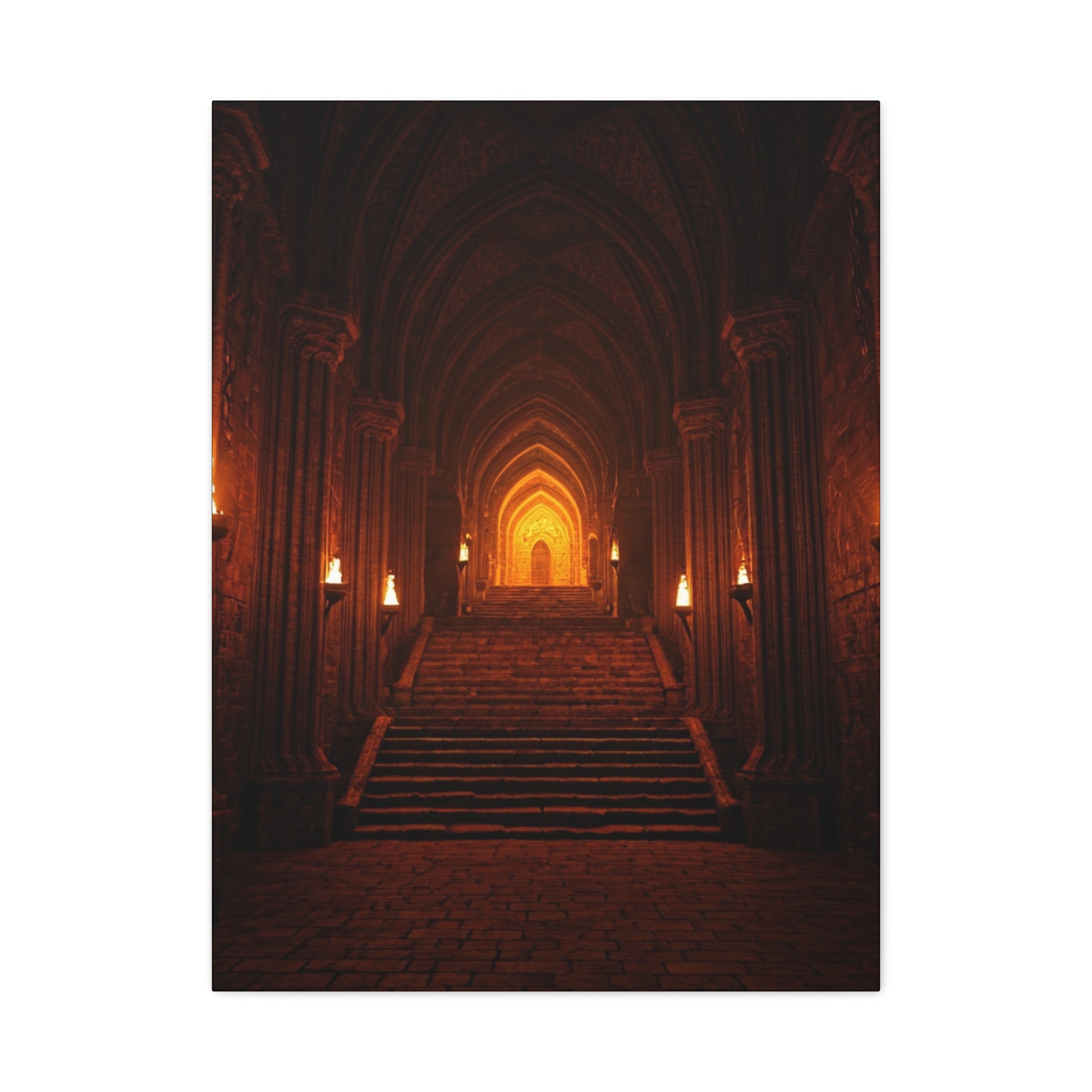 This dramatic artwork reveals a grand stone hall illuminated by rows of flickering torches, leading upward through towering arches toward a radiant, golden doorway. The deep shadows, warm firelight, and symmetrical architecture create a powerful sense of scale, mystery, and ancient authority. Each step draws the eye deeper into the scene, evoking themes of destiny, hidden realms, and timeless power. Ideal for living rooms, offices, studios, or fantasy-inspired interiors, this piece brings cinematic depth, atmosphere, and a bold, legendary presence to any wall.
