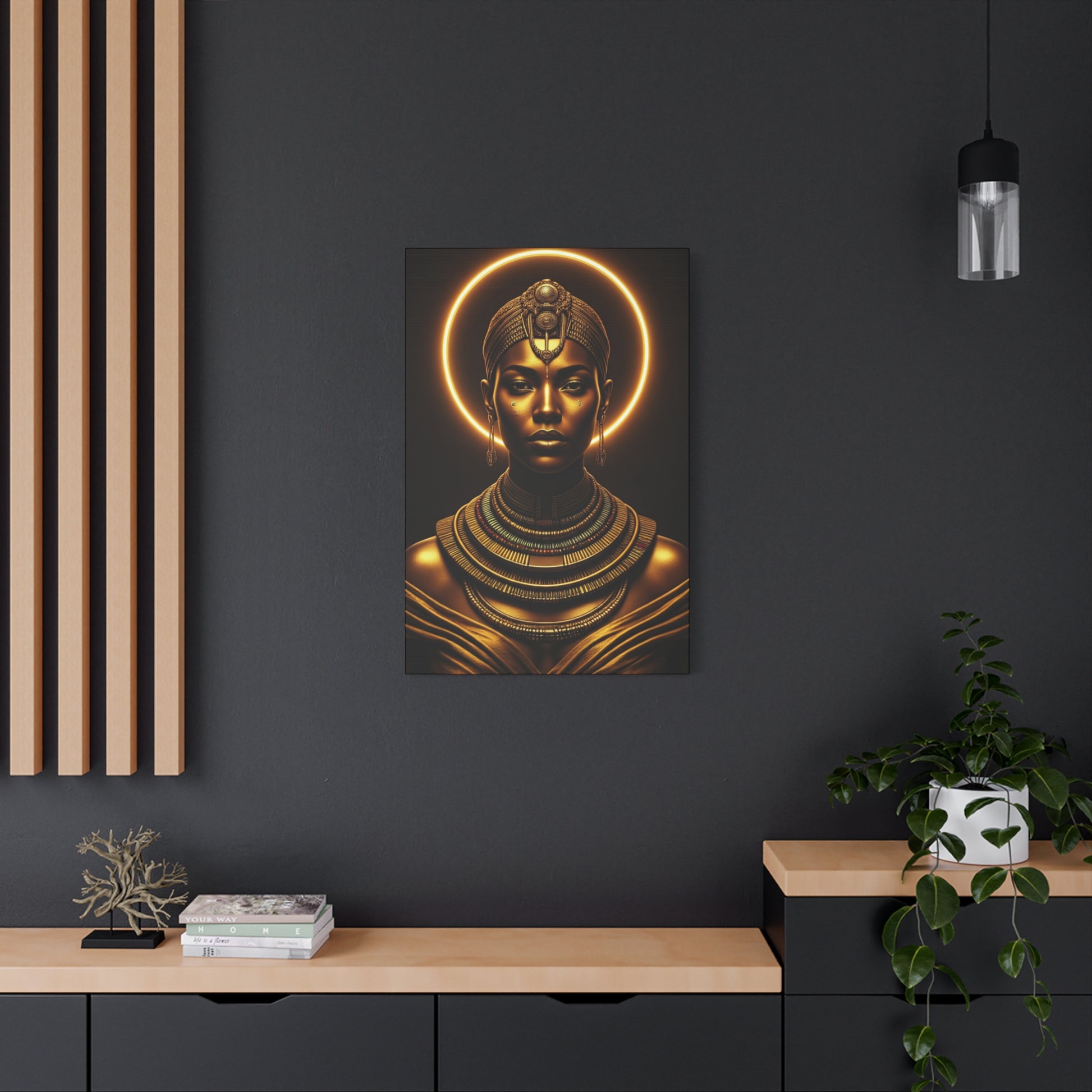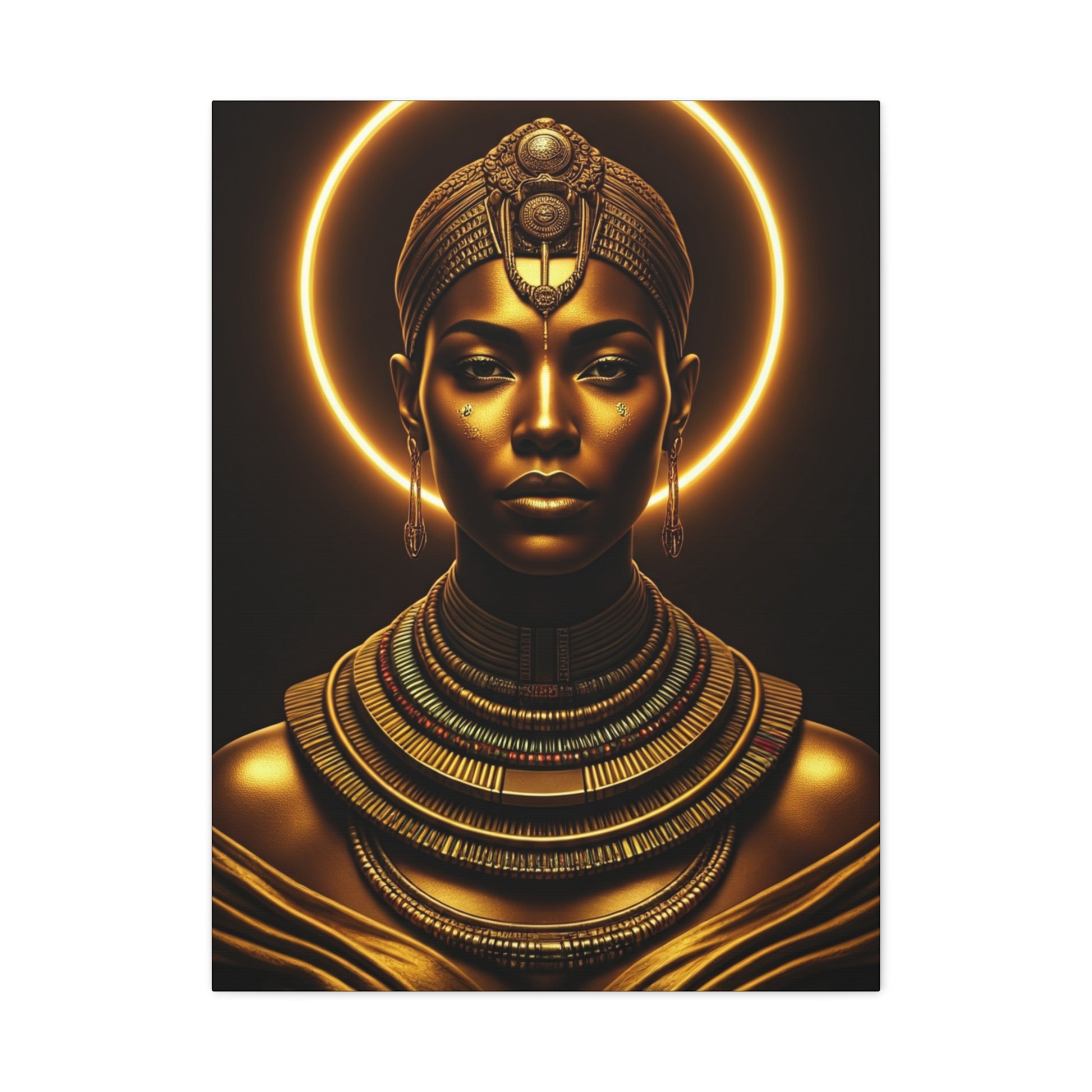 This striking portrait showcases a regal African figure illuminated by a glowing golden halo, representing spirituality, power, and divine identity. The metallic tones and cinematic lighting make this piece a bold centerpiece for luxury interiors, cultural art collections, or décor celebrating royal elegance and presence.