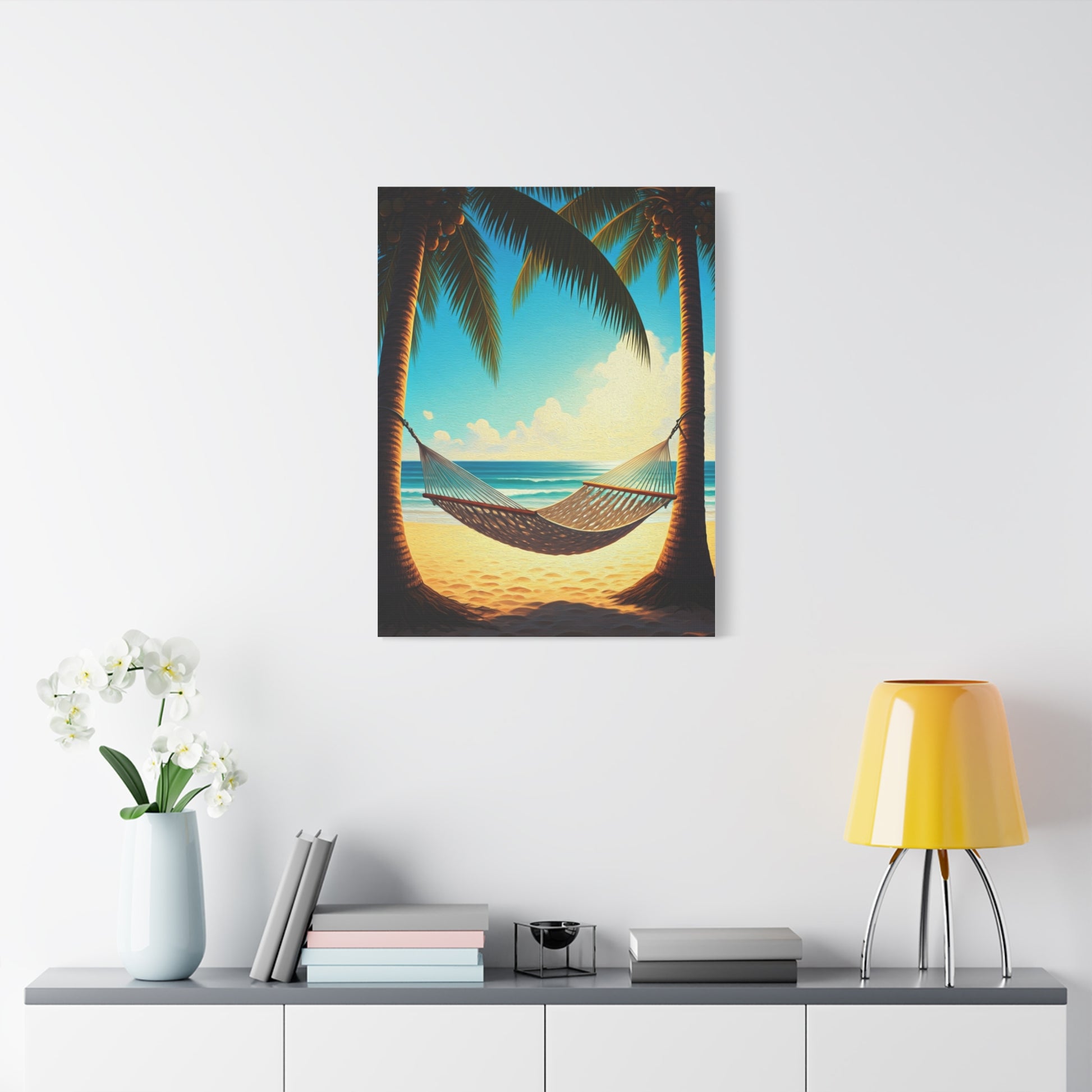 A dreamy coastal print showcasing a hammock suspended between palms, overlooking calm waves and golden sunlight. The relaxing composition radiates peaceful leisure, making it perfect for bedrooms, lounges, or serene tropical décor.
