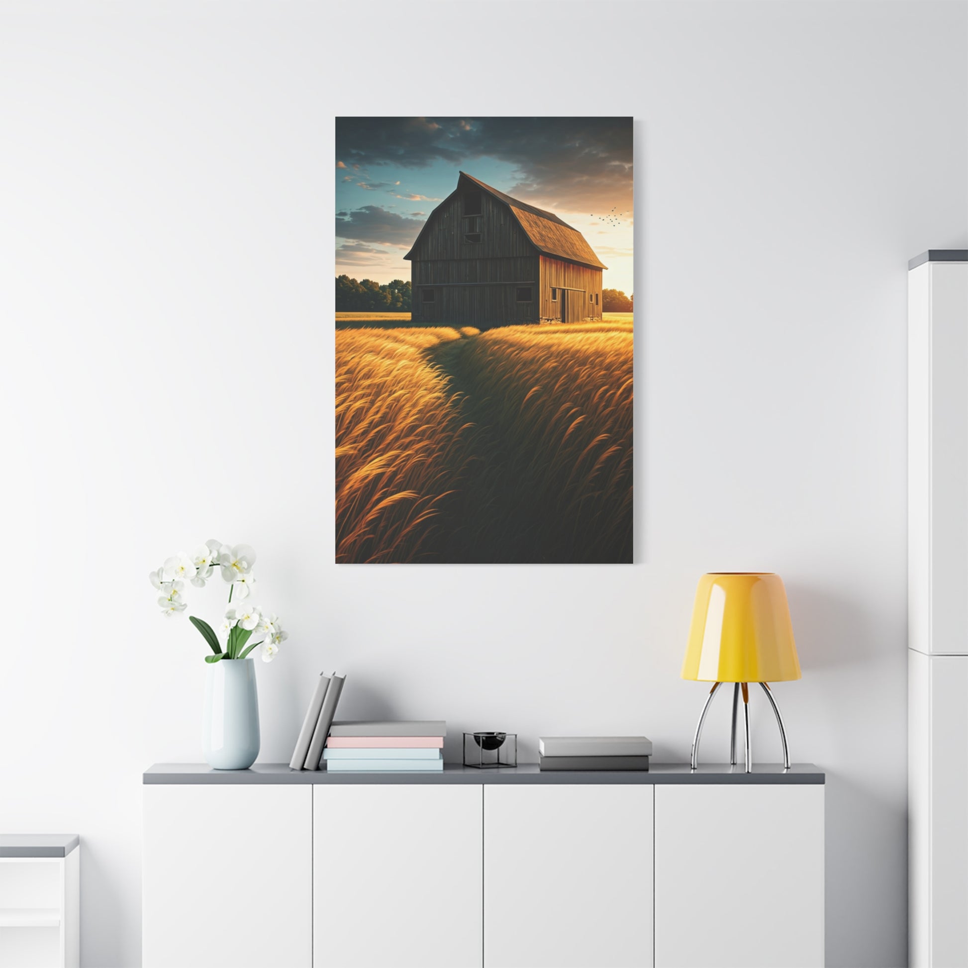 Surrounded by golden fields, this barn stands tall as the wind sweeps through the harvest grasses under a glowing evening sky. The scene celebrates abundance, rural beauty, and the quiet reward of hard work. Perfect for farmhouse kitchens, dining areas, or living spaces that value warmth and natural elegance.