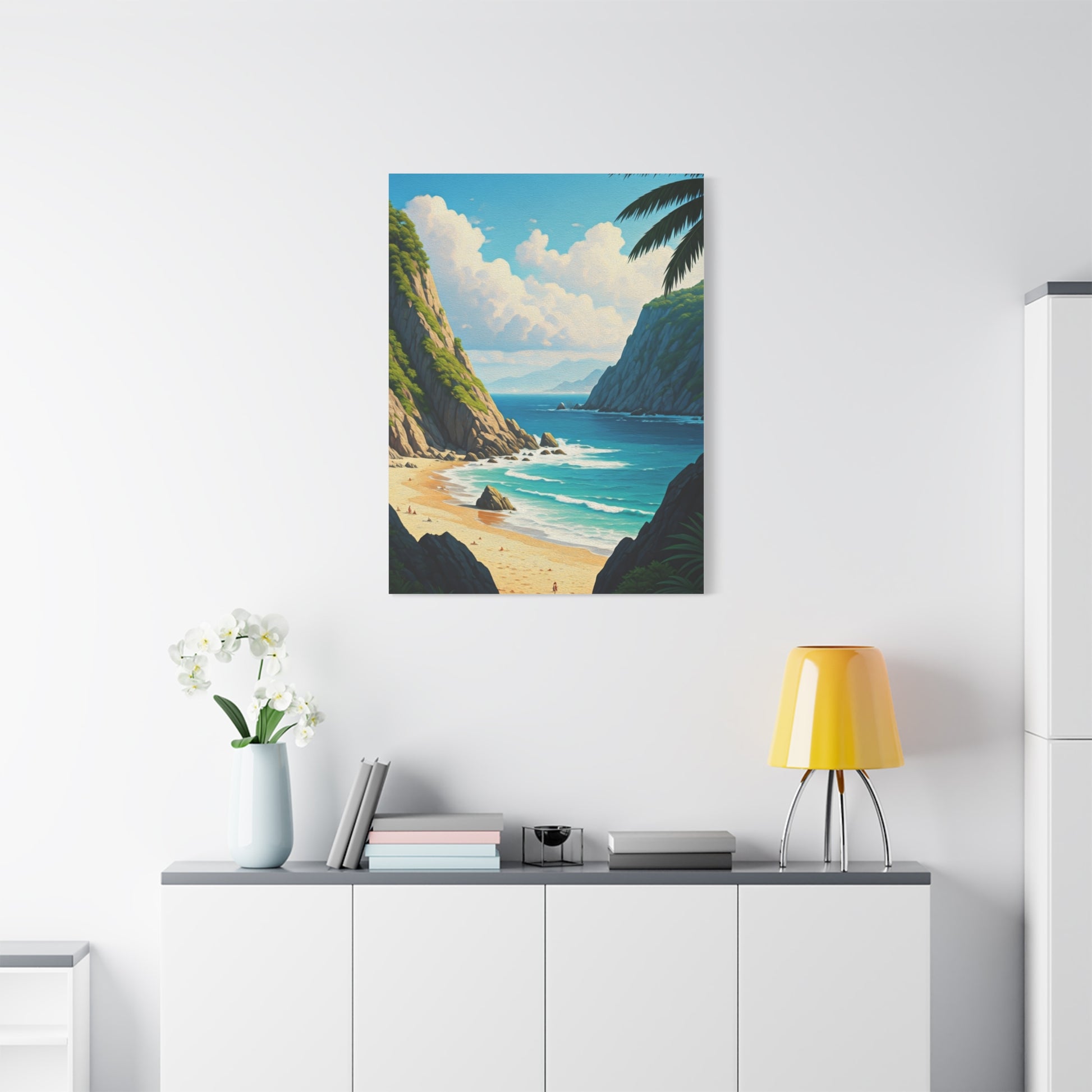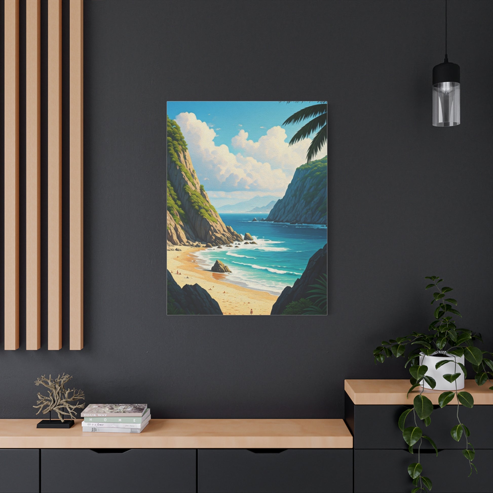 A breathtaking coastal escape print featuring a secluded sandy cove framed by dramatic cliffs and crystal-blue waters. The peaceful shoreline and lush greenery evoke adventure, calm, and timeless seaside wonder. Perfect for nature-inspired interiors and coastal décor lovers.
