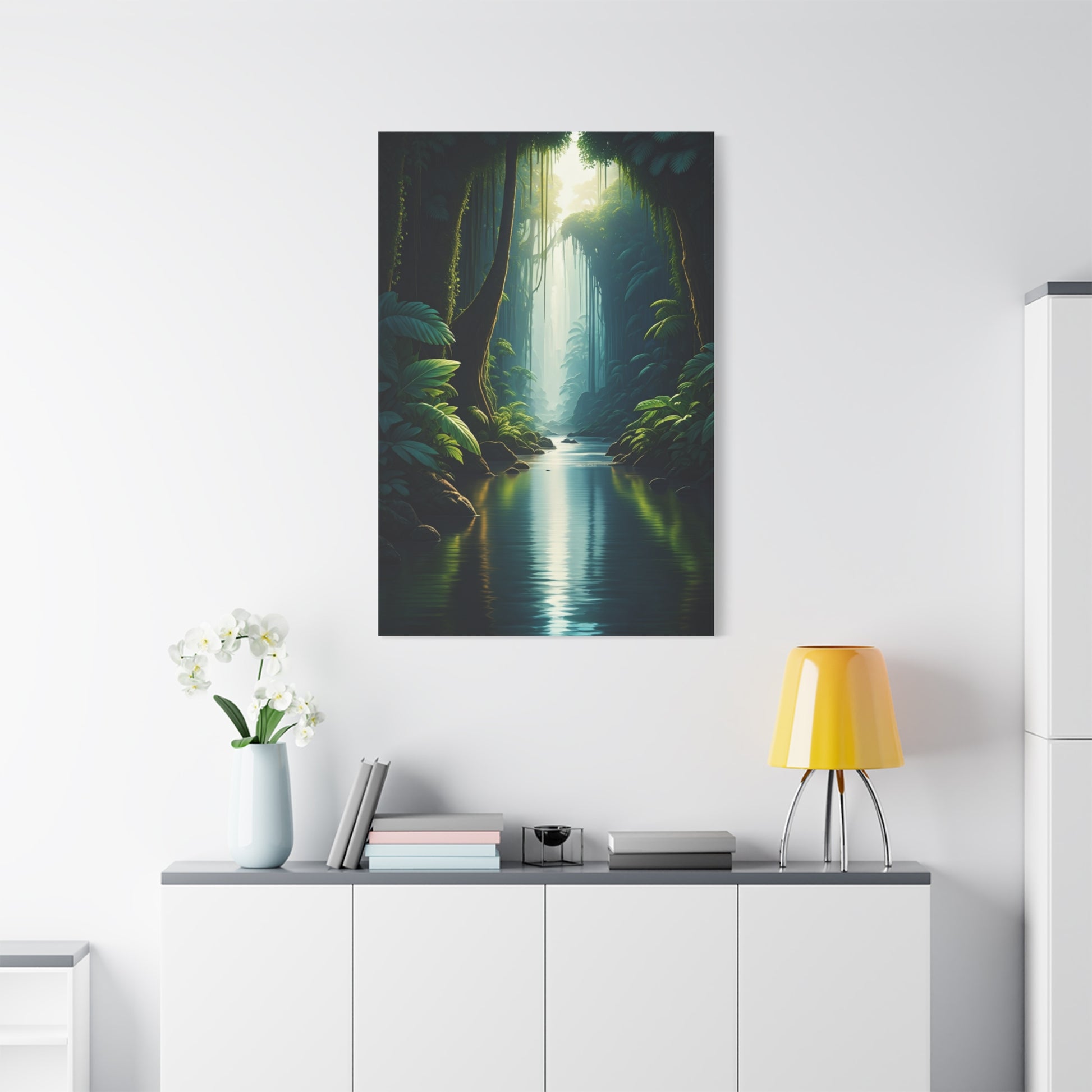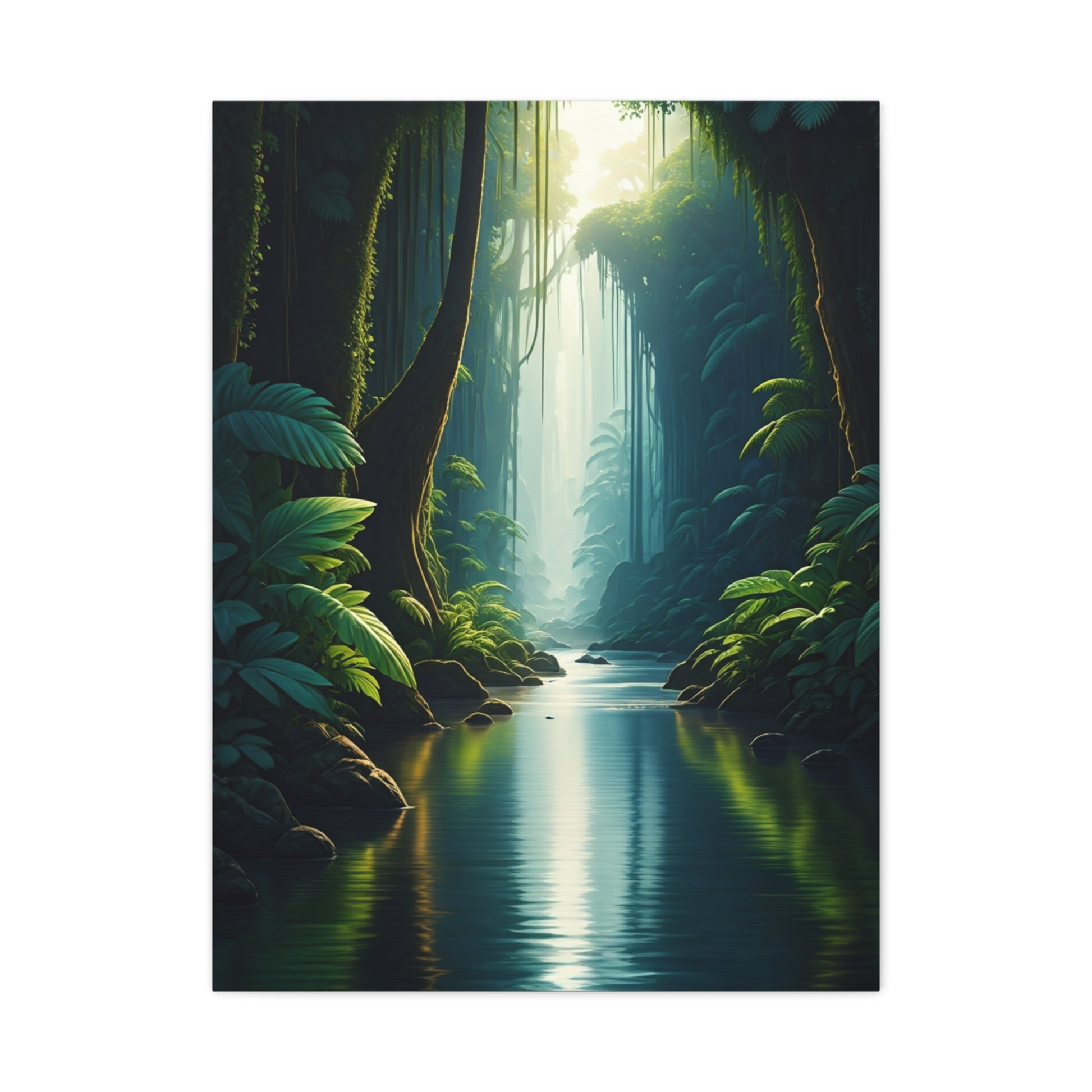This lush nature scene reveals a waterfall cascading through dense tropical greenery, creating a peaceful atmosphere of renewal and escape. The vibrant depth and soft misty light bring freshness and tranquility to any space.