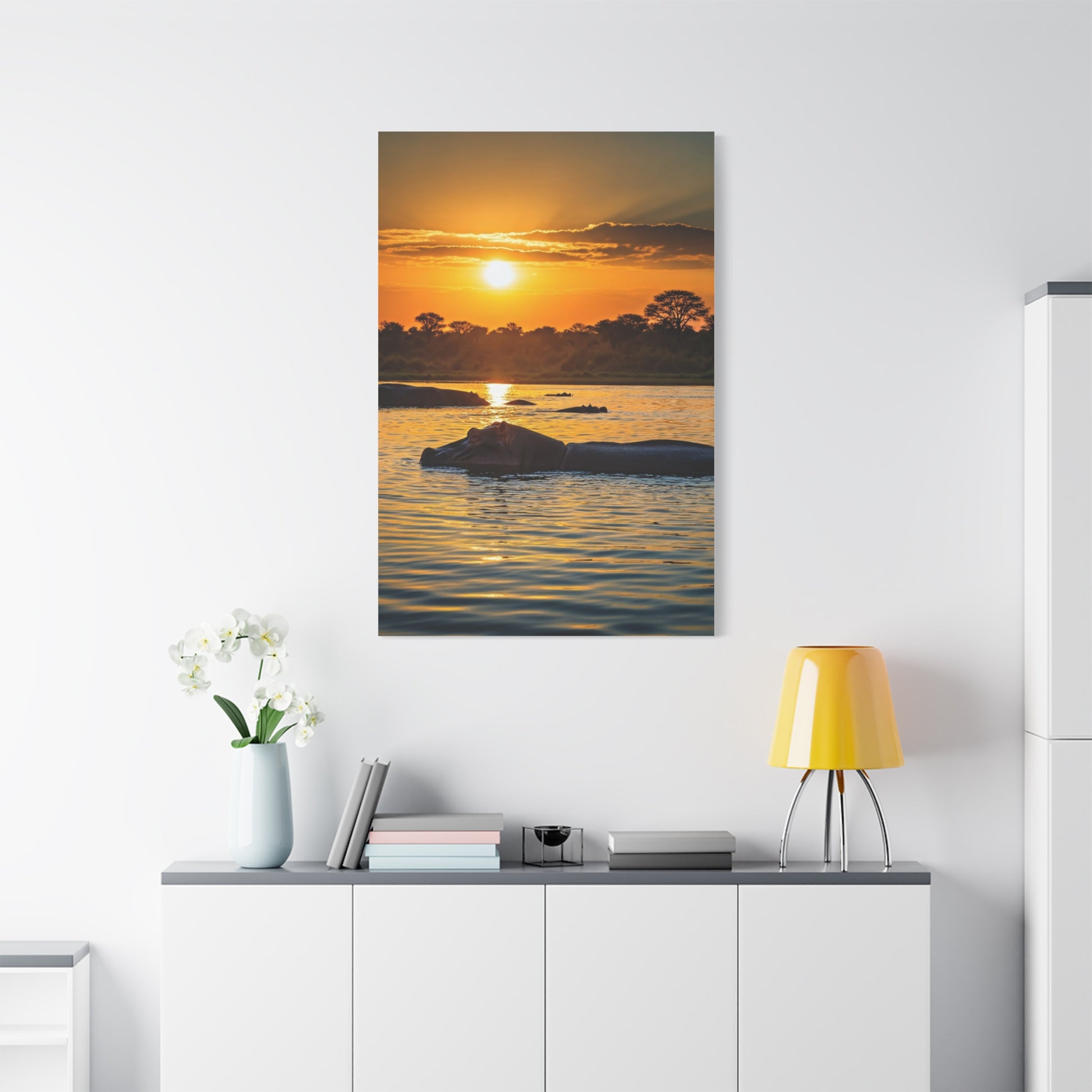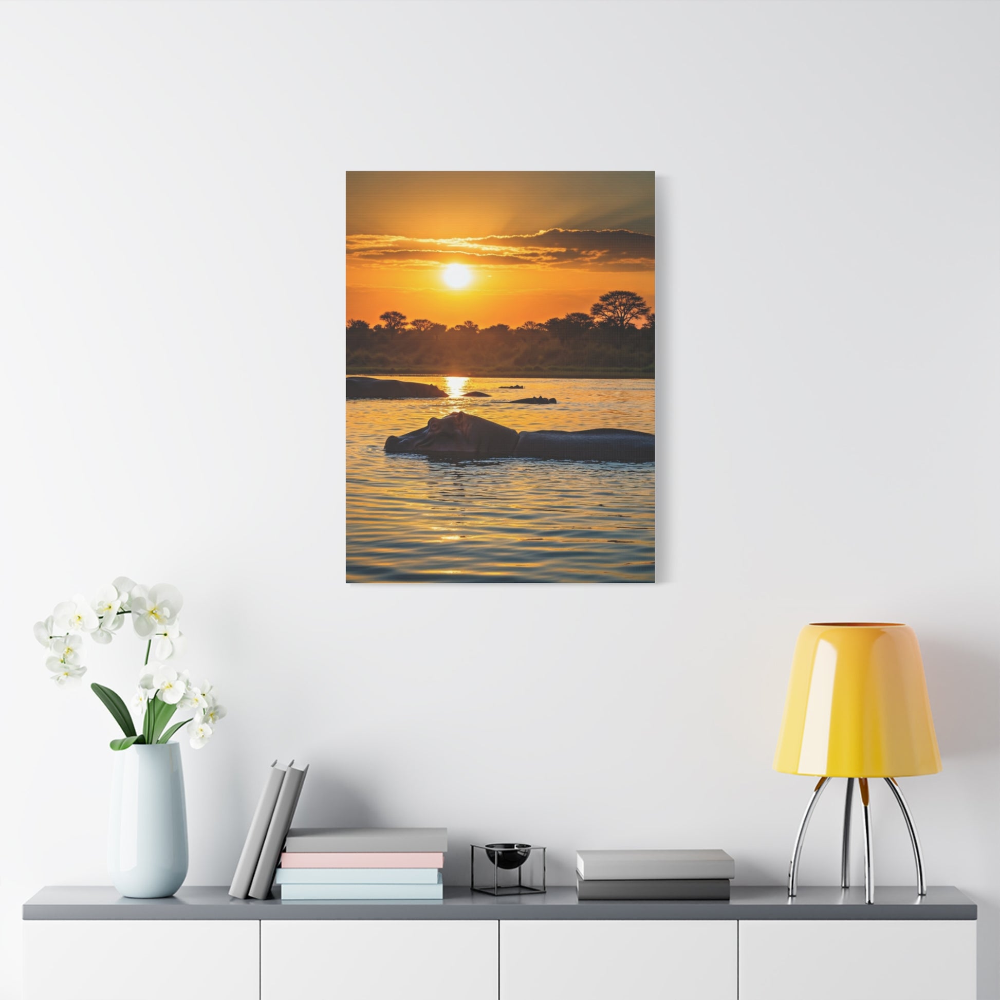 This serene wildlife artwork captures a peaceful hippopotamus floating quietly in shimmering waters beneath a glowing golden sunset. The soft reflections and warm horizon create a calming atmosphere of stillness, nature, and tranquility. A perfect piece for coastal-inspired interiors, safari lovers, or any space that seeks a relaxing connection to the wild.