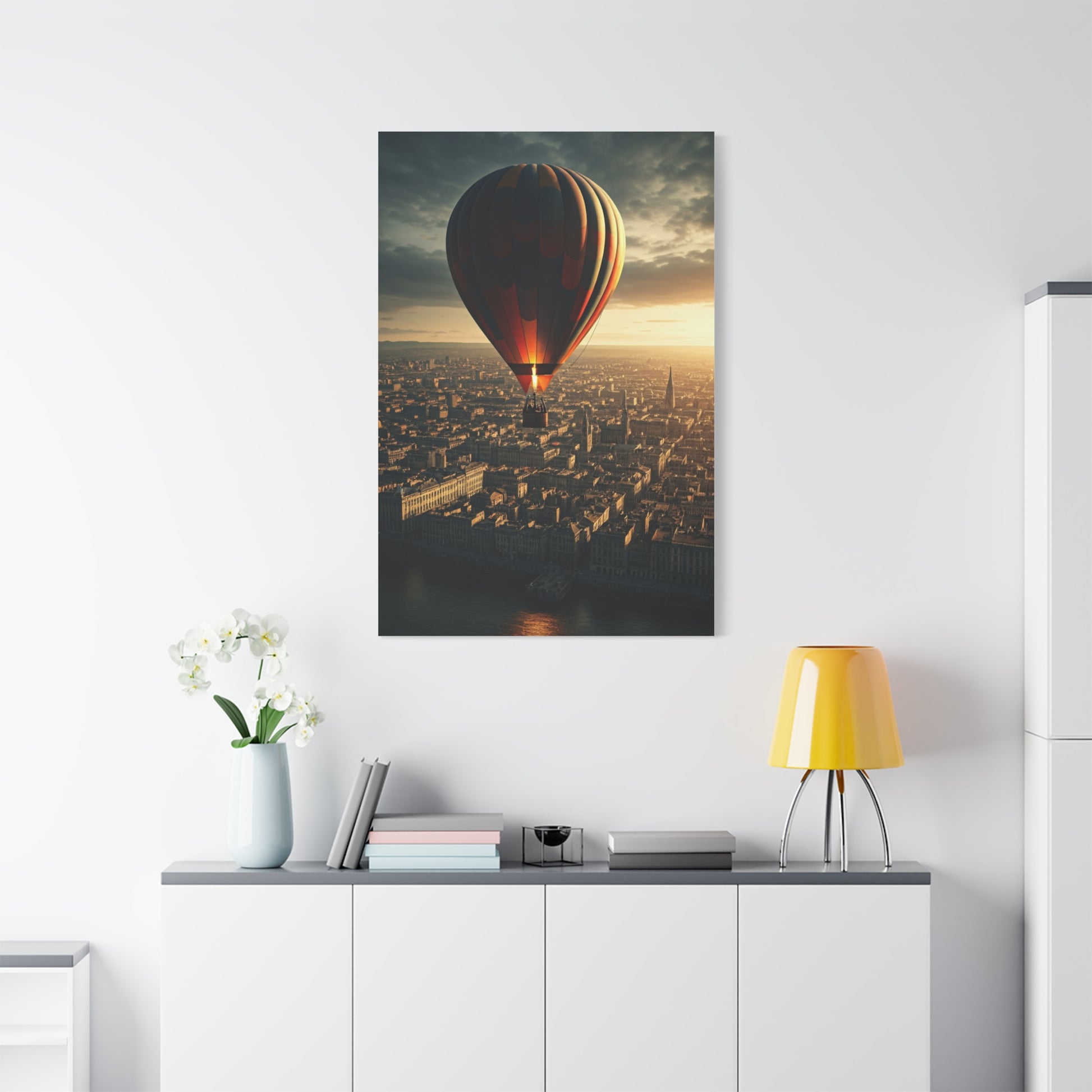 This breathtaking artwork captures a glowing hot air balloon drifting peacefully above a sprawling city skyline at sunset. The warm golden light and serene atmosphere evoke freedom, wonder, and timeless adventure, making it a perfect statement piece for travel lovers, modern interiors, or spaces inspired by exploration.