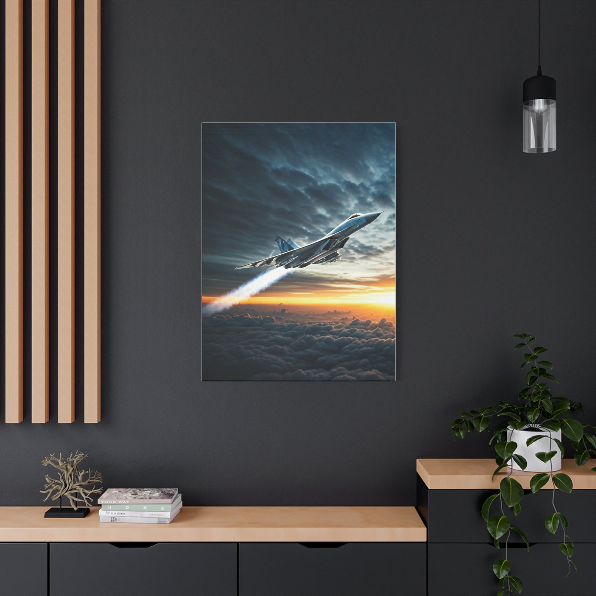 This bold artwork captures a sleek jet accelerating above cloud layers beneath a dramatic sunrise. The glowing trail of speed and futuristic energy represents progress, ambition, and freedom, making it an inspiring centerpiece for modern interiors..