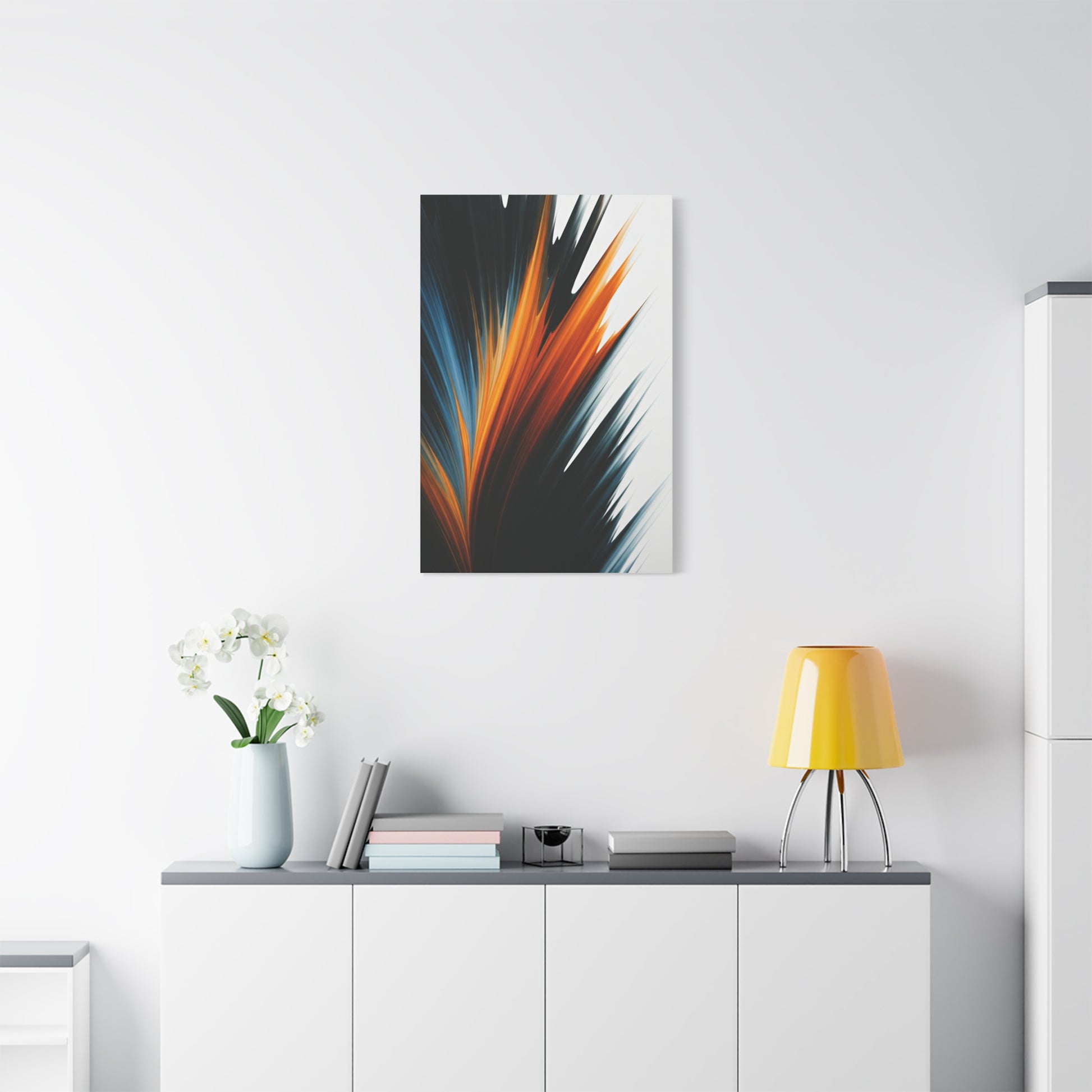 Ignition Strike Abstract features sharp, dynamic strokes of orange and blue cutting through deep black and white tones. The composition conveys speed, impact, and controlled chaos, making it a perfect choice for modern homes, creative studios, and interiors that thrive on energy and contrast.