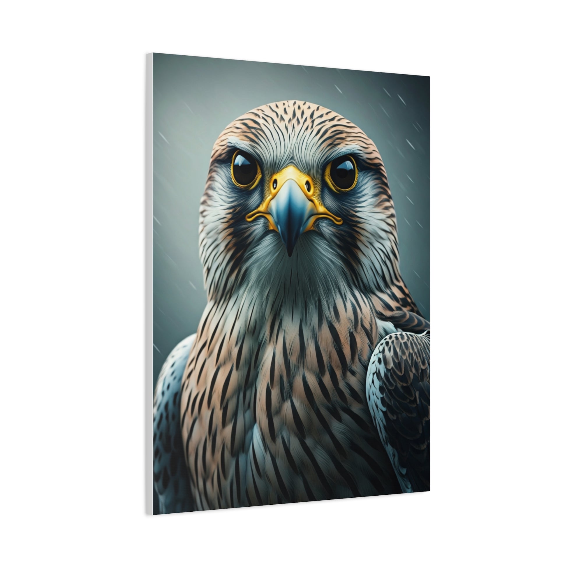A close-up portrait highlighting the sharp focus and noble presence of a hawk in stunning detail. The soft blurred background enhances the bird’s expressive eyes and finely textured feathers, creating dramatic contrast. Its centered composition gives it a strong, symmetrical appeal suited for modern or minimalist décor. Perfect for living rooms, creative studios, or masculine interiors seeking bold wildlife energy. This artwork radiates confidence, clarity, and natural power.