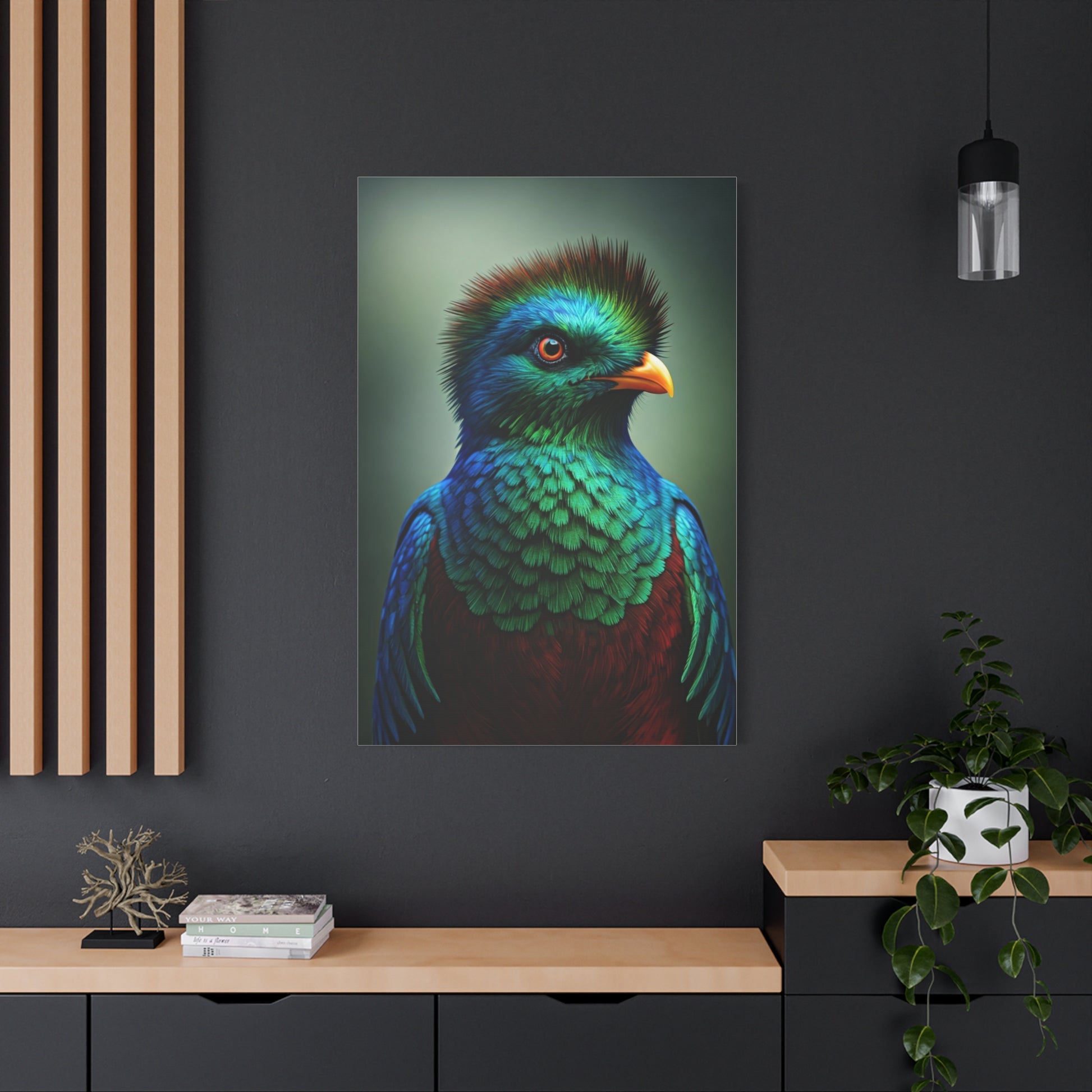 This mesmerizing portrait captures a brilliantly colored bird with shimmering blue and emerald-green plumage. The layered feather textures glow under soft, natural lighting, creating a rich, dimensional effect. Its calm yet alert expression adds character and elegance to the composition. Perfect for modern interiors, nature-inspired décor, or vibrant statement walls. This artwork brings sophistication, color harmony, and a touch of exotic beauty into any space.