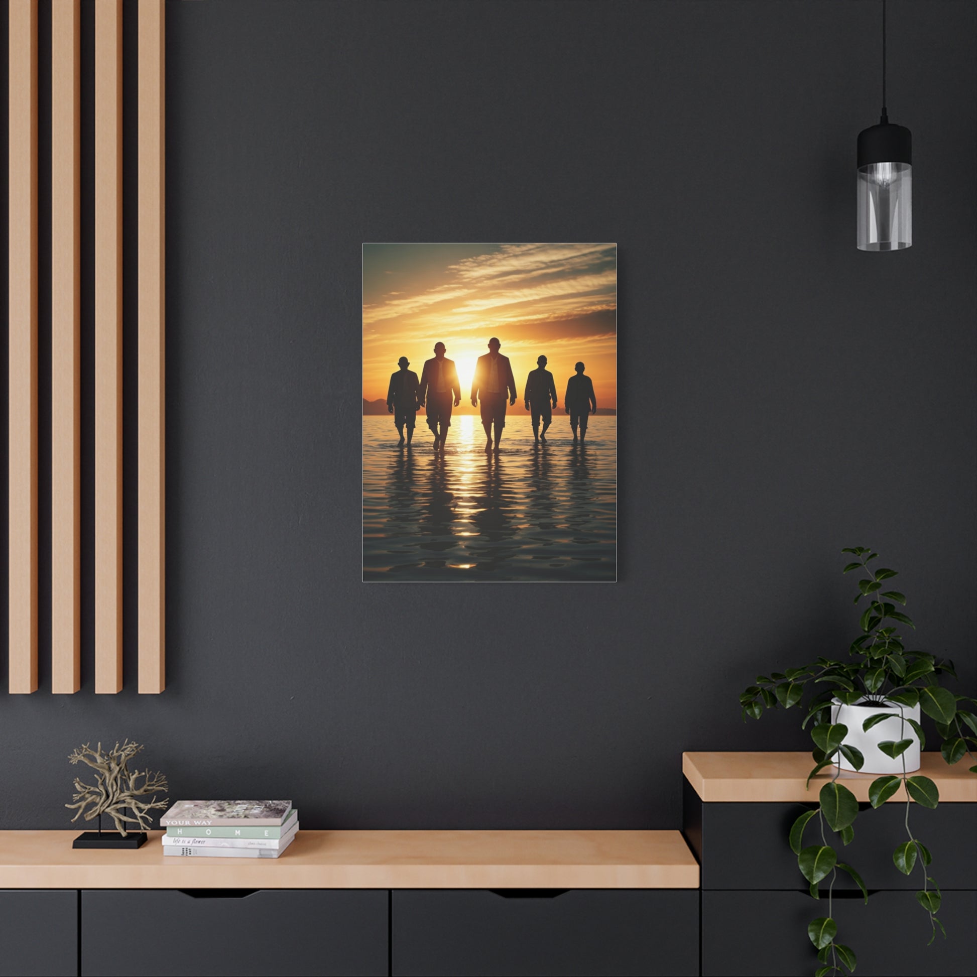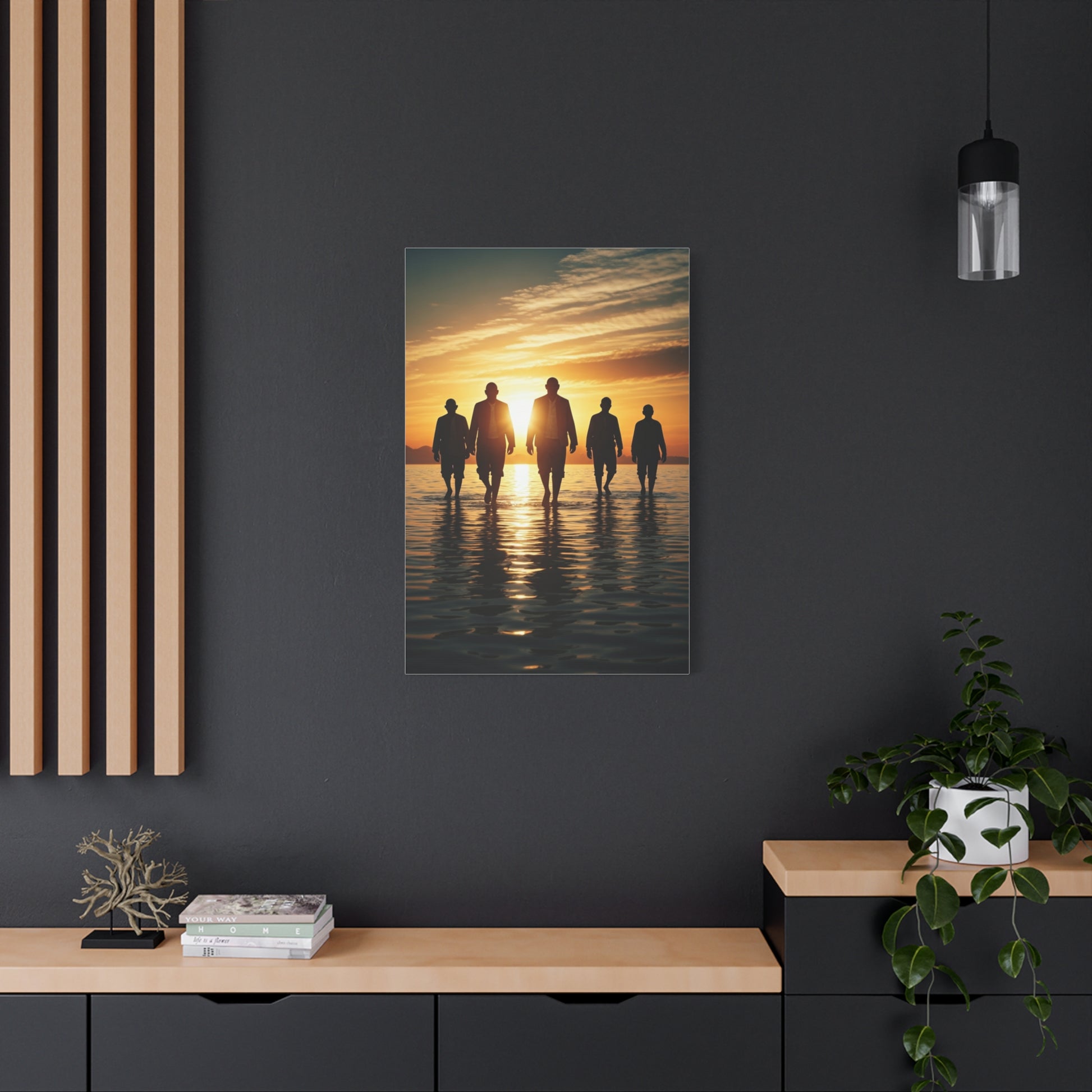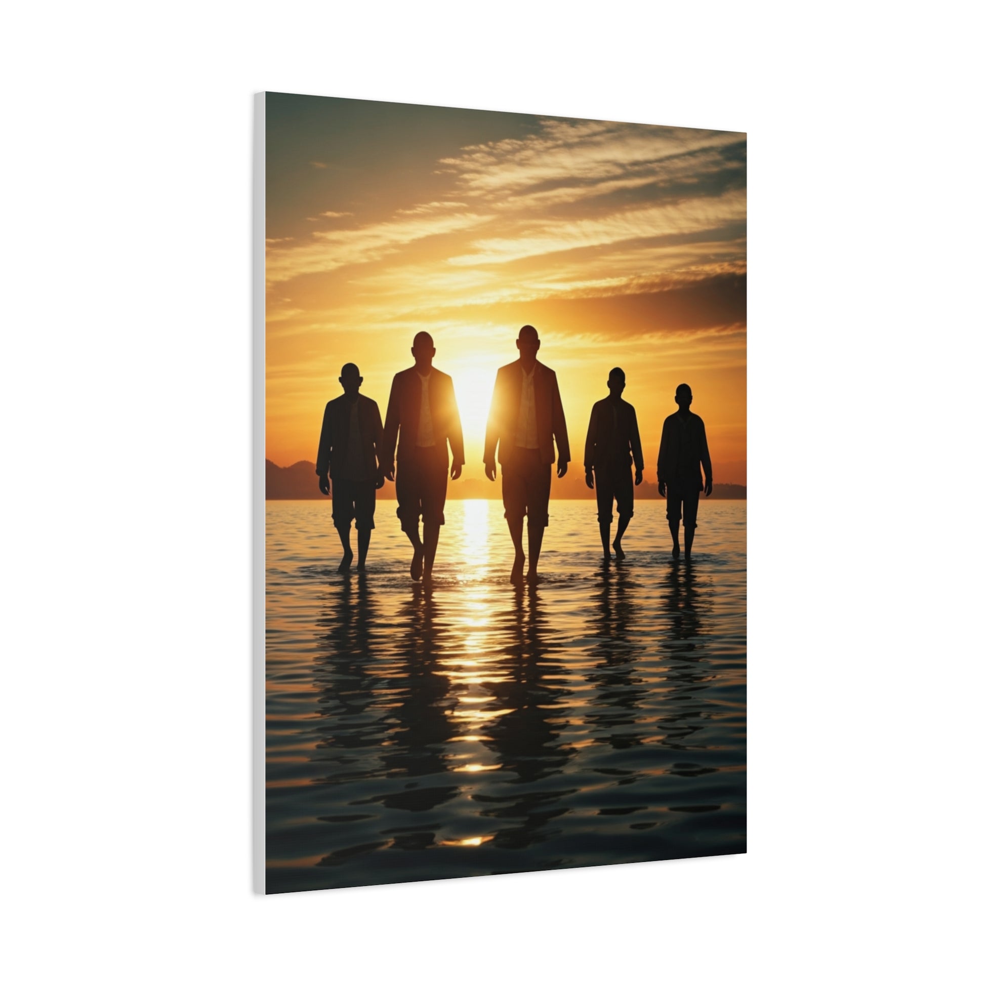 This evocative scene features a group of figures walking through shallow water as the sun sets behind them, reflecting warm tones across the surface below. The mirrored silhouettes and soft horizon light create a sense of movement, transition, and shared journey. The calm water and expansive sky add serenity, while the grouping suggests unity and purpose. The artwork feels both peaceful and purposeful, making it a versatile statement piece. Ideal for contemporary, minimalist, or storytelling interiors, it brings warmth and visual flow to living rooms or offices.