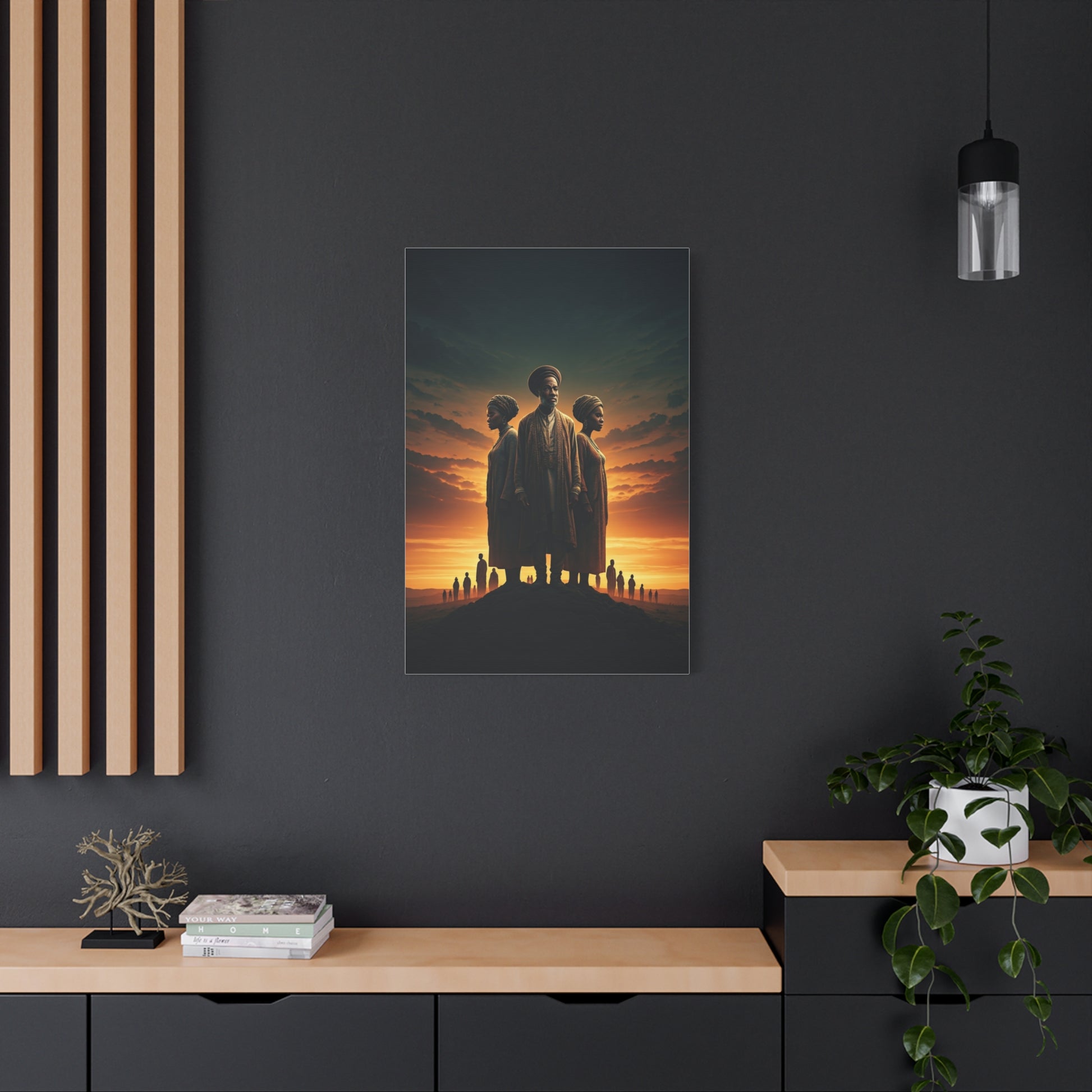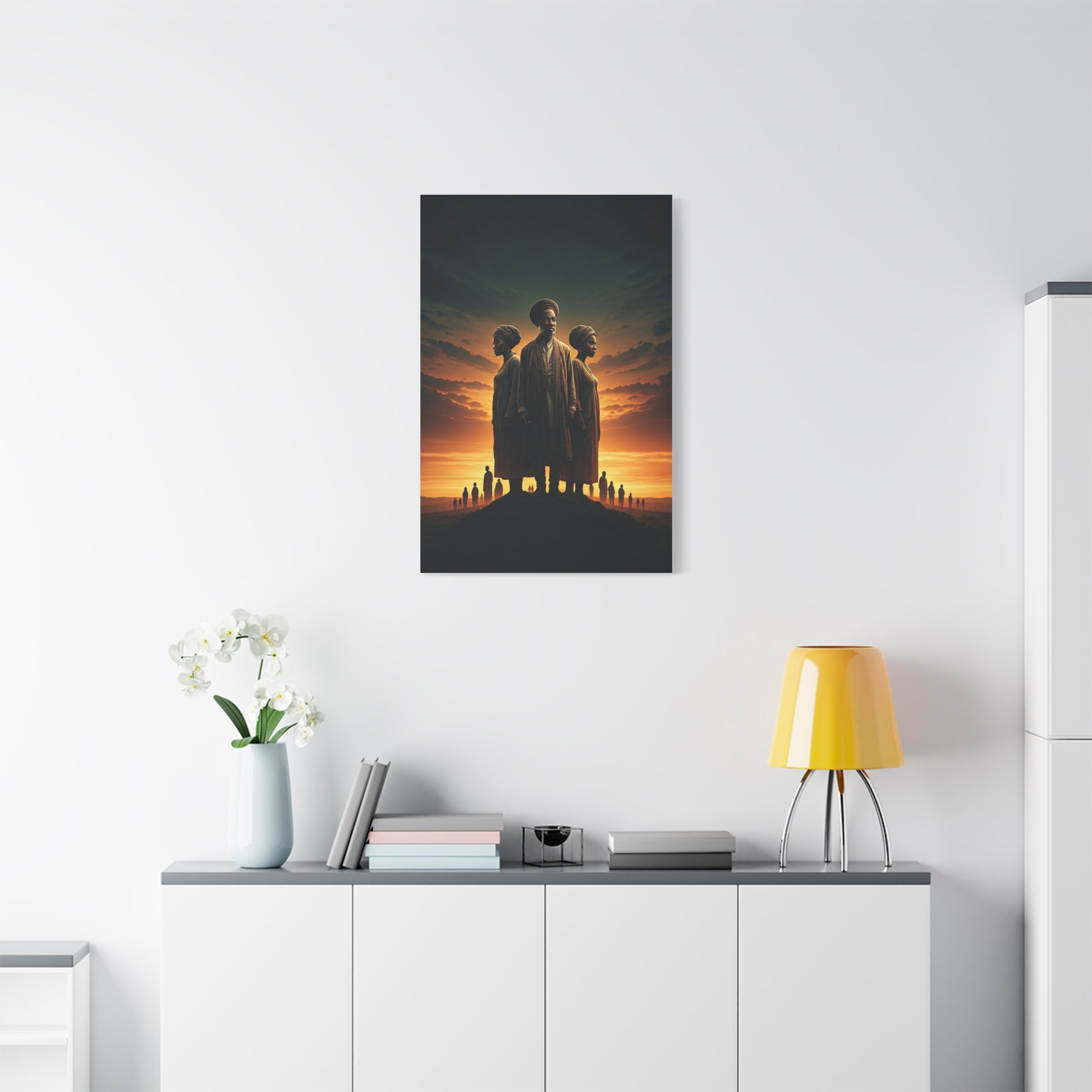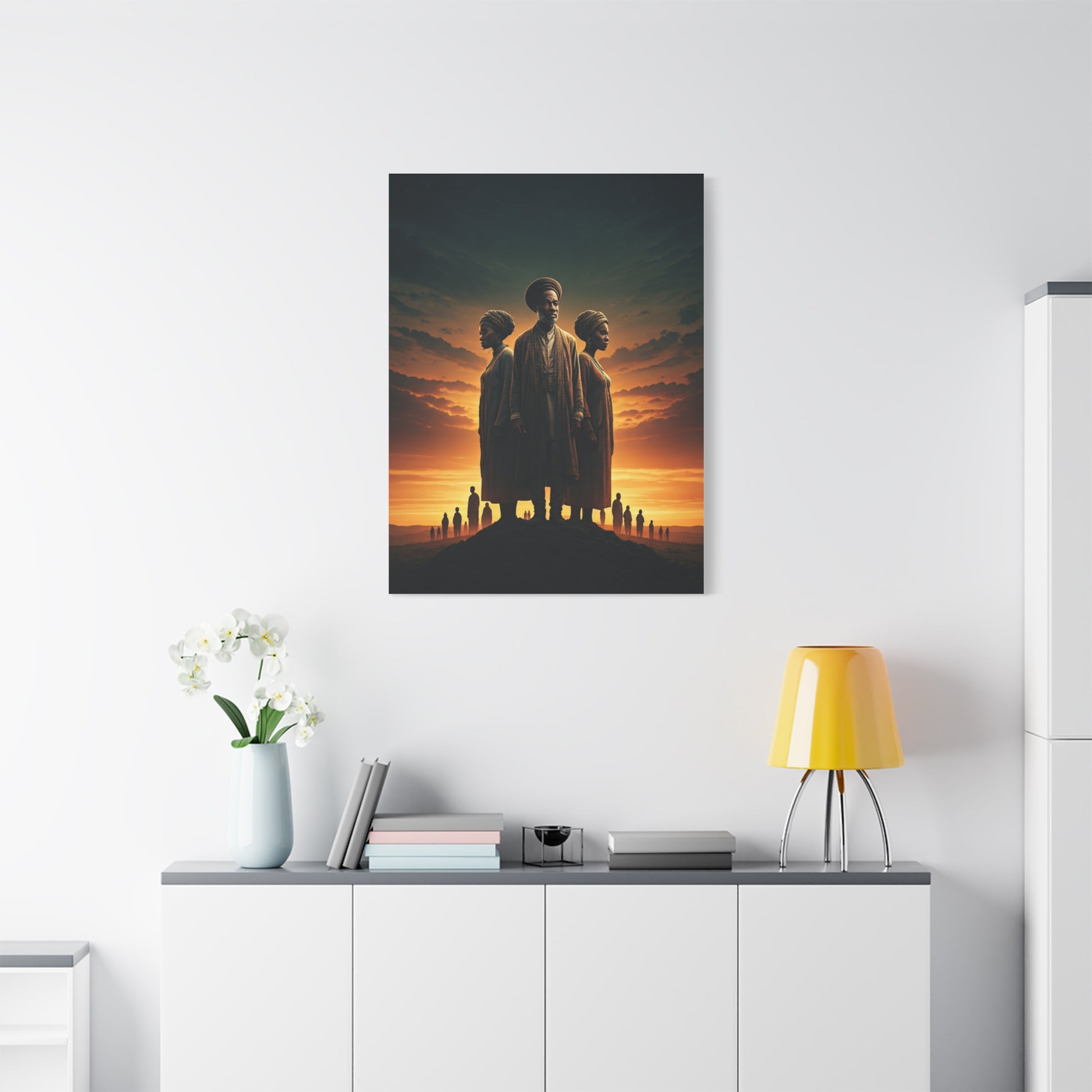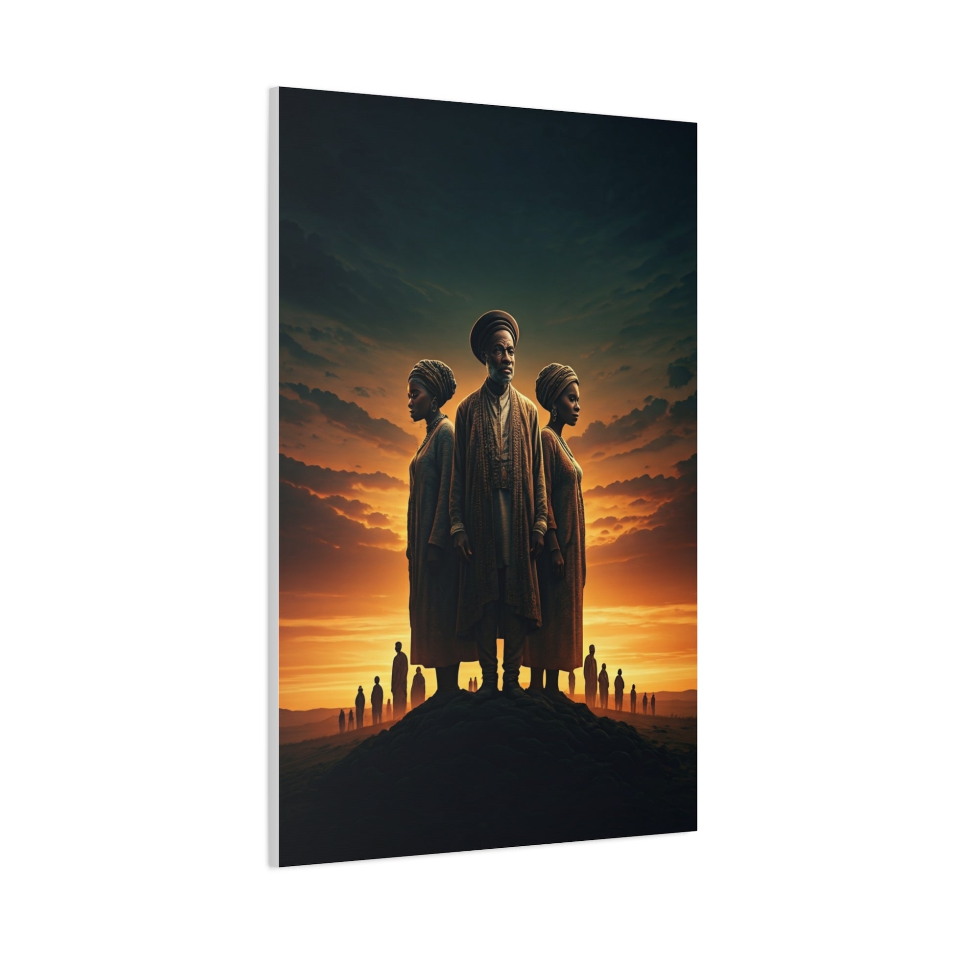 This breathtaking artwork honors heritage, unity, and the enduring strength of generations. Set against a glowing sunset sky, three central figures stand together in powerful symbolism—representing wisdom, balance, and cultural identity. The elder in the middle embodies guidance and ancestral knowledge, while the two women beside him reflect resilience, tradition, and the future carried forward. The silhouettes of distant people along the horizon add a sense of community, history, and shared journey. Rich golden tones and cinematic lighting make this piece deeply emotional and visually striking. Perfect for cultural spaces, inspirational décor, or anyone who values legacy and storytelling through art.