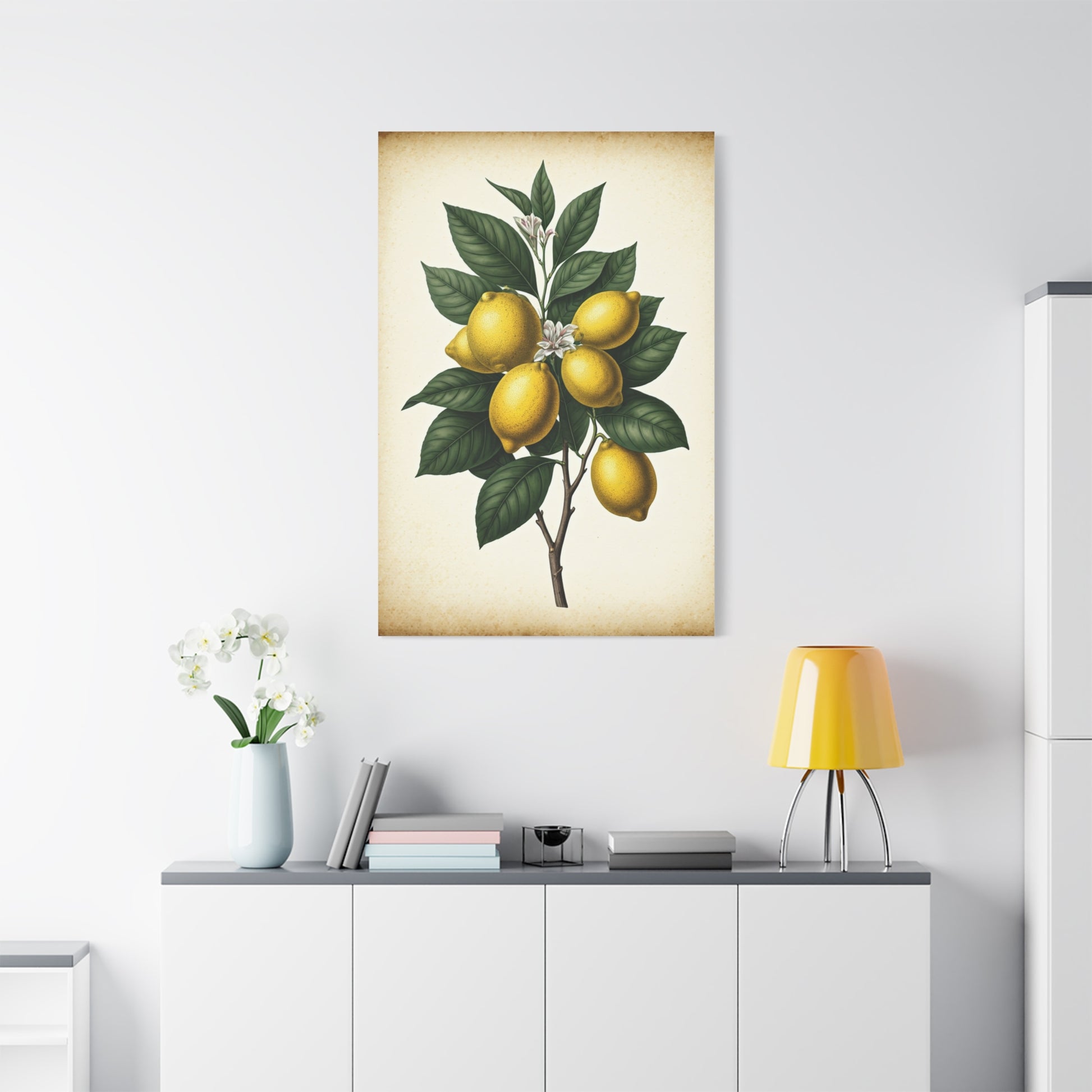 This artwork showcases bright yellow lemons hanging from a leafy branch, paired with delicate blossoms. The illustration combines freshness and elegance through its warm tones and precise detailing. Subtle textures enhance its traditional, archival style. The neutral background allows the vibrant fruit to stand out beautifully. Perfect for kitchens, cafés, or Mediterranean inspired spaces. A cheerful yet sophisticated addition to any wall.