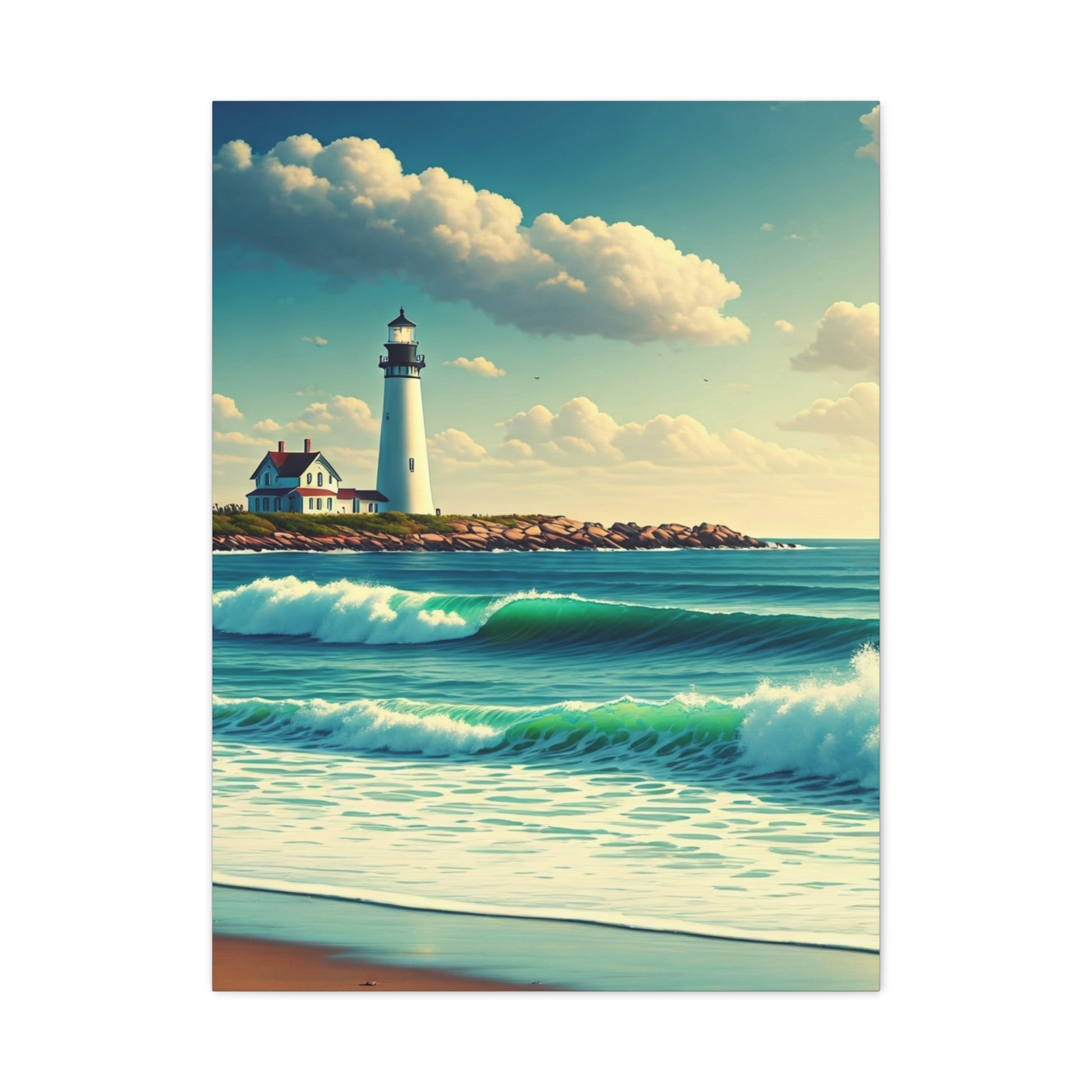 This uplifting coastal artwork features a tall lighthouse standing proudly along a rocky shore as bright waves roll beneath a sky of soft clouds. The peaceful seaside scene embodies guidance, hope, and timeless maritime charm. Perfect for coastal-themed interiors, nautical décor lovers, or airy modern spaces, this piece brings freshness, light, and a sense of calm seaside adventure into your home.