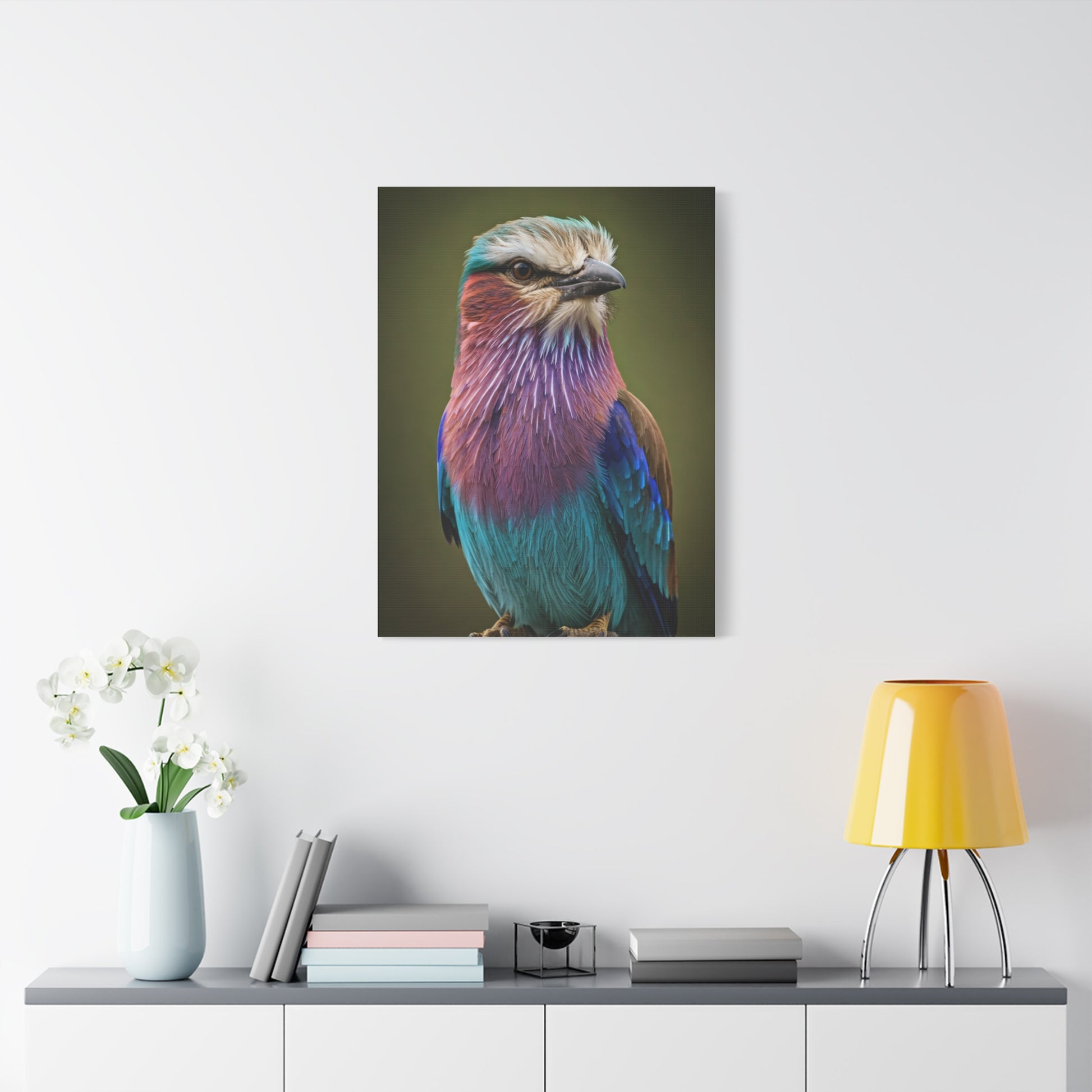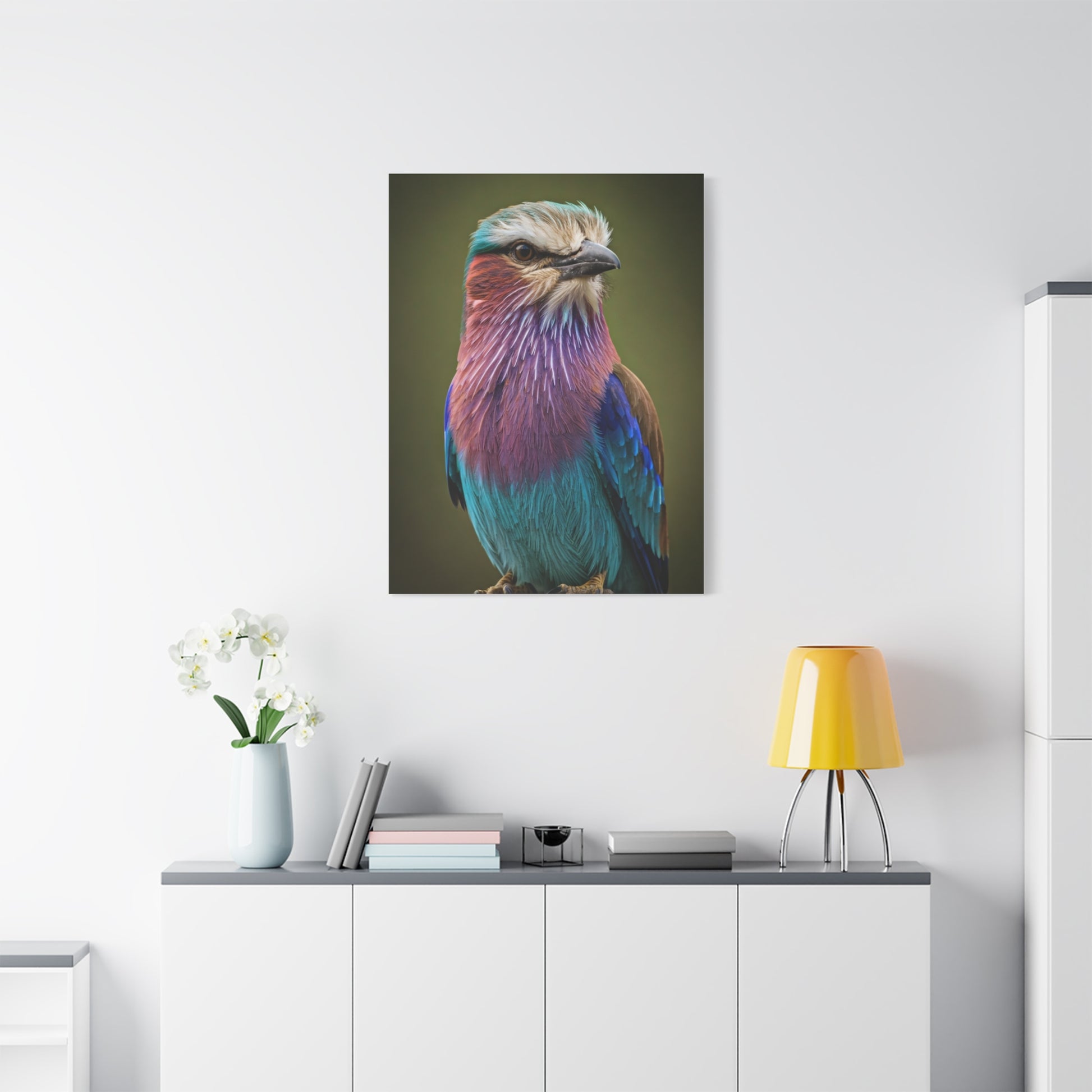 A breathtaking close-up of the lilac-breasted roller, showcasing its stunning blend of purple, turquoise, and soft blue tones. The smooth gradient background allows the vibrant plumage to stand out with remarkable clarity. Fine details in the feathers and subtle lighting create a lifelike and peaceful presence. Ideal for modern homes or offices, this artwork brings color, elegance, and a touch of the wild indoors.