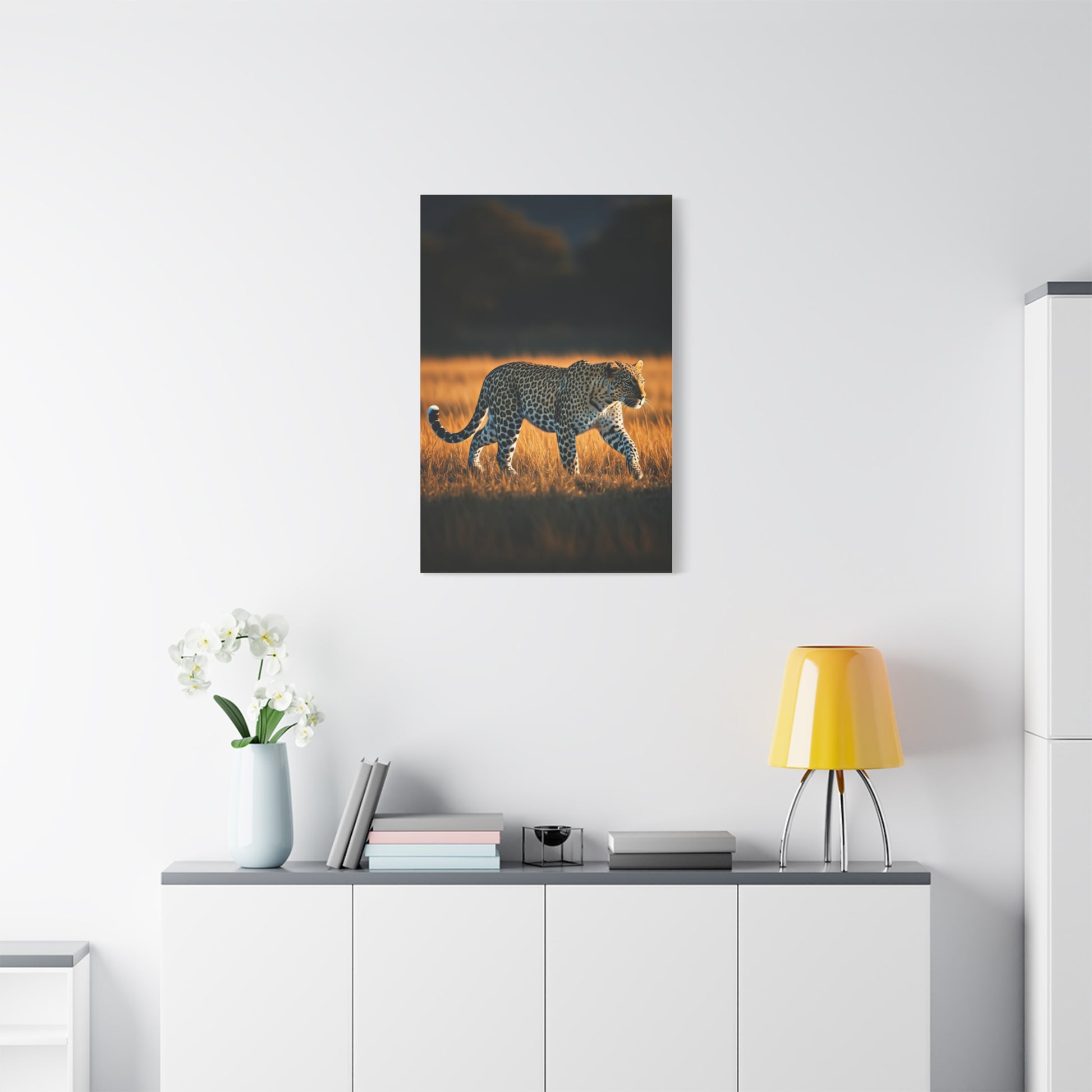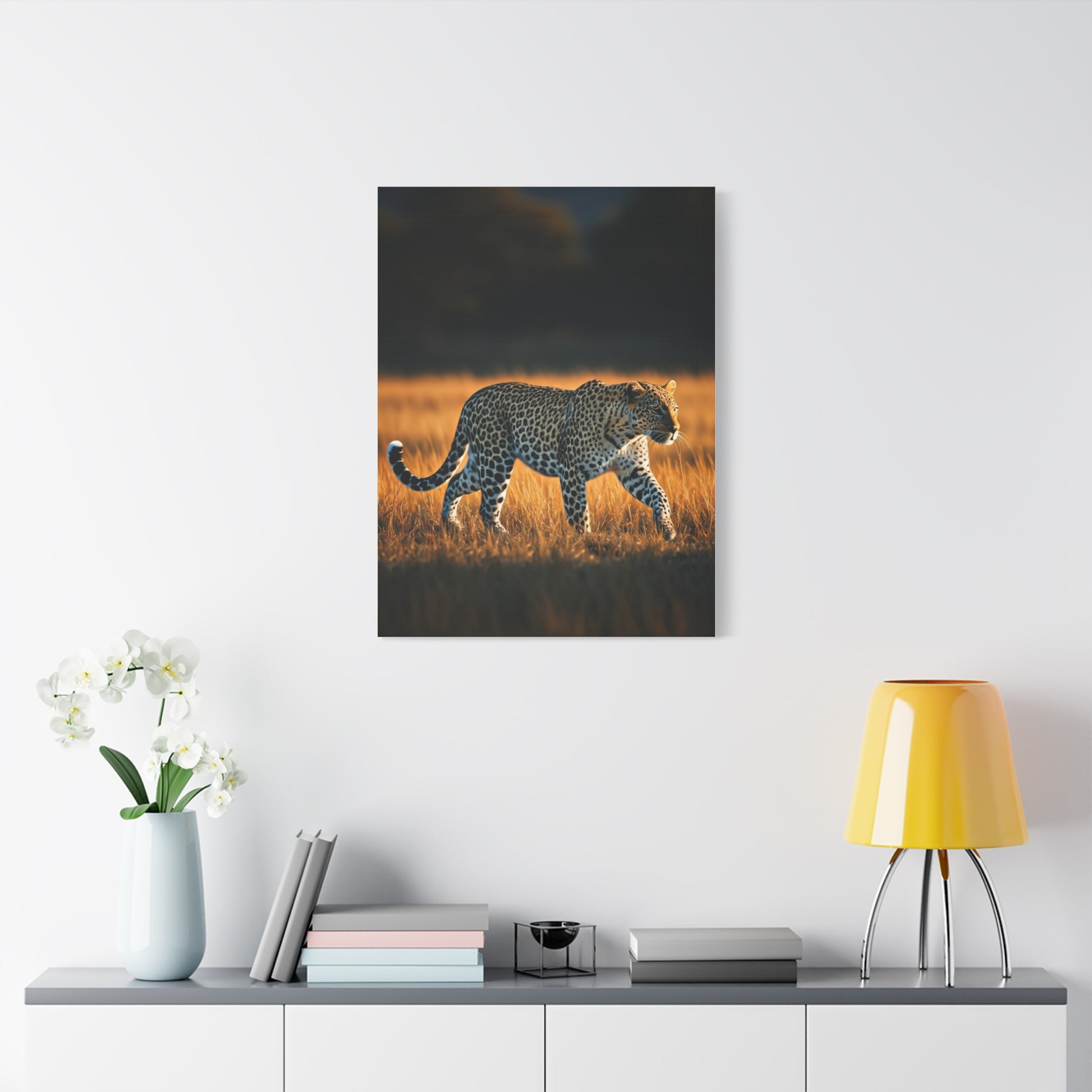 This striking wall art portrays a graceful cheetah moving silently through golden savannah grass under a moody dramatic sky. The contrast between elegance and strength creates a sense of focus, freedom, and untamed spirit. Perfect for modern décor, wildlife lovers, or spaces that celebrate nature’s most powerful predators.