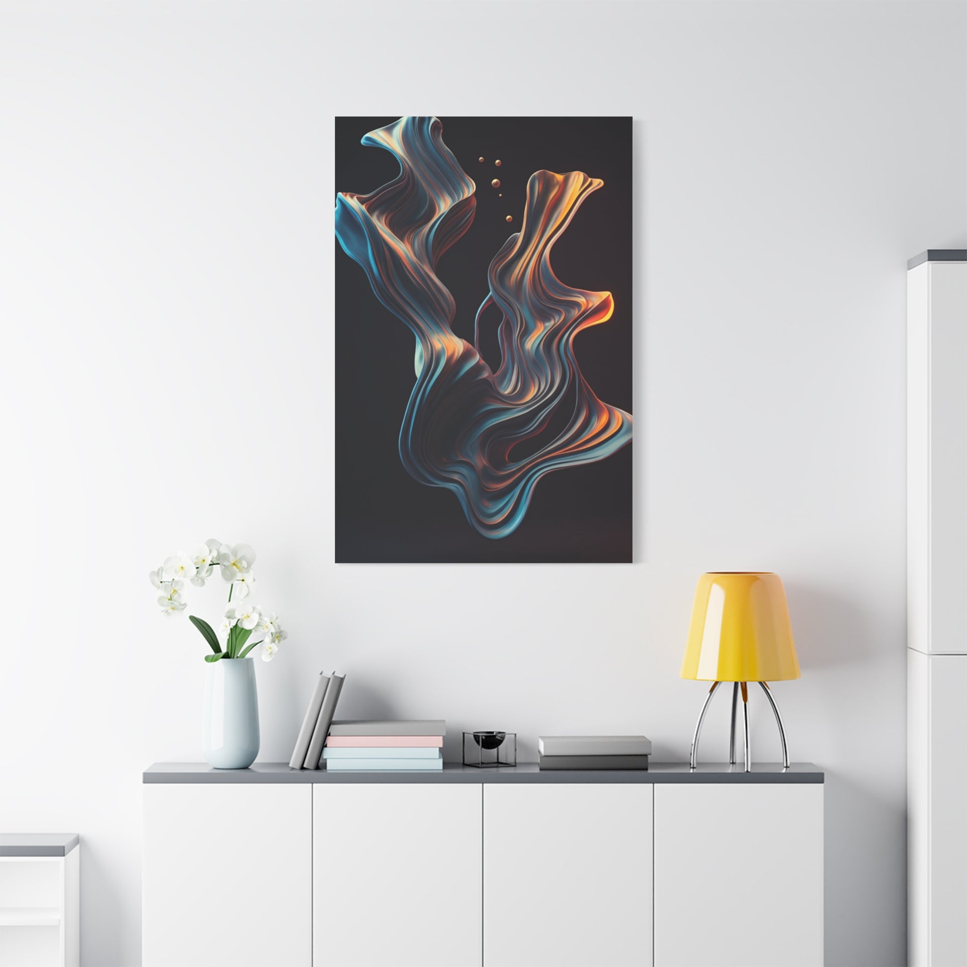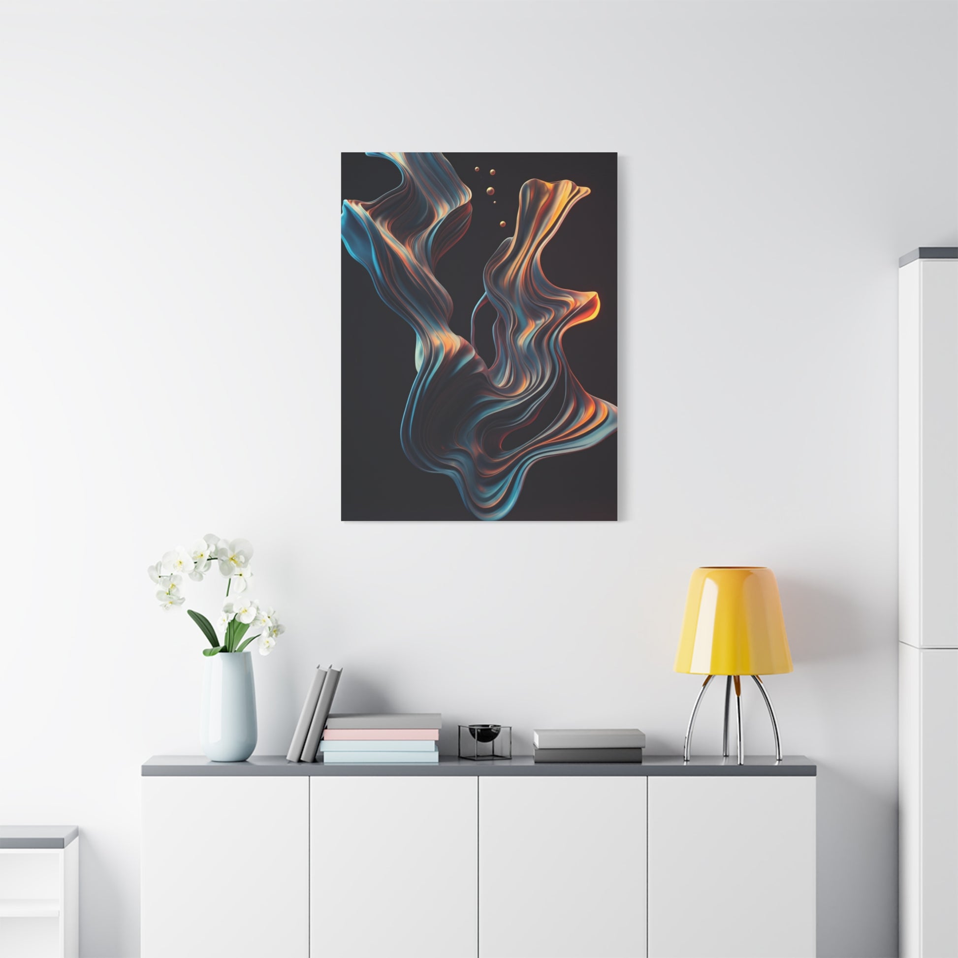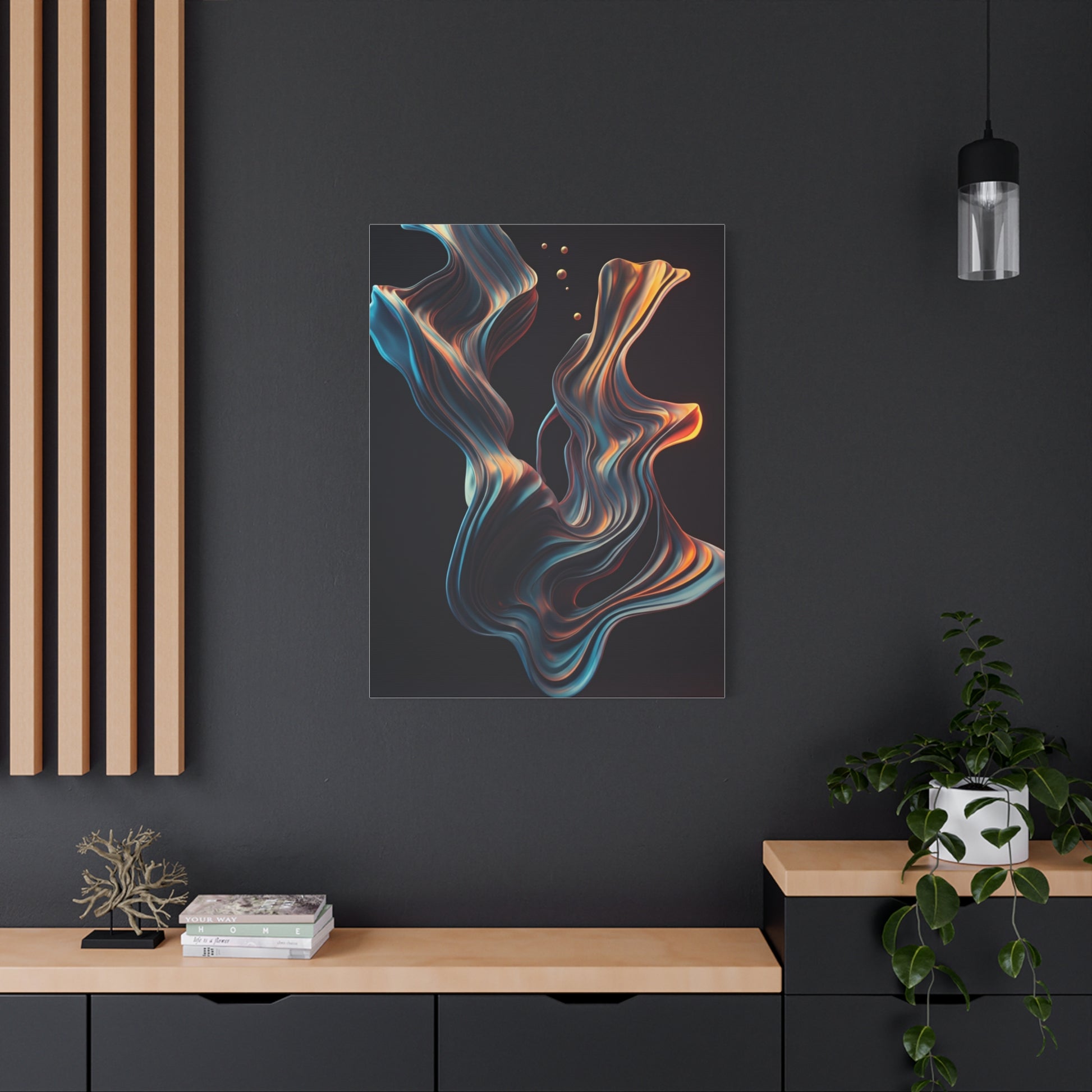 Luminous Flow captures fluid motion through layered ribbon-like forms that twist gracefully across a dark backdrop. Accents of gold and blue add contrast and luxury, giving the artwork a dynamic yet polished feel. A striking choice for modern homes, offices, or statement-focused interiors.