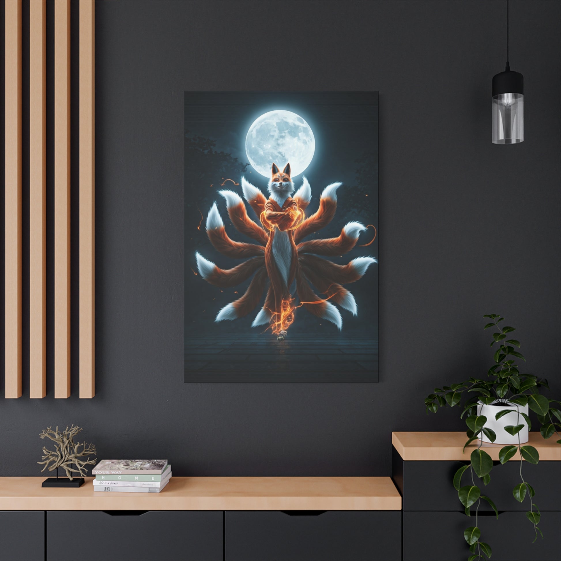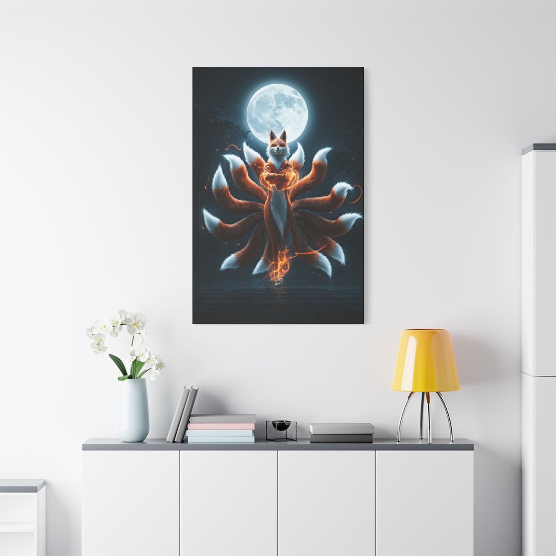 A mystical fox spirit stands beneath a glowing full moon, its multiple flowing tails radiating elegance and supernatural energy. The soft lighting, balanced composition, and dreamlike atmosphere give the artwork a sense of wisdom, protection, and enchantment. This piece blends fantasy and tranquility, making it perfect for artistic interiors or spaces that celebrate imagination and myth. It represents guidance, intuition, and the beauty of unseen worlds.