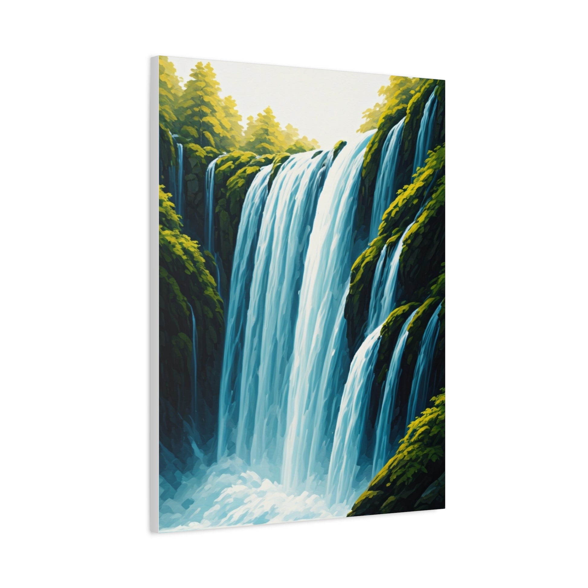 This tranquil waterfall artwork captures cascading water flowing through a lush green forest, creating a peaceful and refreshing atmosphere. The soft mist and layered foliage add depth and natural beauty, making this piece ideal for living rooms, bedrooms, or spa-inspired interiors. A perfect choice for bringing calm, balance, and the beauty of nature into your home.