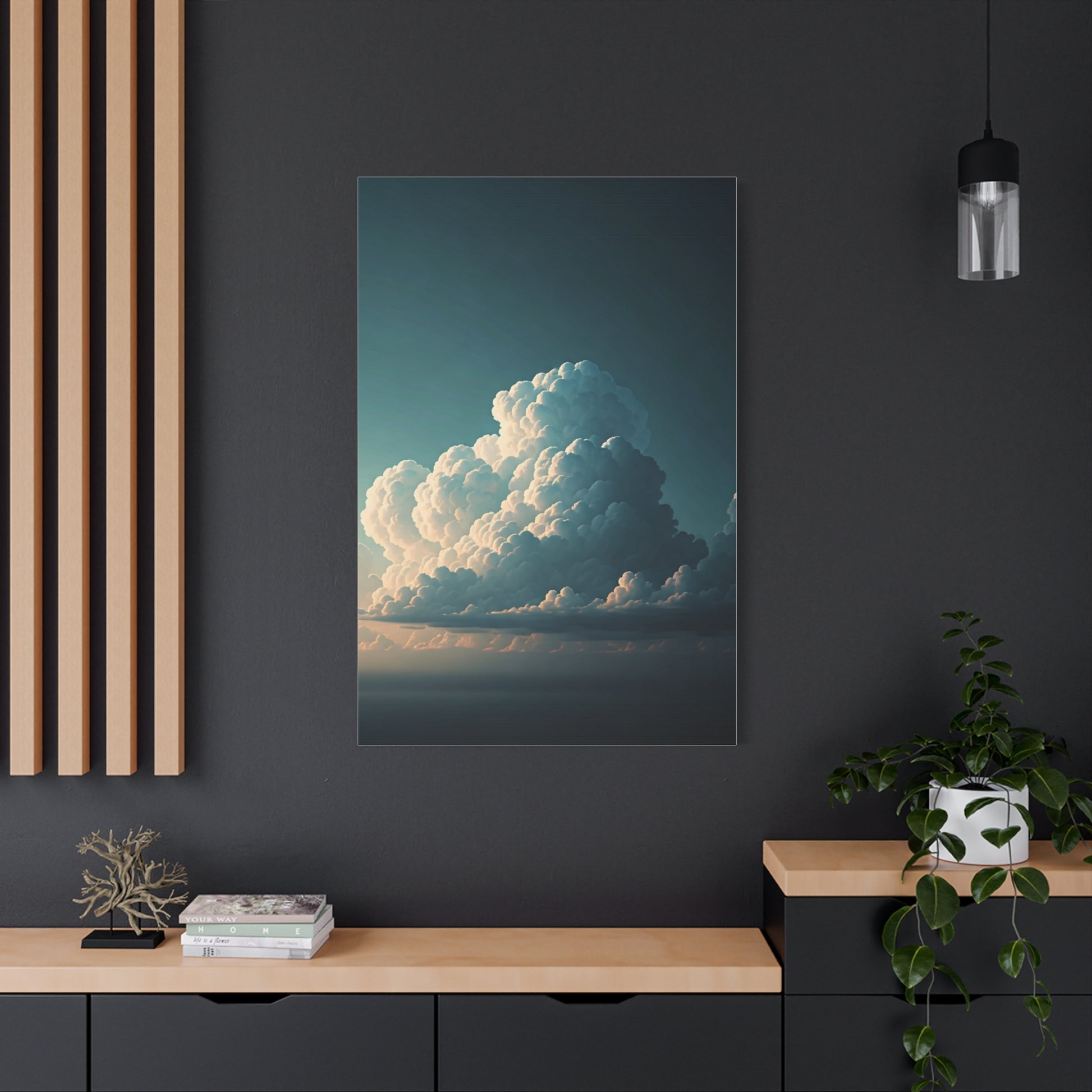 This breathtaking artwork features towering, billowing clouds rising above a quiet horizon, bathed in soft natural light. The sense of scale and serenity makes it an inspiring piece for modern interiors, creative spaces, or rooms seeking a calm yet powerful presence.