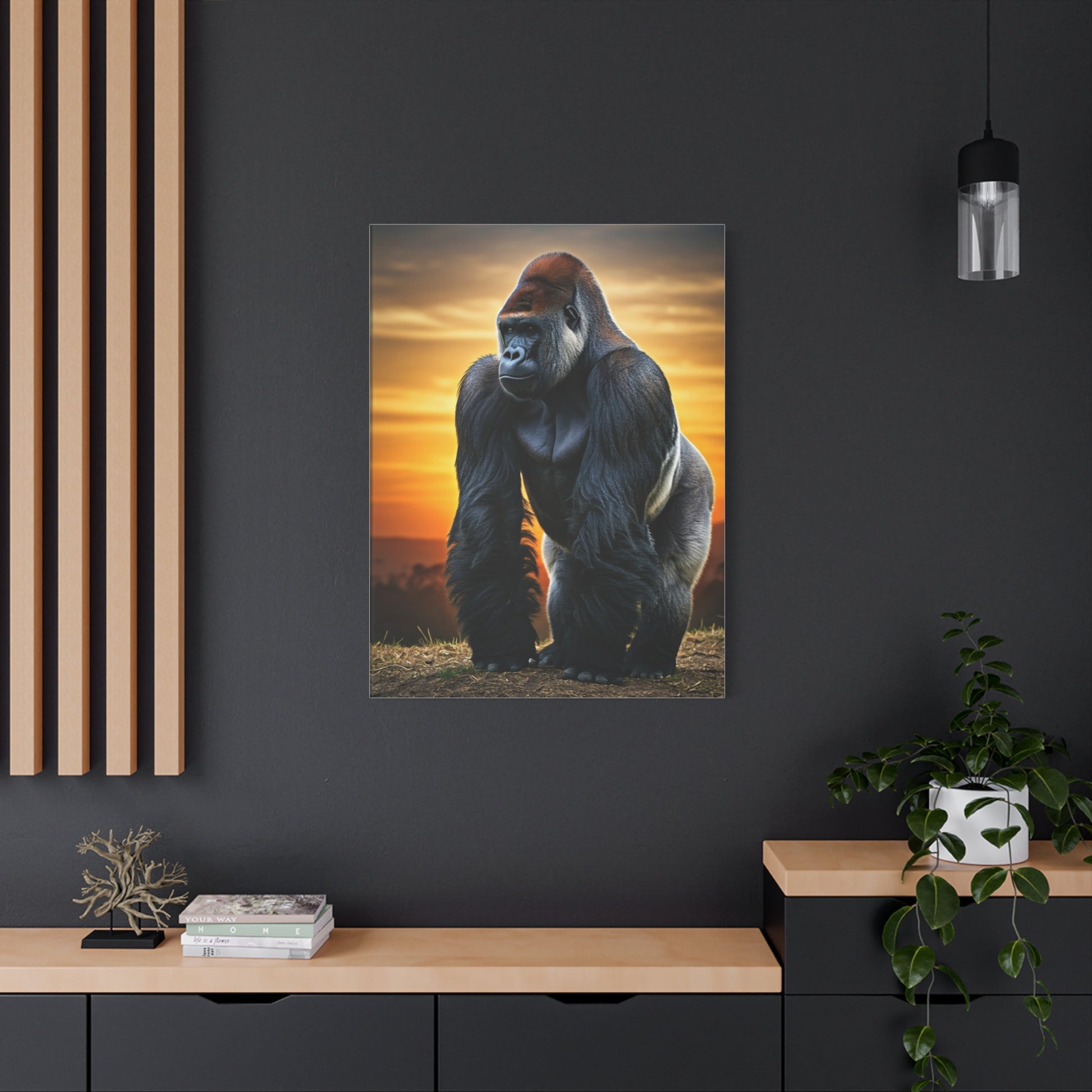 This powerful wildlife portrait captures a majestic gorilla standing in commanding silence beneath a glowing sunset sky. The dramatic lighting and lifelike detail symbolize strength, wisdom, and raw natural power. A bold statement piece for modern interiors, safari-inspired décor, or anyone drawn to the spirit of untamed wilderness.