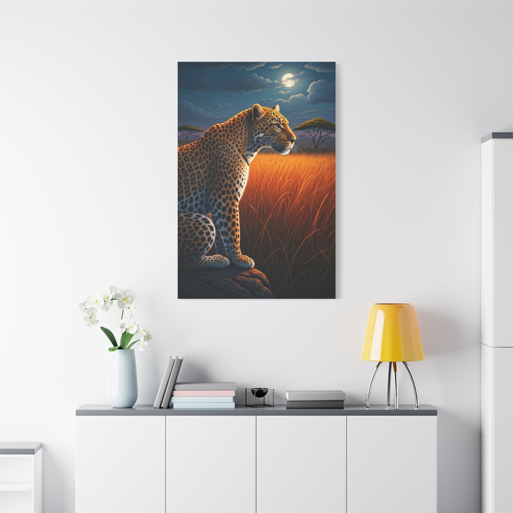This striking wildlife artwork features a powerful leopard resting in tall savannah grass under a moonlit dusk sky. The rich contrast of golden fur and deep blue atmosphere creates a mood of elegance, mystery, and untamed strength. Perfect for safari-themed décor, bold modern interiors, or animal art collectors.