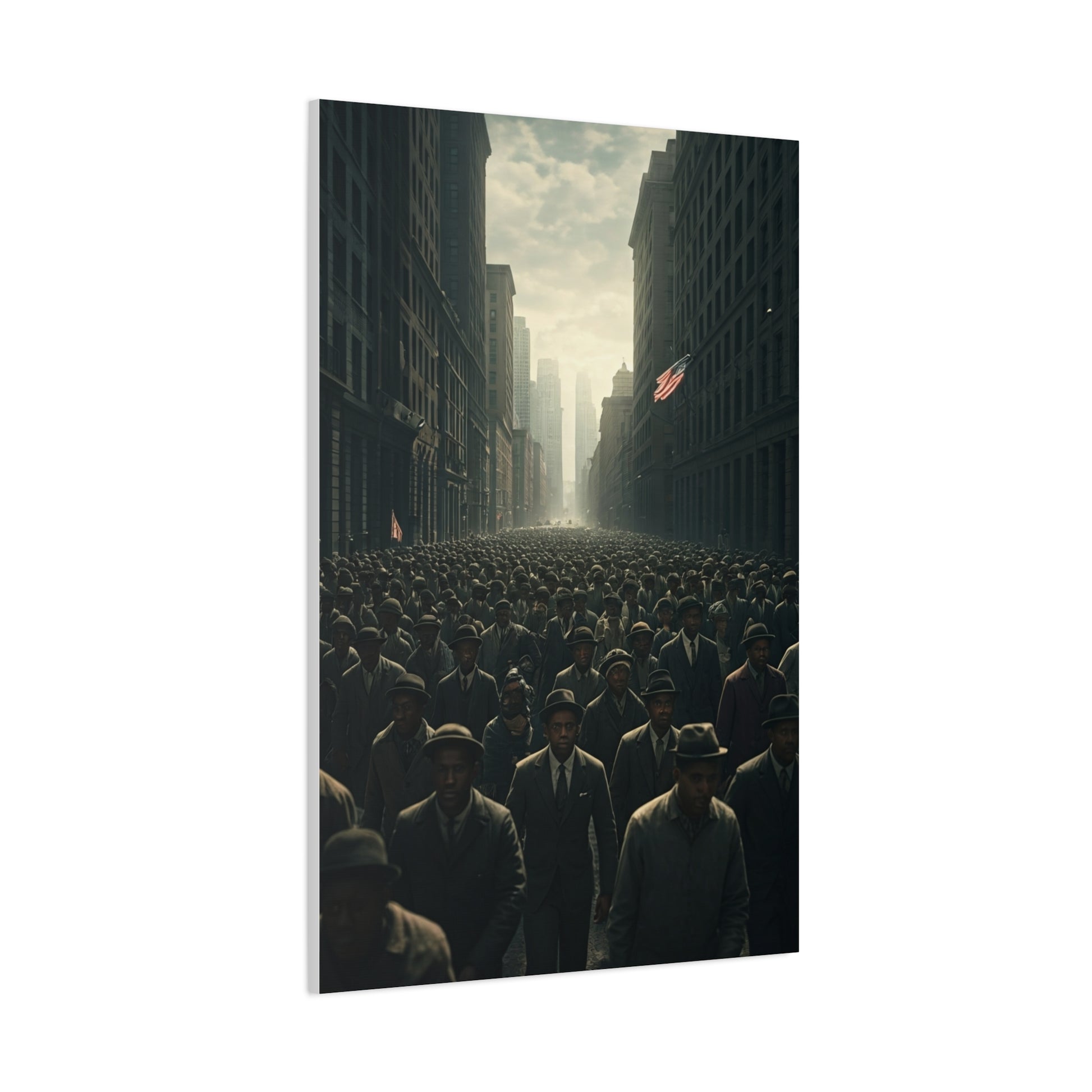 This expansive cityscape artwork captures a vast crowd moving forward through towering streets, creating a powerful visual metaphor for unity, momentum, and shared purpose. Muted earth tones and soft atmospheric light lend the scene a timeless, historical quality, while the depth of perspective draws the viewer into the movement itself. The composition balances individuality and collectiveness, making it both emotional and thought-provoking. Ideal for large walls or statement spaces, this piece reflects resilience, solidarity, and the weight of collective journeys.