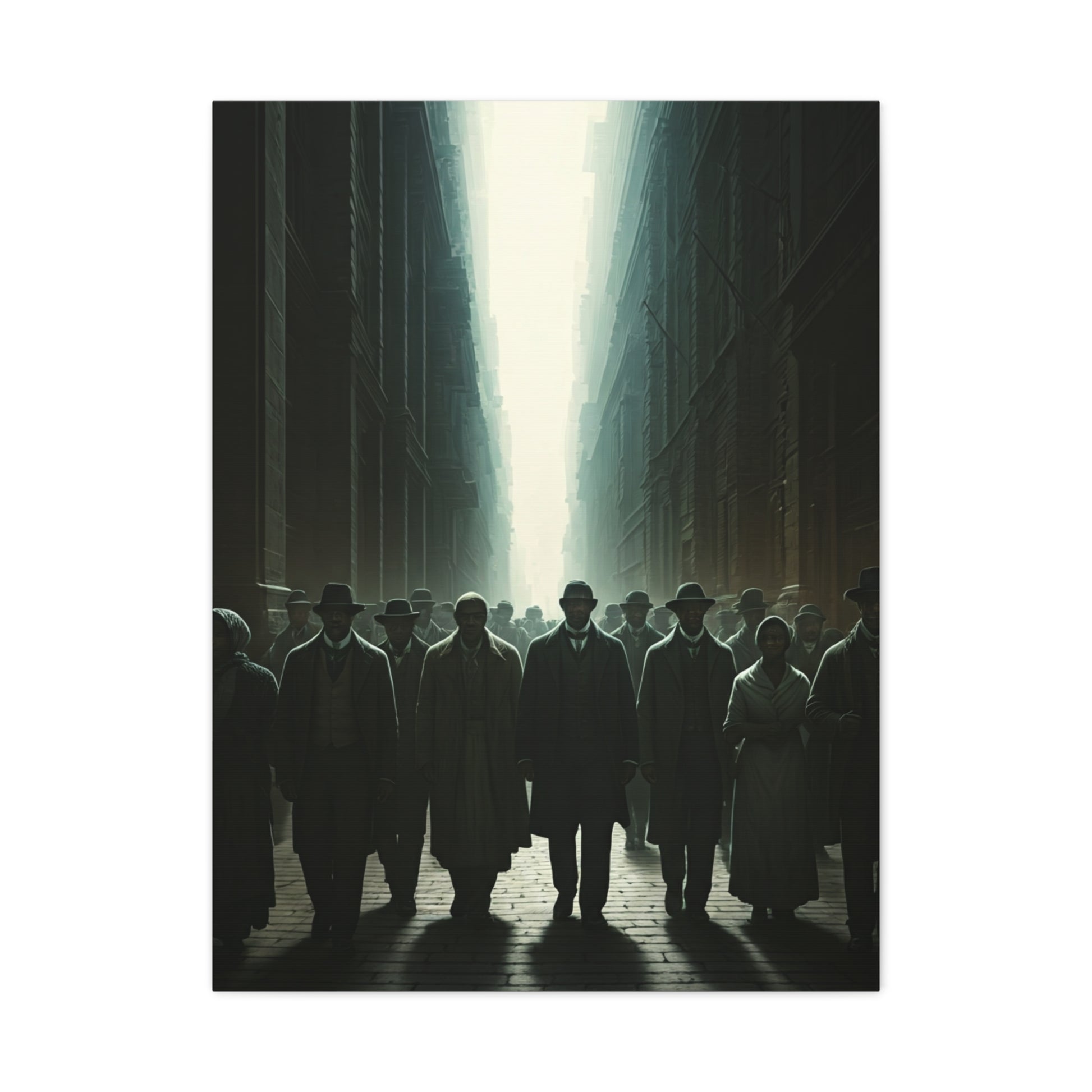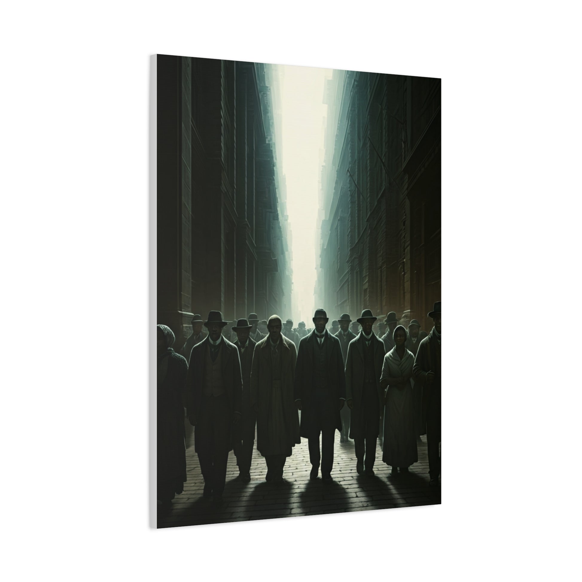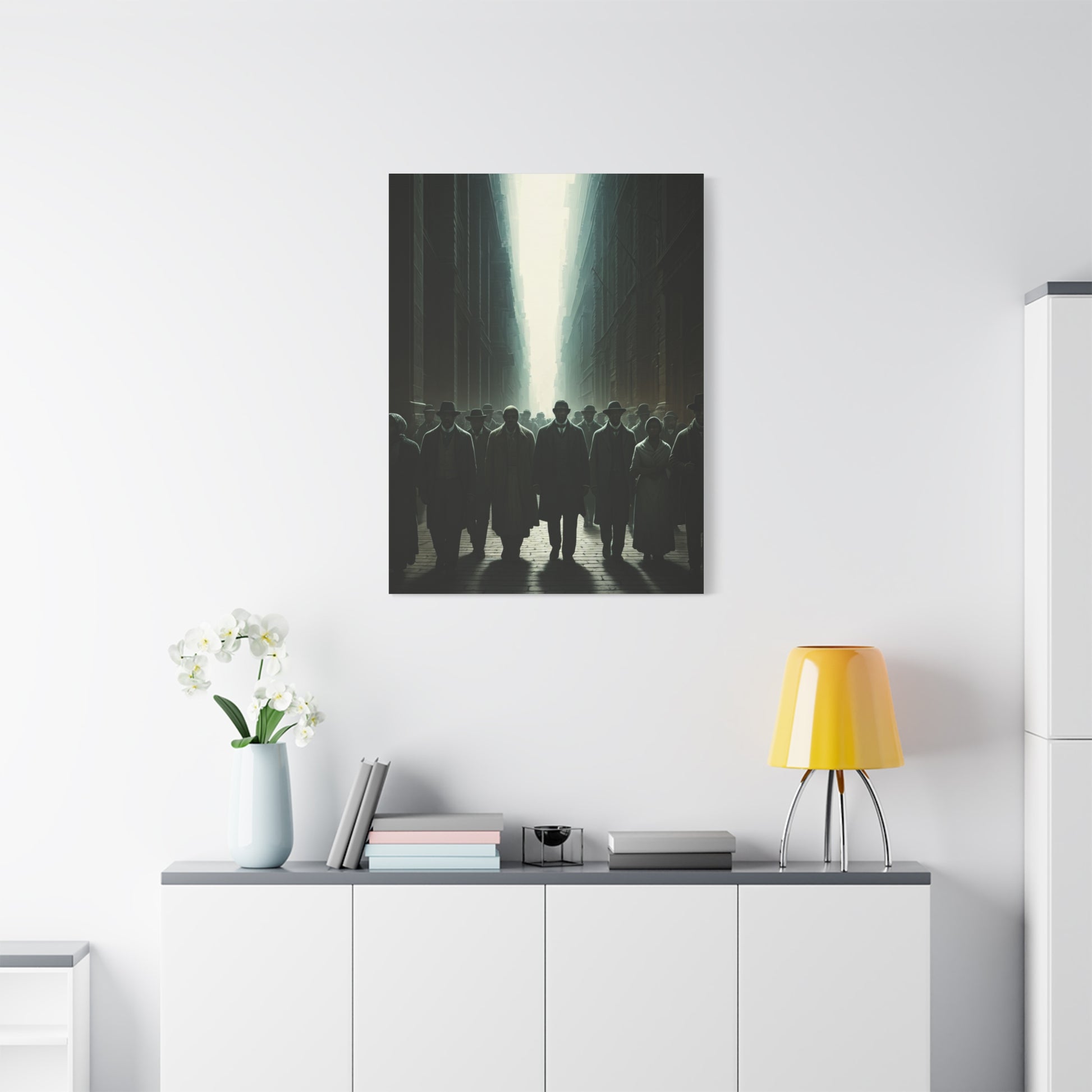 This dramatic scene captures a unified group moving forward through towering structures as a beam of light breaks through the darkness ahead. The silhouettes emphasize collective strength, momentum, and shared resolve. Strong contrast between shadow and illumination creates a cinematic sense of urgency and hope. The depth and scale of the architecture enhance the feeling of progress and purpose. Perfect for modern, motivational, or conceptual interiors, this artwork serves as a bold visual statement about unity, perseverance, and forward movement.