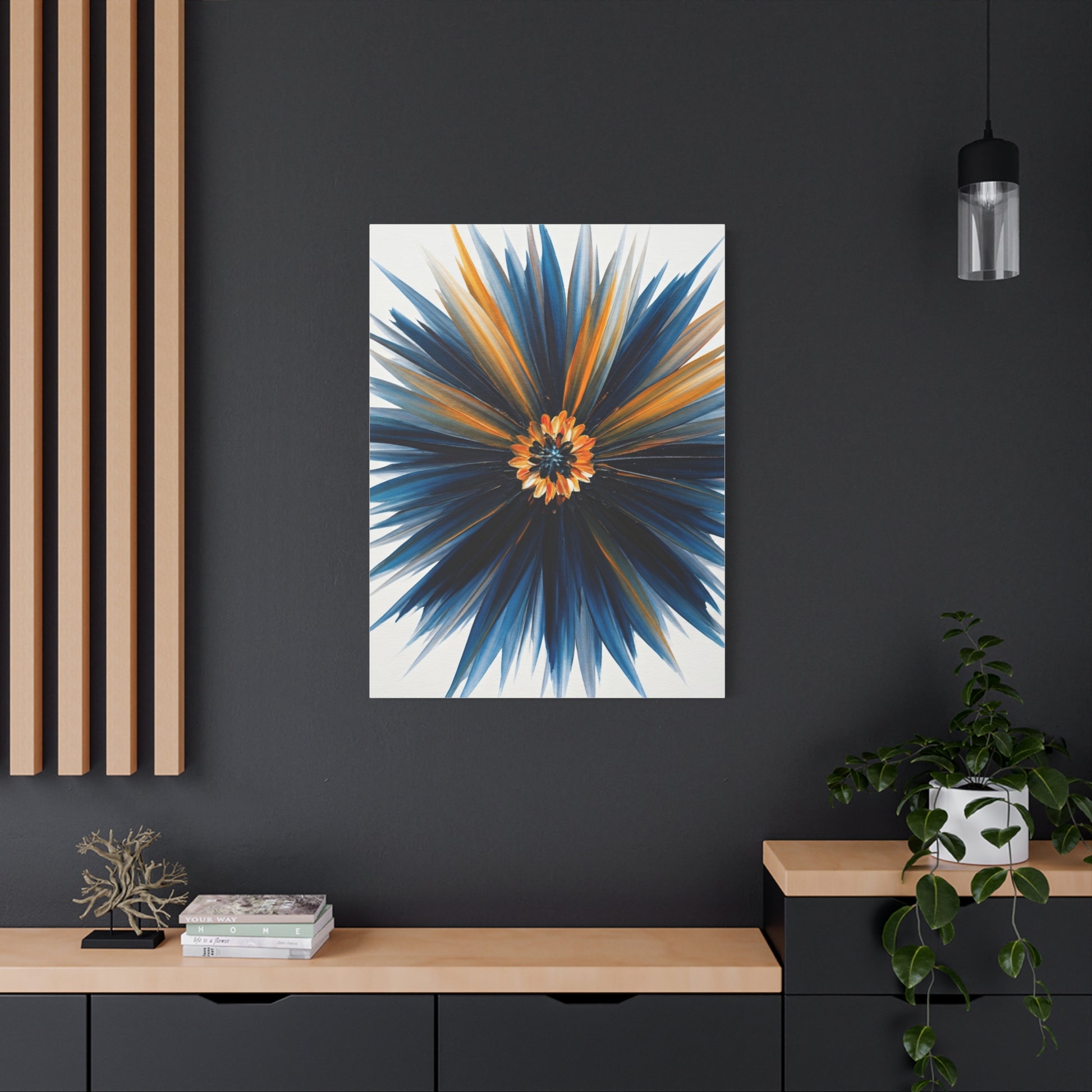 This captivating abstract artwork showcases a dramatic floral burst with deep midnight blues radiating outward, contrasted by a glowing amber and gold core that draws the eye inward. Sharp, layered brushstrokes create a sense of motion and depth, blending calm cool tones with a warm, luminous center for a striking visual balance. Ideal for modern, contemporary, or artistic interiors, this piece adds sophistication and bold character to living rooms, bedrooms, offices, or creative spaces, making it a powerful statement artwork that feels both elegant and dynamic.
