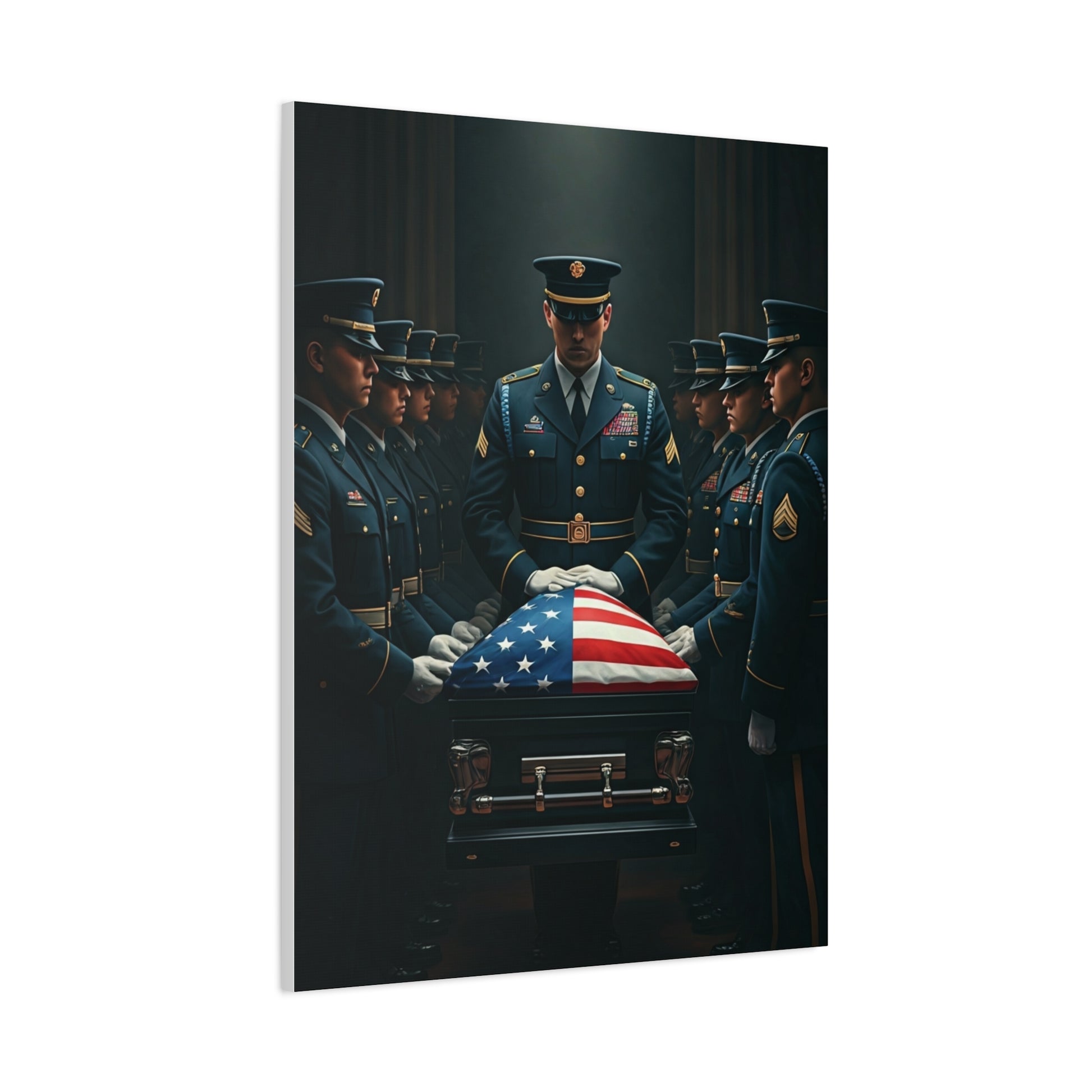 This emotional and respectful artwork depicts a uniformed soldier standing in solemn tribute beside a flag-draped casket, honoring sacrifice and service. With a cinematic atmosphere and deep symbolism, this piece is a meaningful centerpiece for remembrance spaces, veterans’ halls, or patriotic home décor.