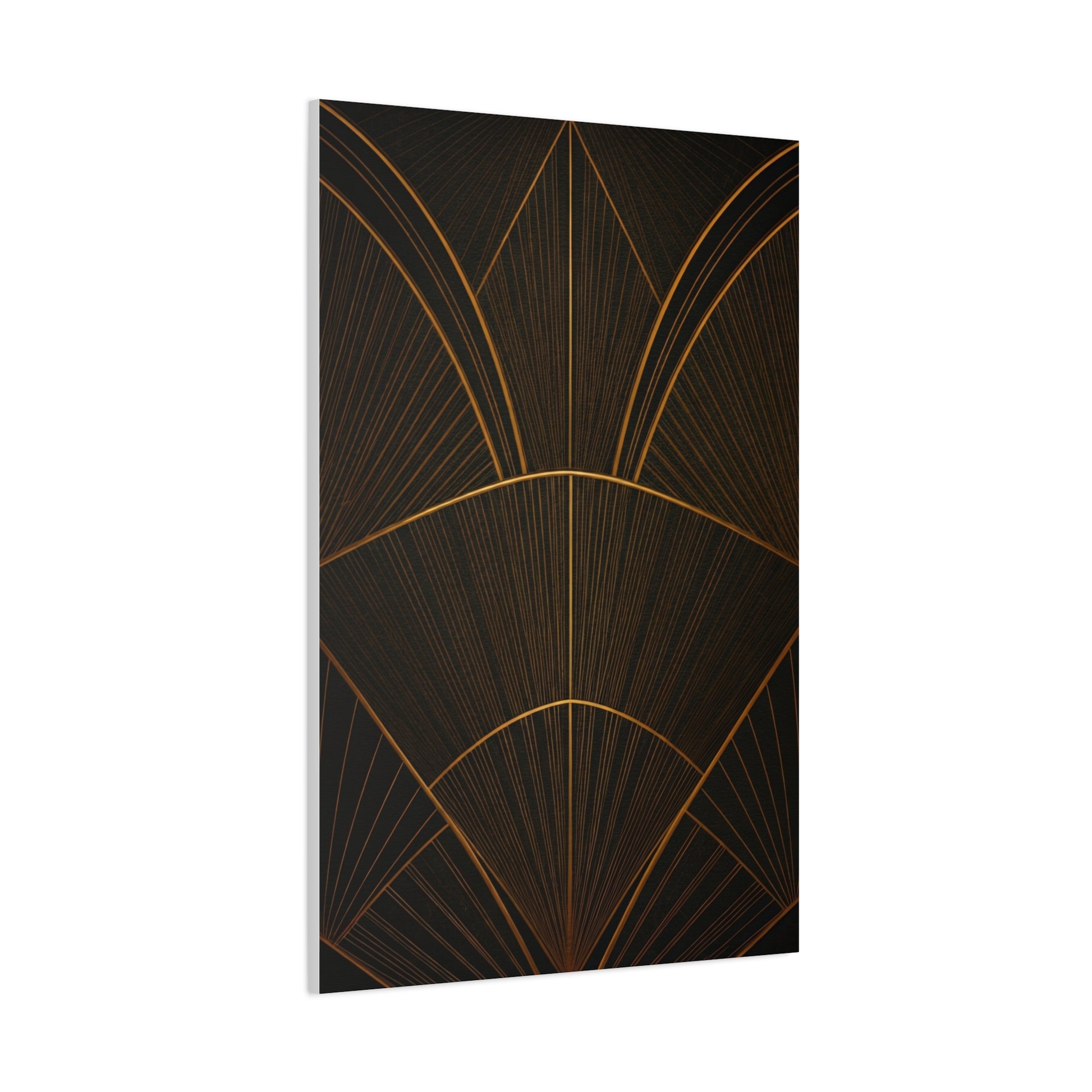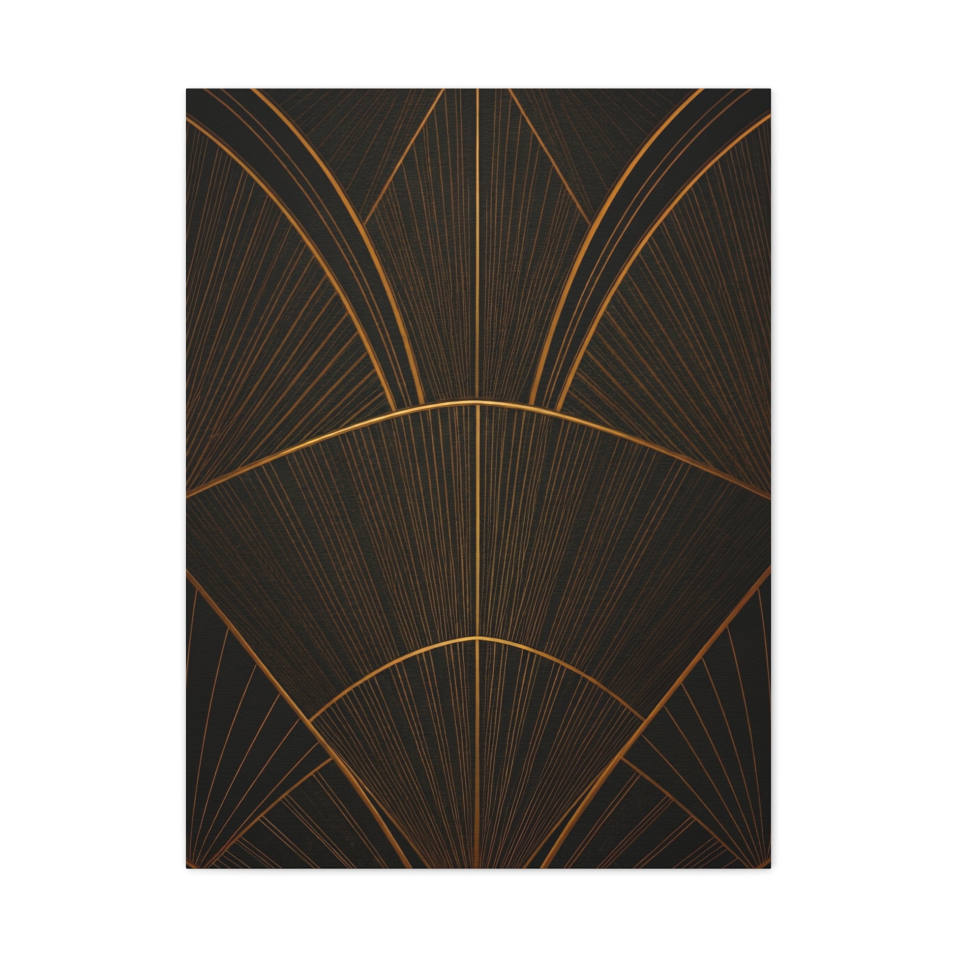 A refined celebration of Art Deco simplicity, this abstract fan-inspired composition features warm golden curves and symmetrical geometry on a matte black background. The clean lines and subtle radiance create a luxurious yet modern atmosphere, making it a perfect accent for minimalist interiors, sophisticated offices, or contemporary spaces that appreciate elegant design without excess.