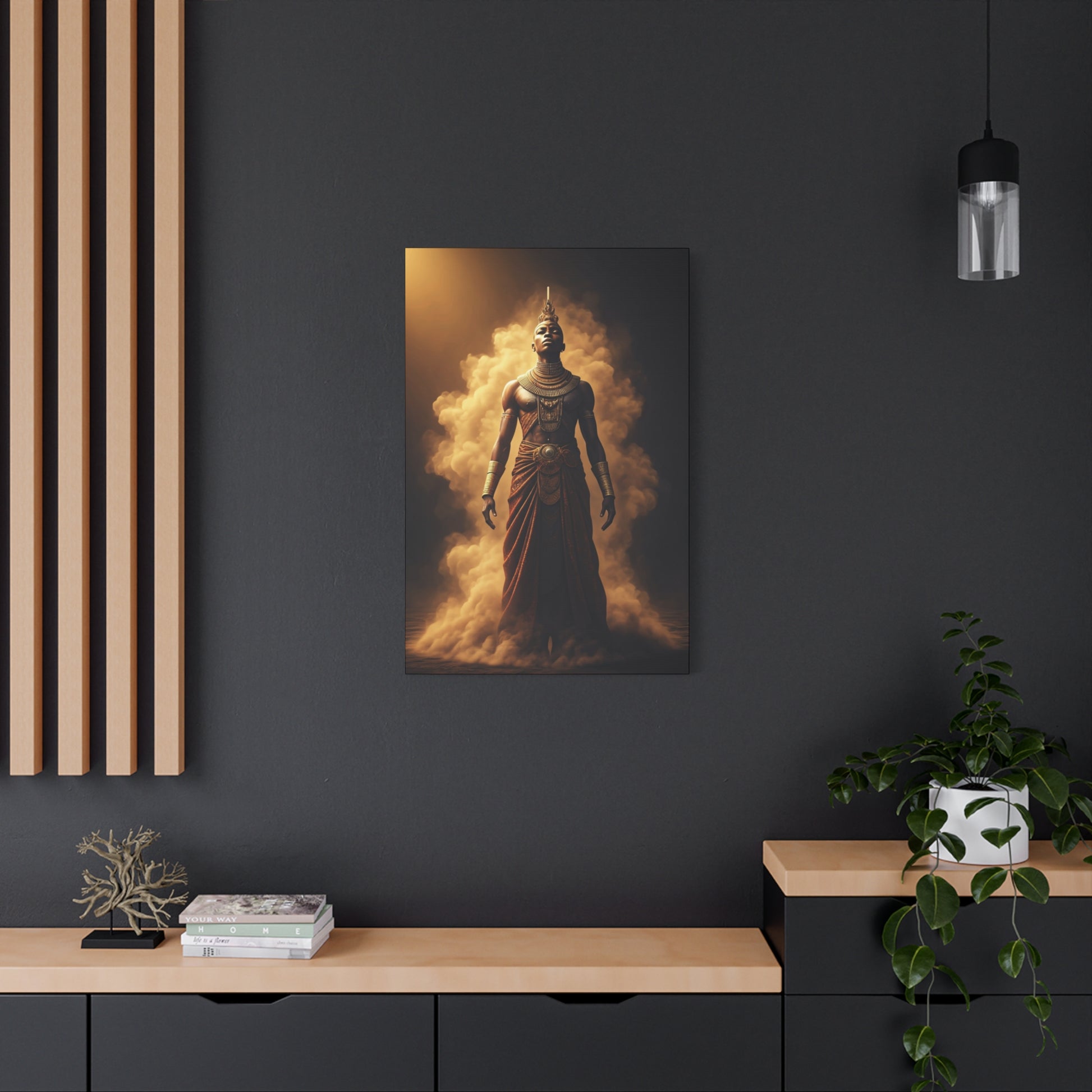 This captivating artwork portrays a powerful warrior figure emerging through swirling golden mist, symbolizing mystery, strength, and spiritual resilience. The dramatic lighting and timeless silhouette create an atmosphere of legend and ancestral pride. Perfect for bold interiors, statement décor, or anyone drawn to heroic and cinematic cultural artistry.