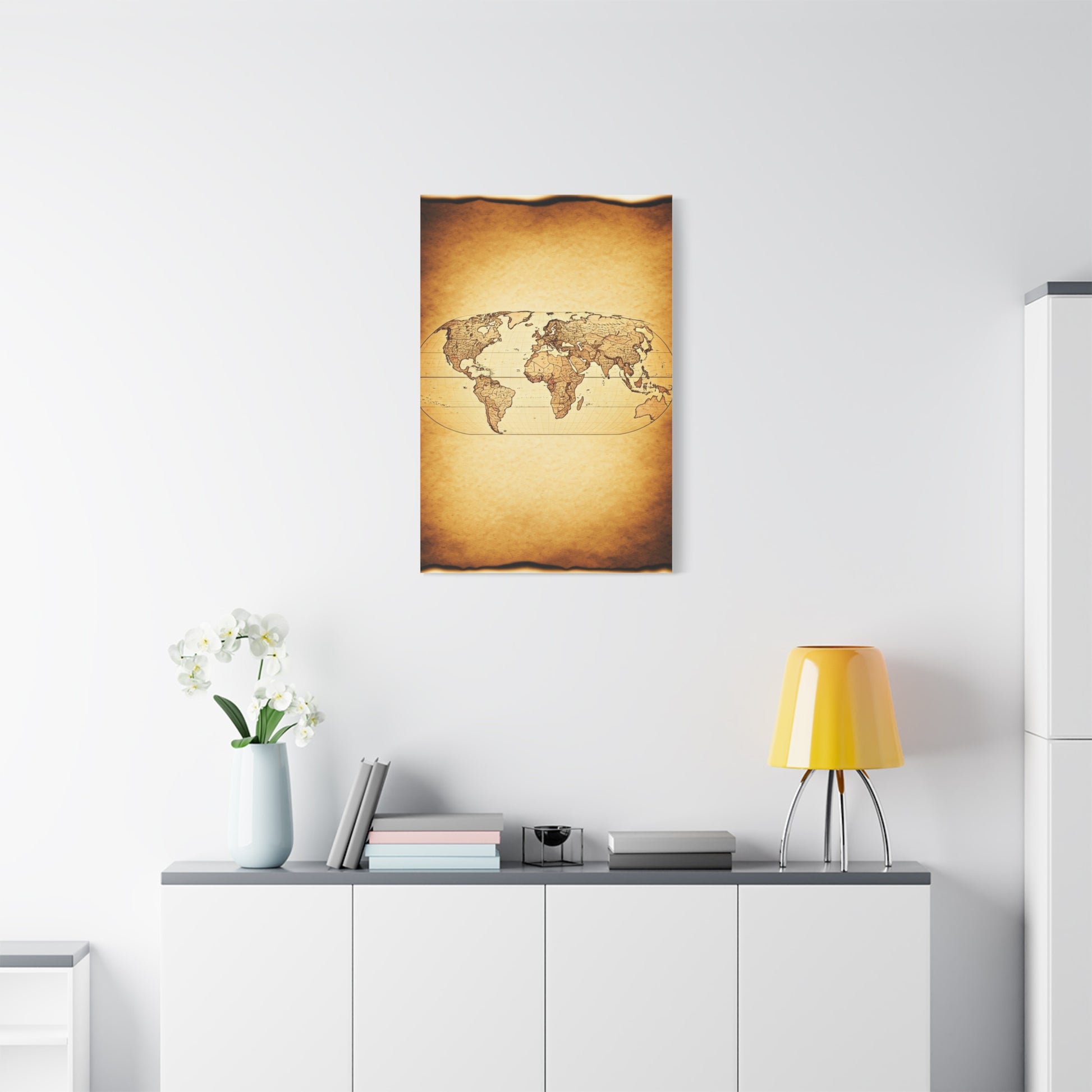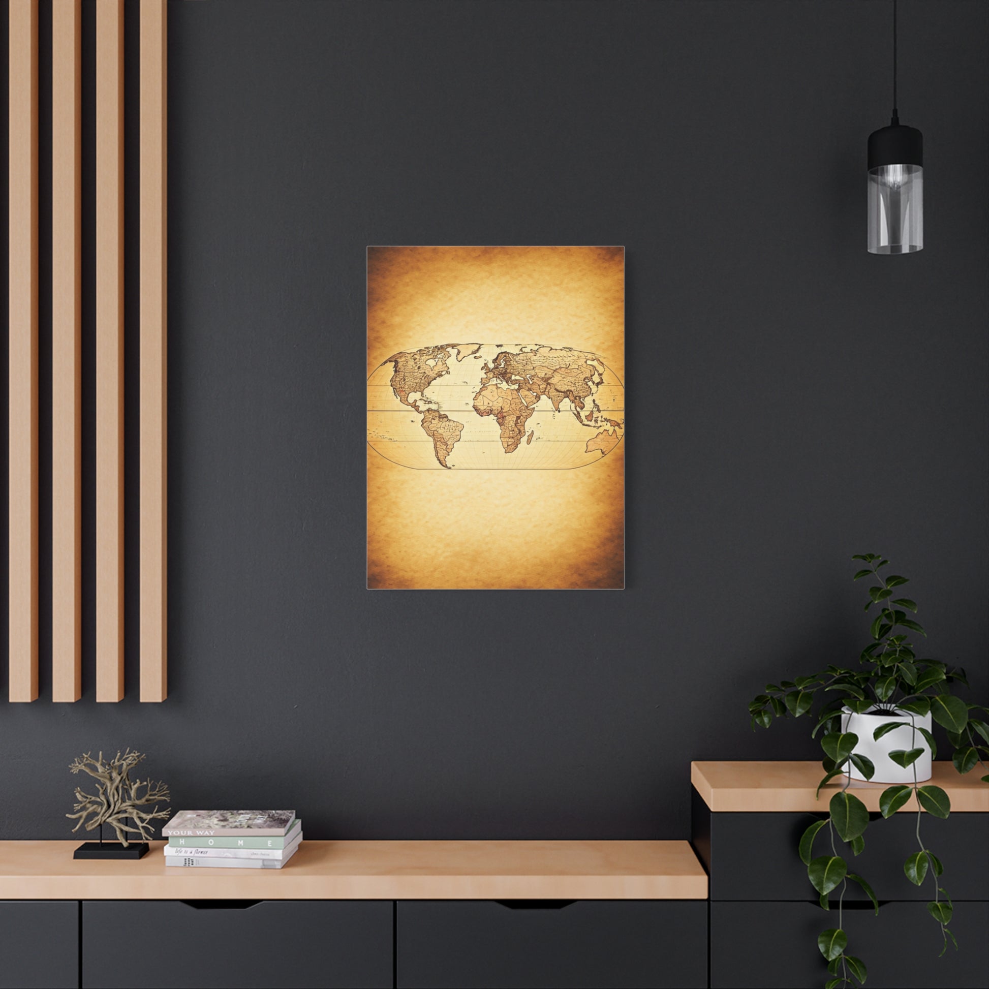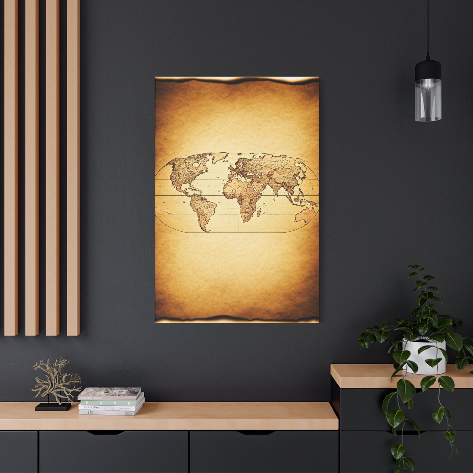 A unique blend of antique parchment tones with a bold black world silhouette overlay. This piece combines vintage warmth with modern simplicity, making it perfect for contemporary homes, offices, or minimalist travel décor.