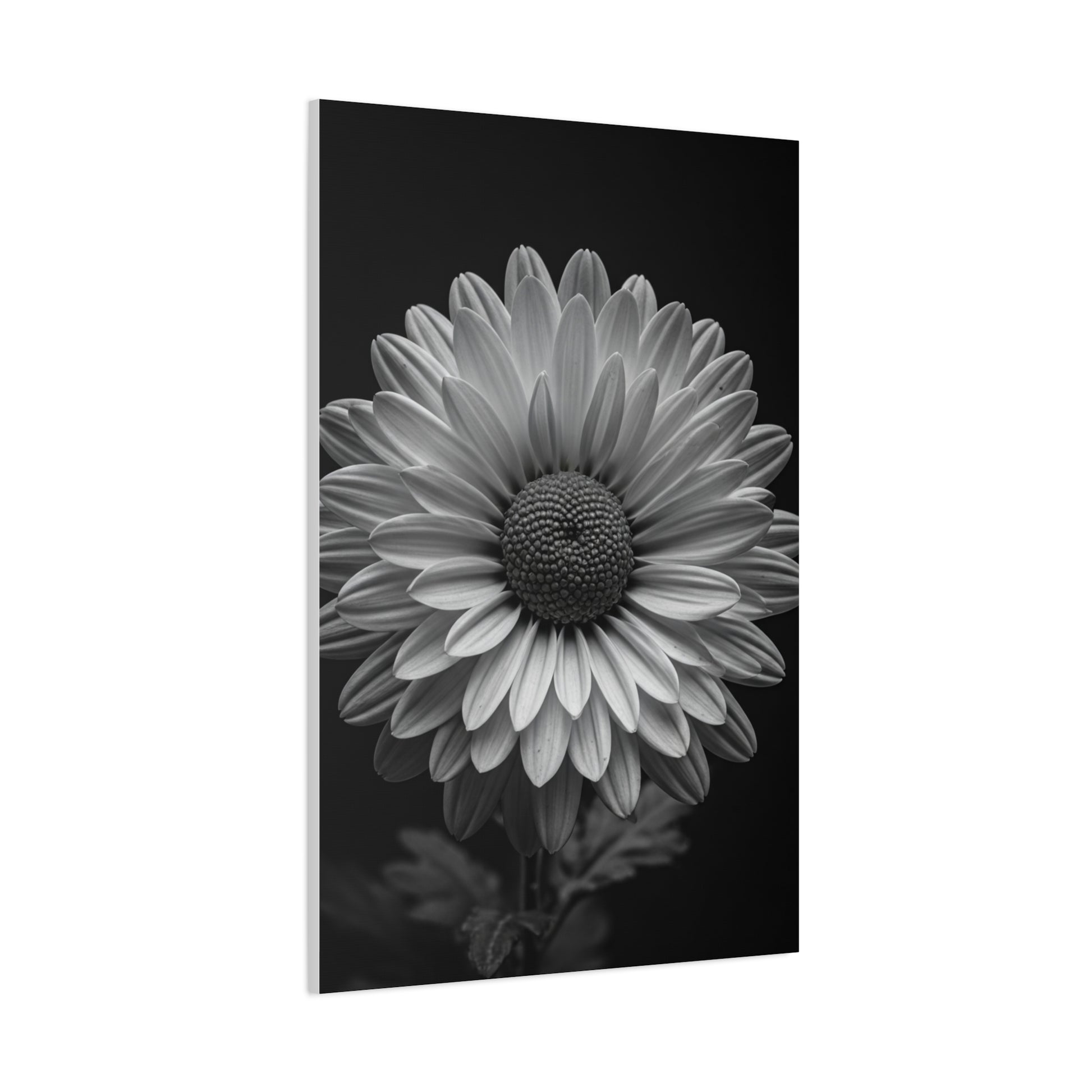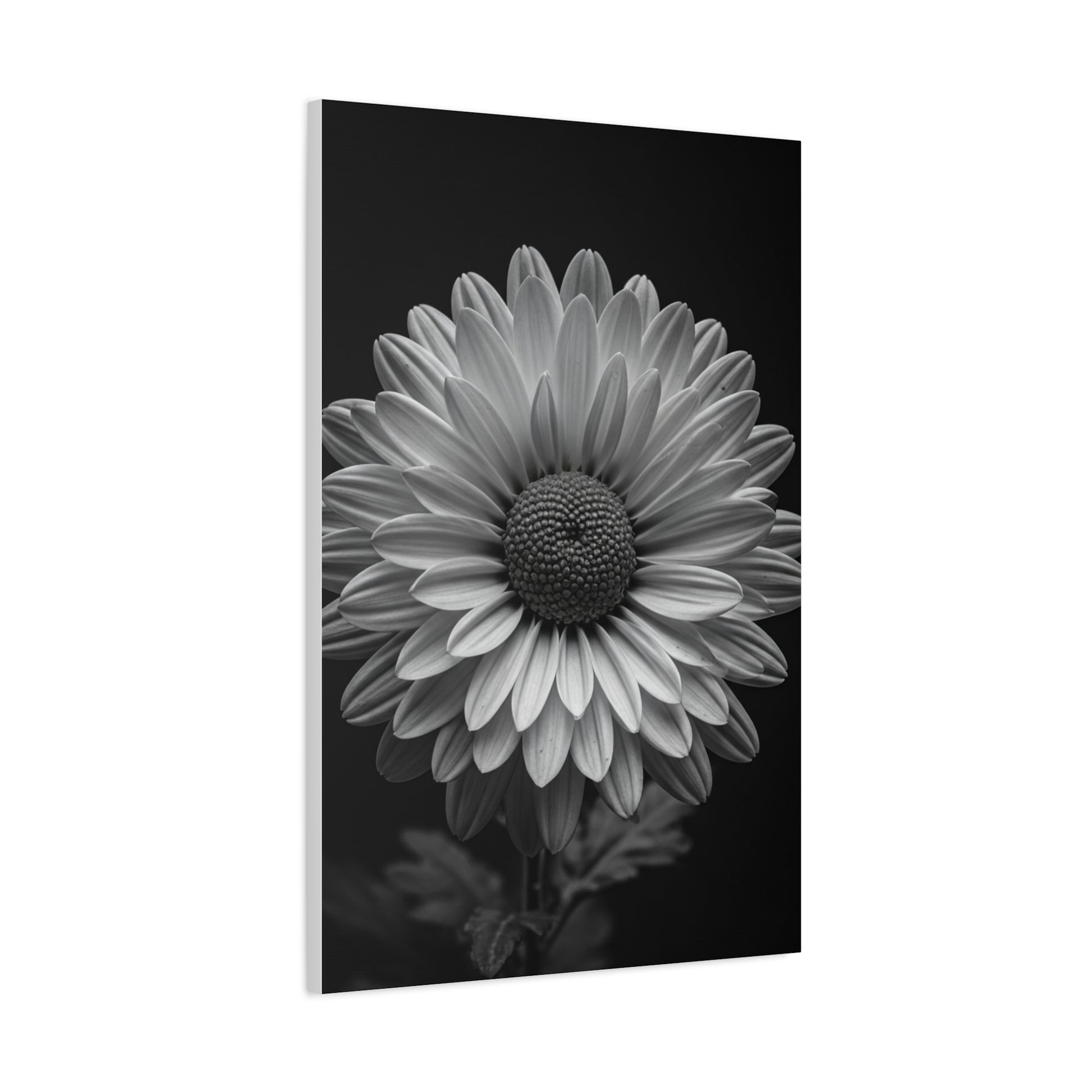 This striking black and white daisy portrait captures the flower in perfect symmetry, with crisp, radiating petals surrounding a richly textured central core. The smooth grayscale gradients highlight every delicate curve and layered detail, creating a sense of depth and sculptural elegance against the dark, moody background. The balanced composition draws the eye directly to the center, making it a powerful yet calming focal point for any space. Ideal for modern living rooms, minimalist bedrooms, or refined office interiors, this timeless floral canvas print adds sophistication, contrast, and understated botanical beauty to your décor.