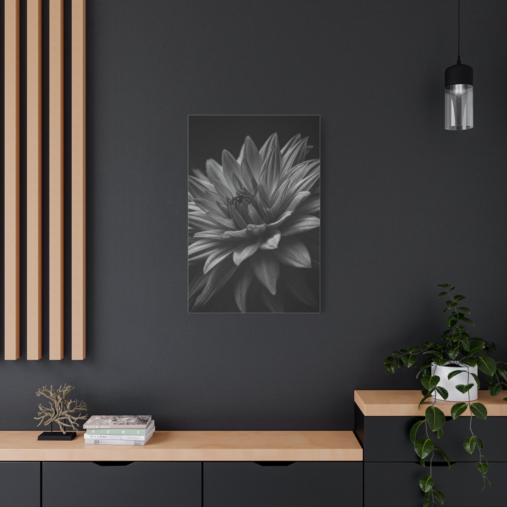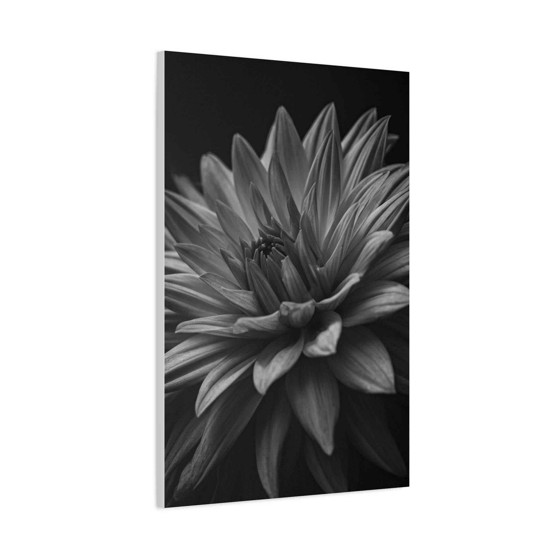 This captivating black and white dahlia captures an intricate layering of petals unfolding toward a shadowed center, creating a sense of depth and quiet intensity. The soft grayscale transitions highlight the delicate curvature and natural symmetry, while the dark backdrop enhances its dramatic presence. Ideal for modern interiors, gallery-style living rooms, or elegant office spaces, this piece brings refined sophistication and timeless floral beauty to any wall.